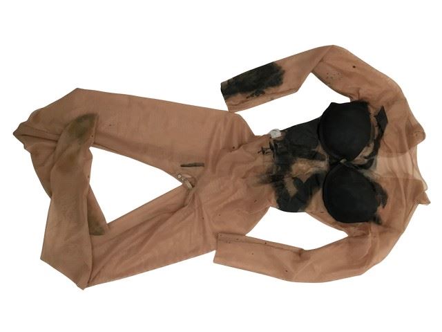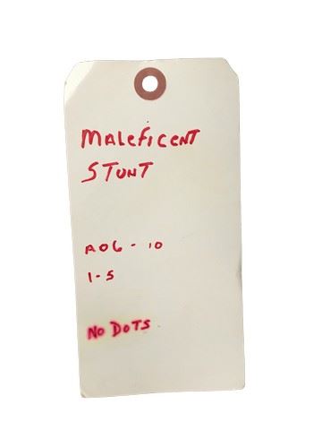 Maleficent (2014) - Maleficent's (Angelina Jolie) test, sheer gold spray painted nude bodysuit with a black bra painted and sewn onto the top black paint decorated the stomach and right arm. Zips up the back. This was from the production but ultimately not used. It was started as part of a design for the bodysuit she wears under her cape and was intended to be used for stunt scenes but was never finished.