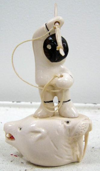 Mammoth ivory carving done by Iglaak of Koyuk 4" tall of hunter standing on a polar bear and walrus head base (114)