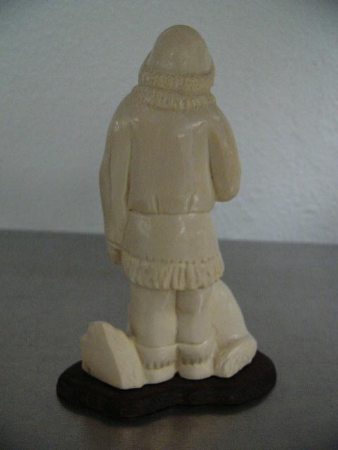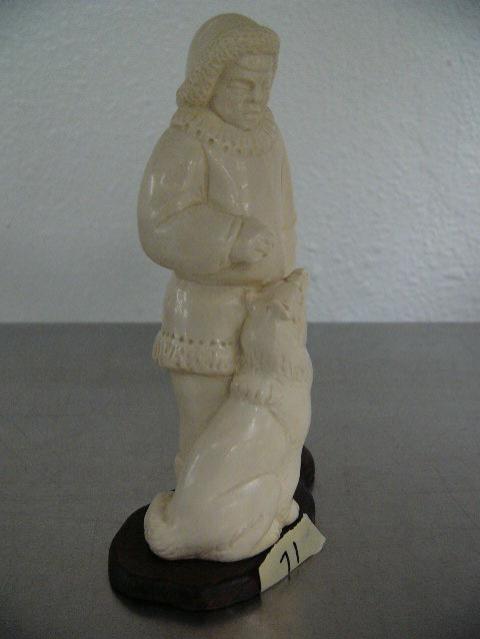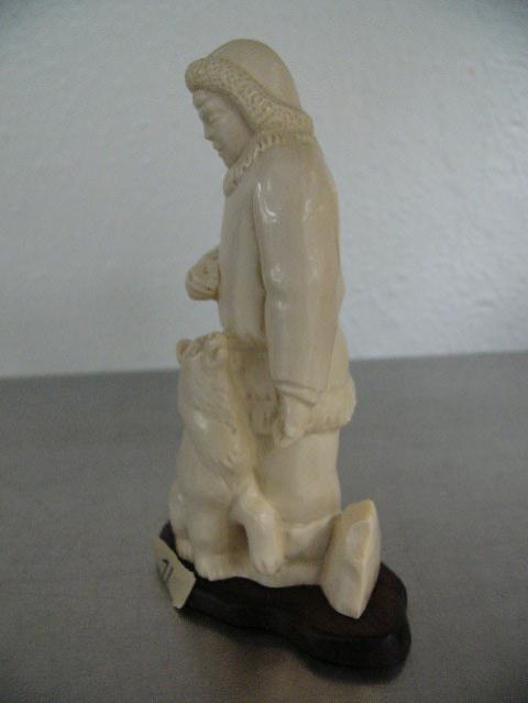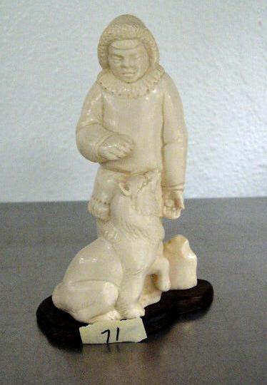 Mammoth ivory carving of Alaskan Native with sled dog on wood base- 5" high- Russian ()