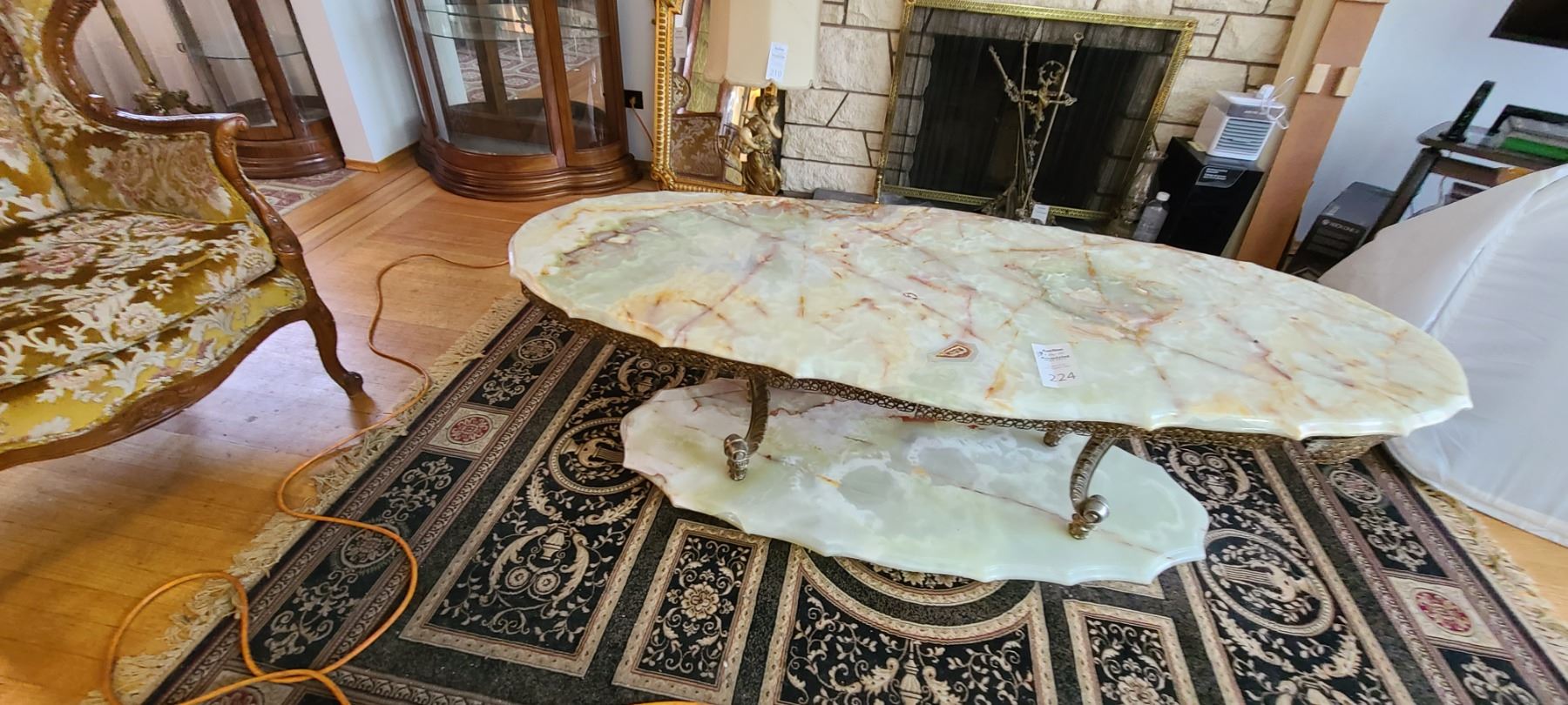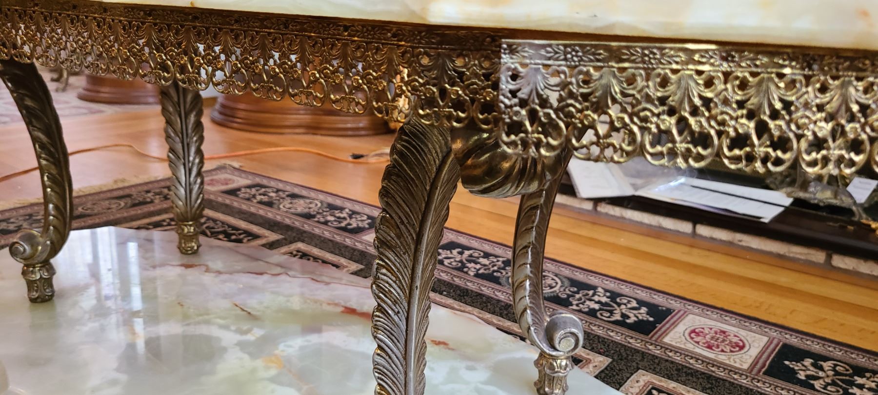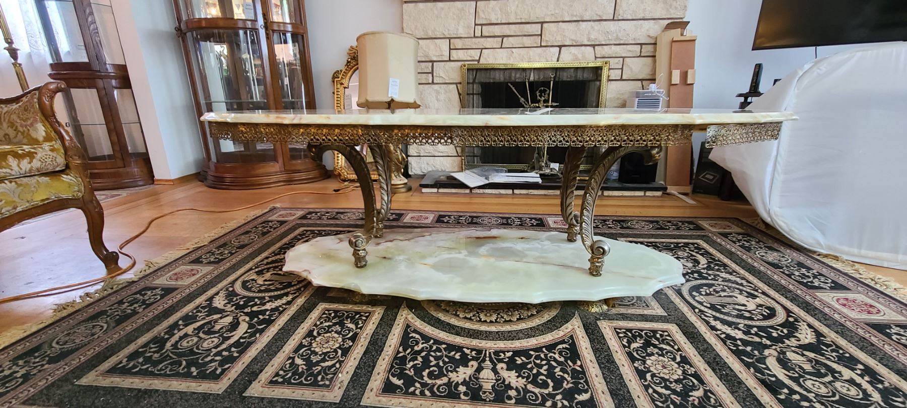 Vintage marble and brass coffee table 59x25x26. Damage noted in pix. Heavy, bring help to carry out