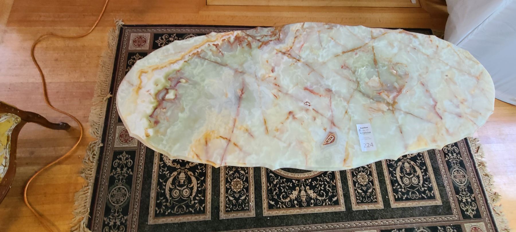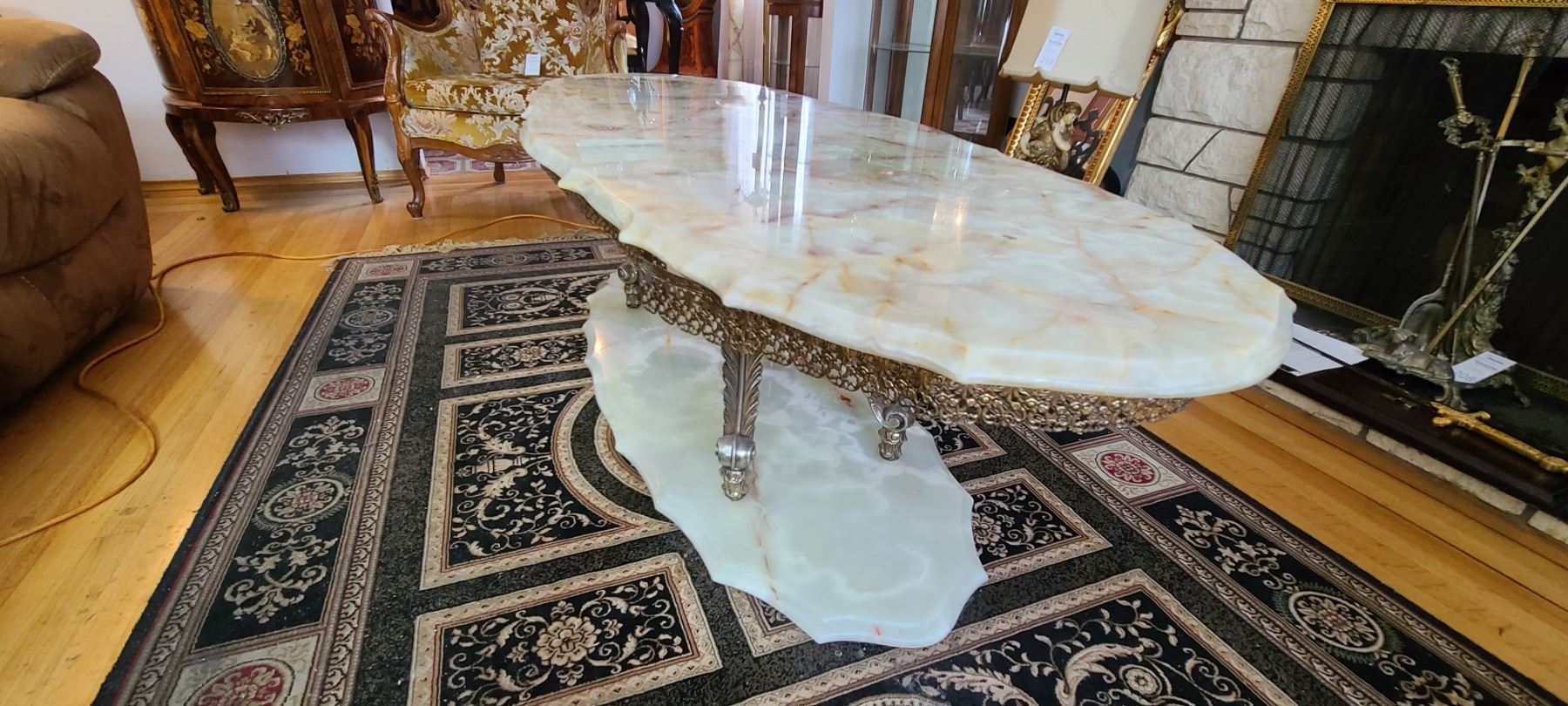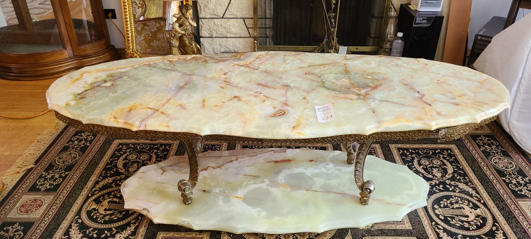 Vintage marble and brass coffee table 59x25x26. Damage noted in pix. Heavy, bring help to carry out