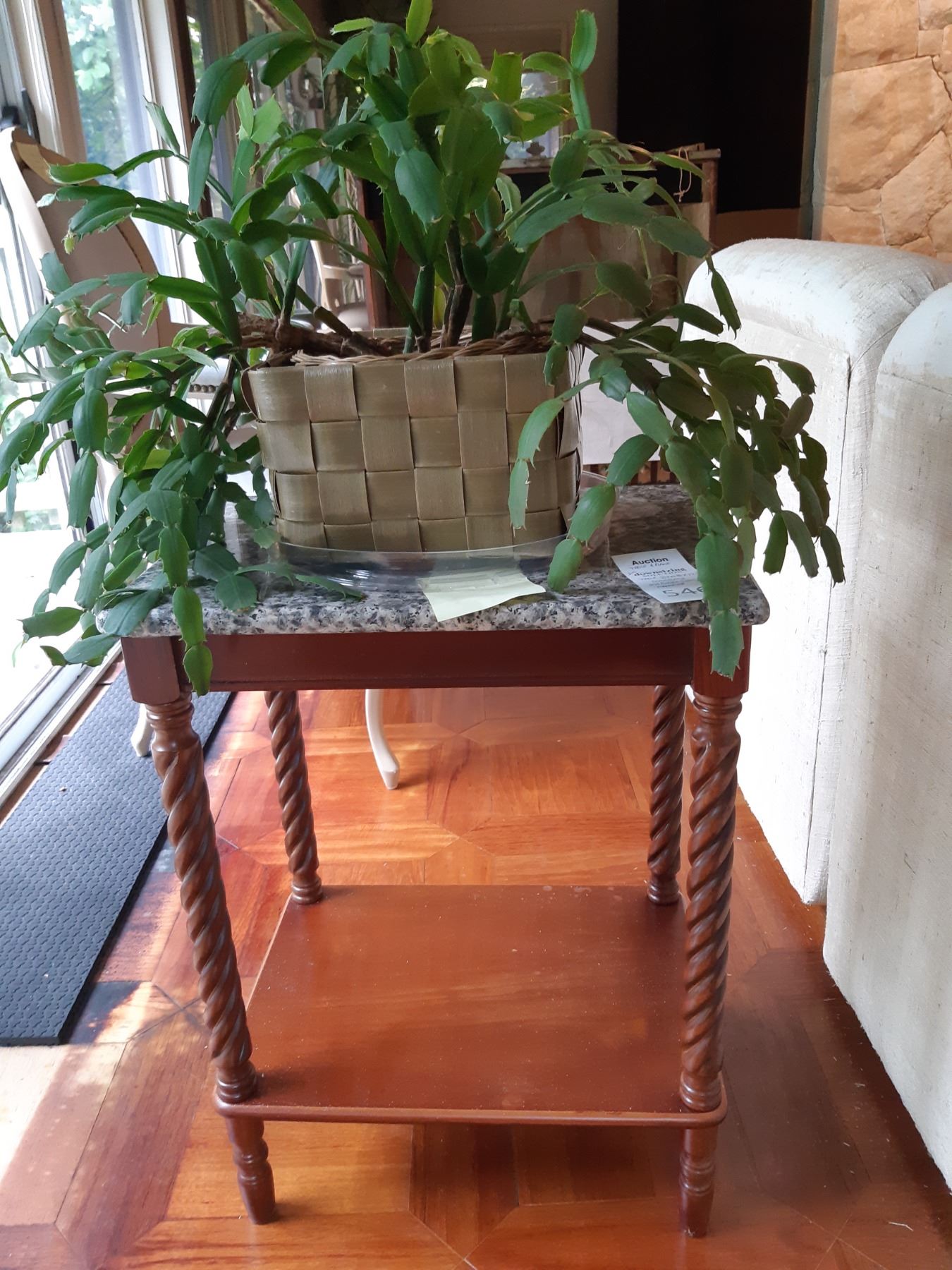 Marble top table with barley twis legs has one shelf below. 24x18x12. Note scratches. Potted plant. Pickup at 11 am