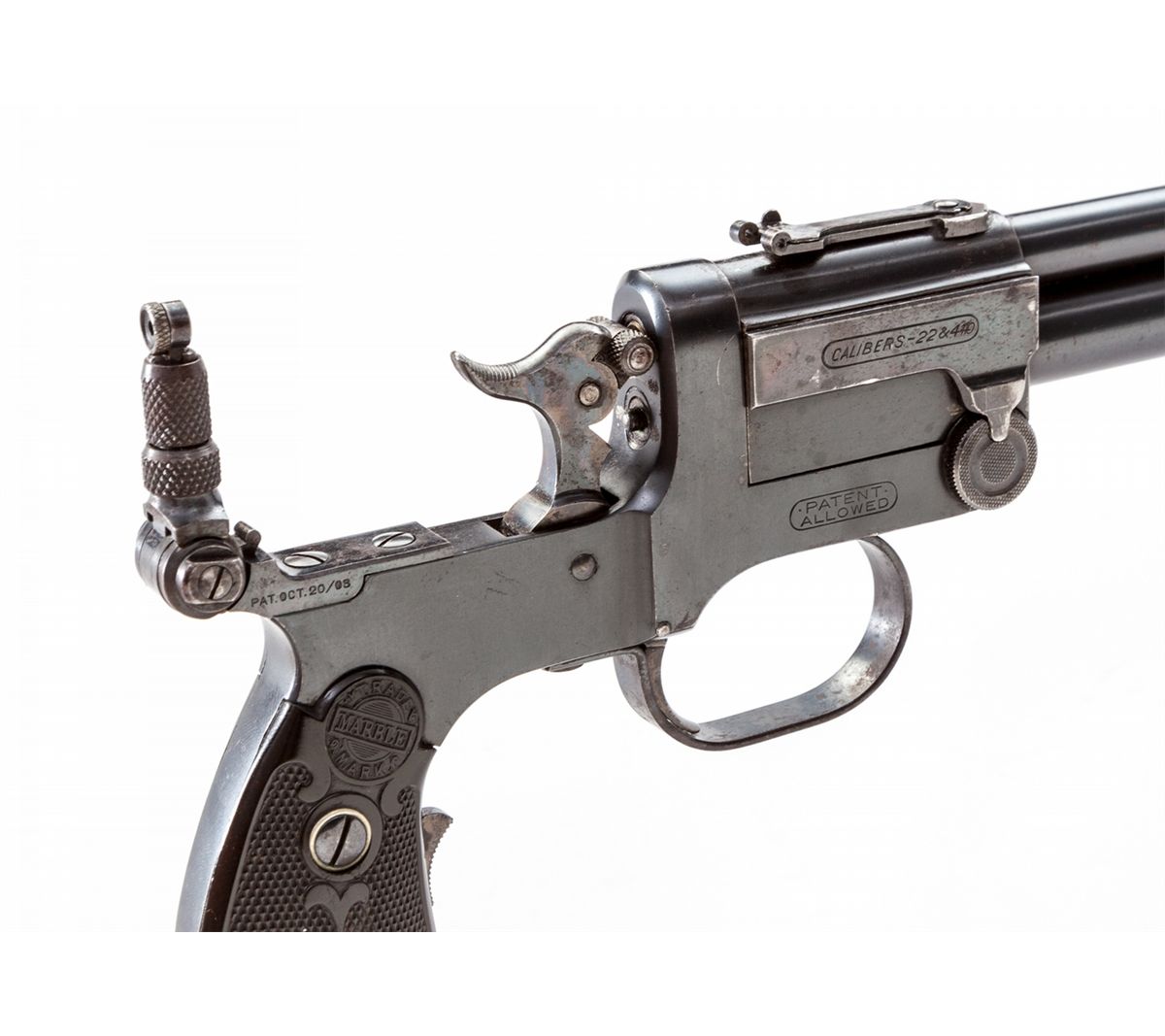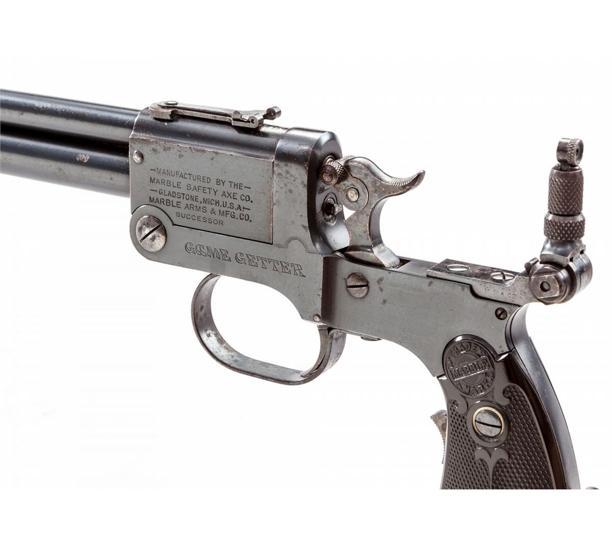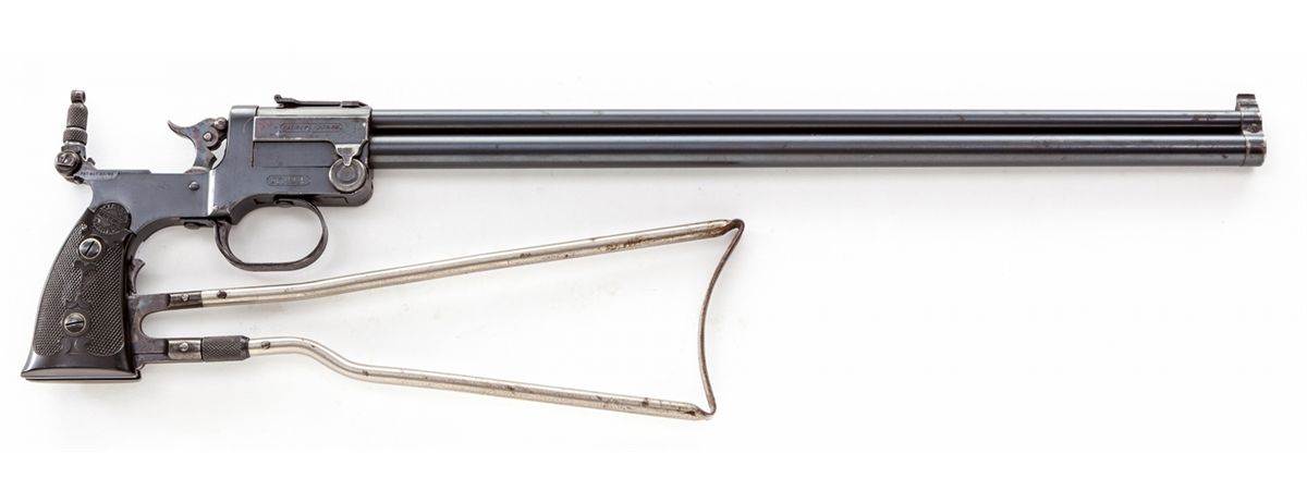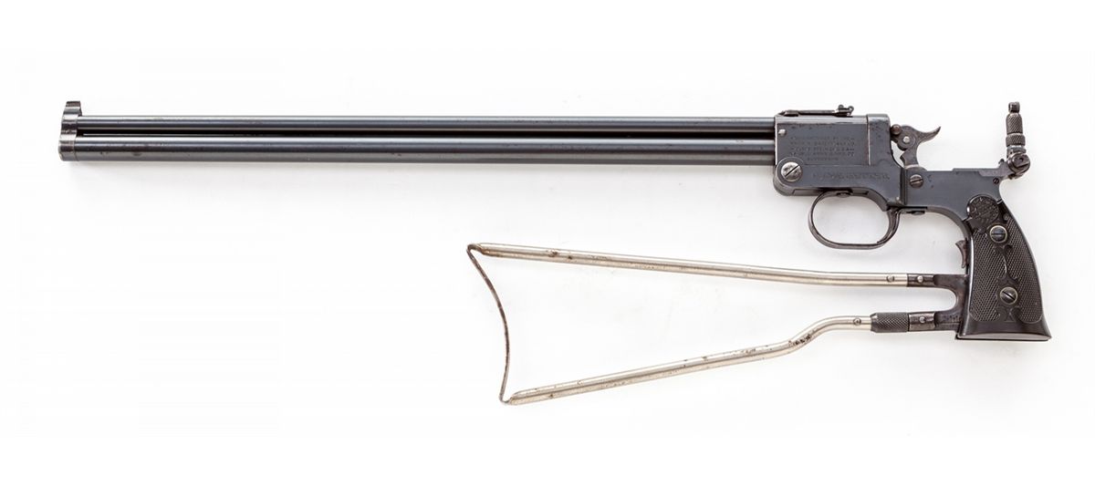 Marbles Type 1 Gamegetter Combination Folding Stock Pistol, #8532, .22/.410 ga., 18'' barrel, blue finish, early black hard rubber grips with Marbles logo, and tubular folding stock. Condition is excellent with light wear at muzzle and minor spotting to finish. Tang sight is present. Est.: $1,800-$2,400. (C&R) (Ernest A. Bryant III estate)