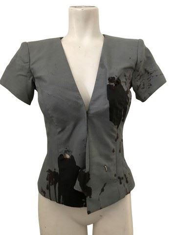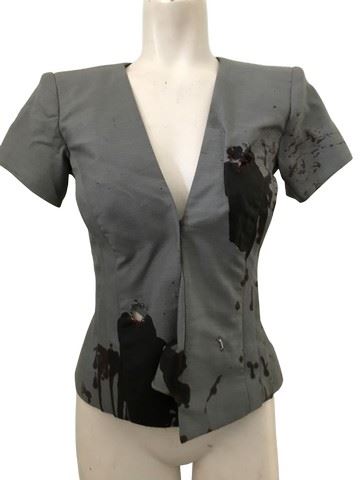 Marvel Agents of S.H.I.E.L.D. season 3 episode 18 (2016) - The Singularity episode - Anon's (Camille De Pazzis) custom-made bloody with bullet holes grey tunic vest, top with short sleeves.