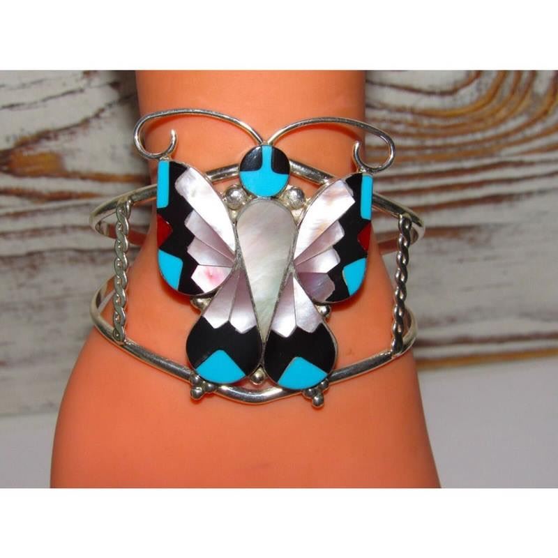 Massive Zuni Inlay Butterfly Cuff Bracelet Sterling Silver Alison Dishta