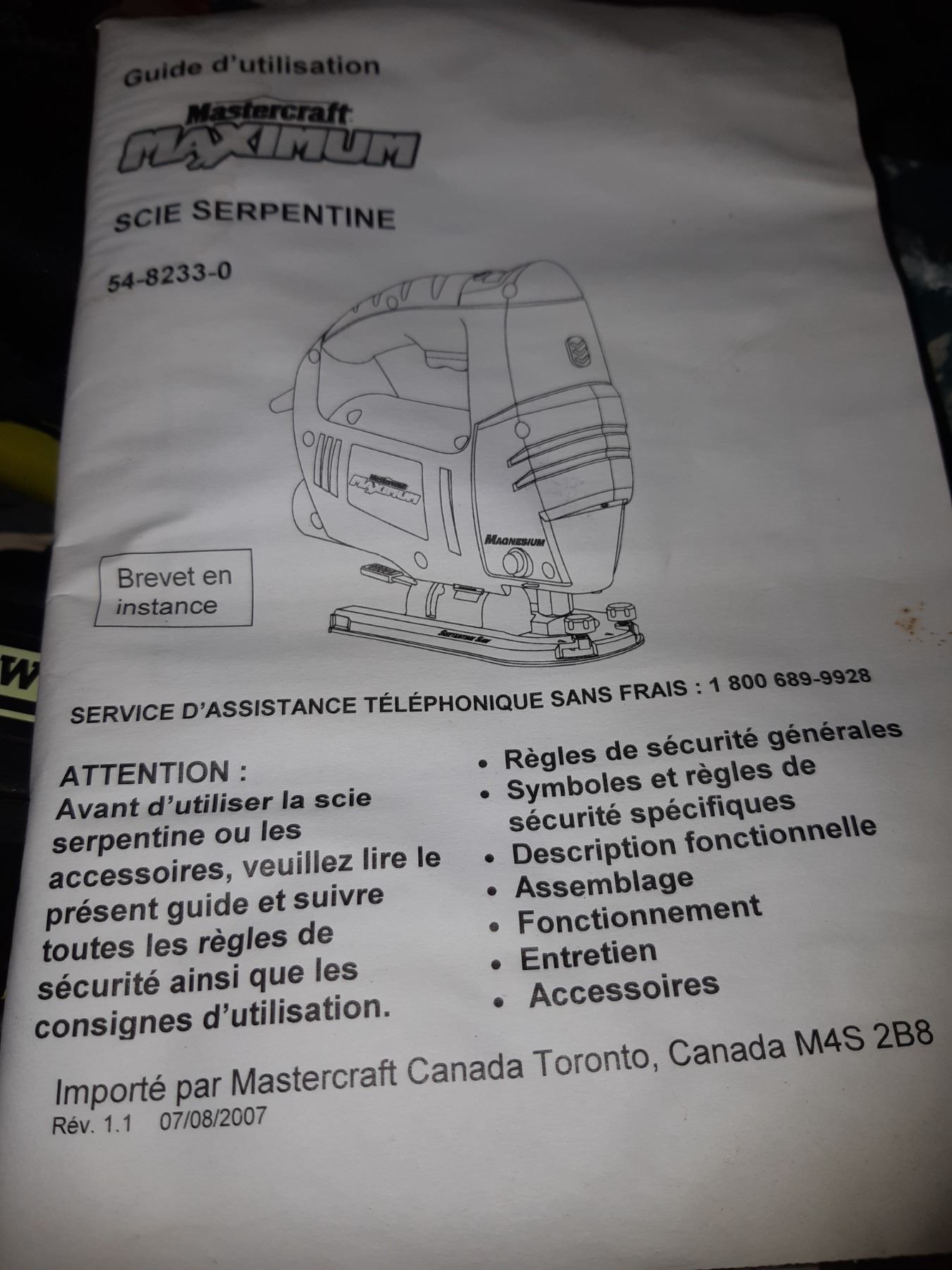 Mastercraft serpenrine saw, model 54-8233-0, with attachments. Pickup at 9 - 11 am