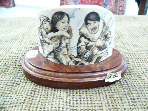 Mastodon ivory mounted on wood scrimshawed of alaska native family, very well done - 5" wide, 3" high (178)
