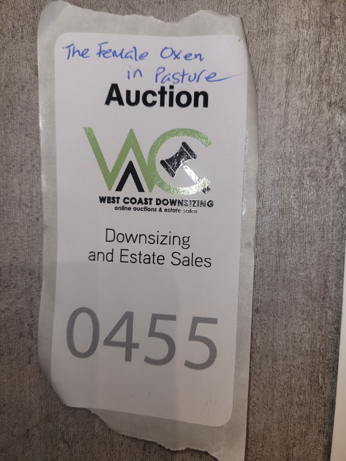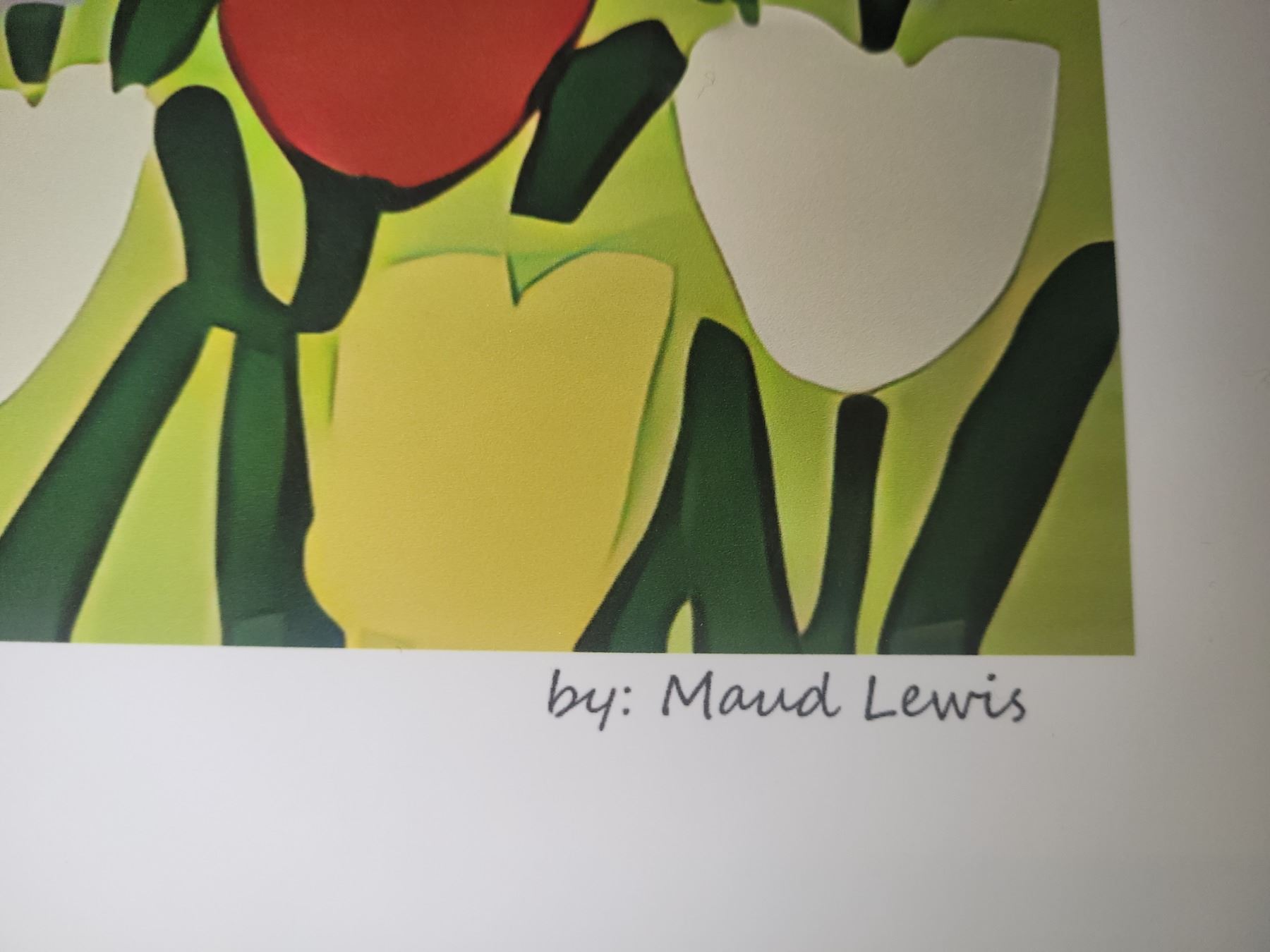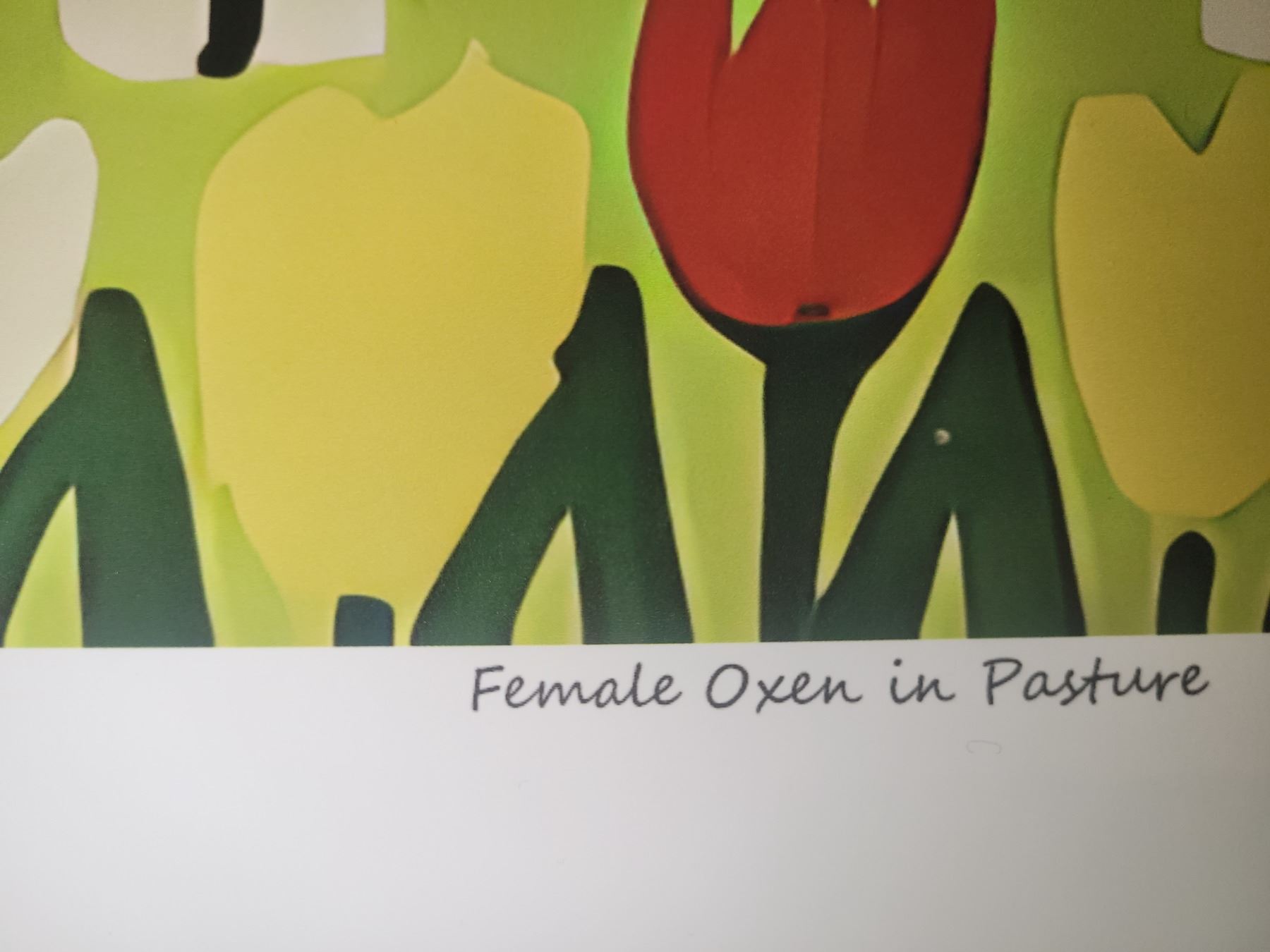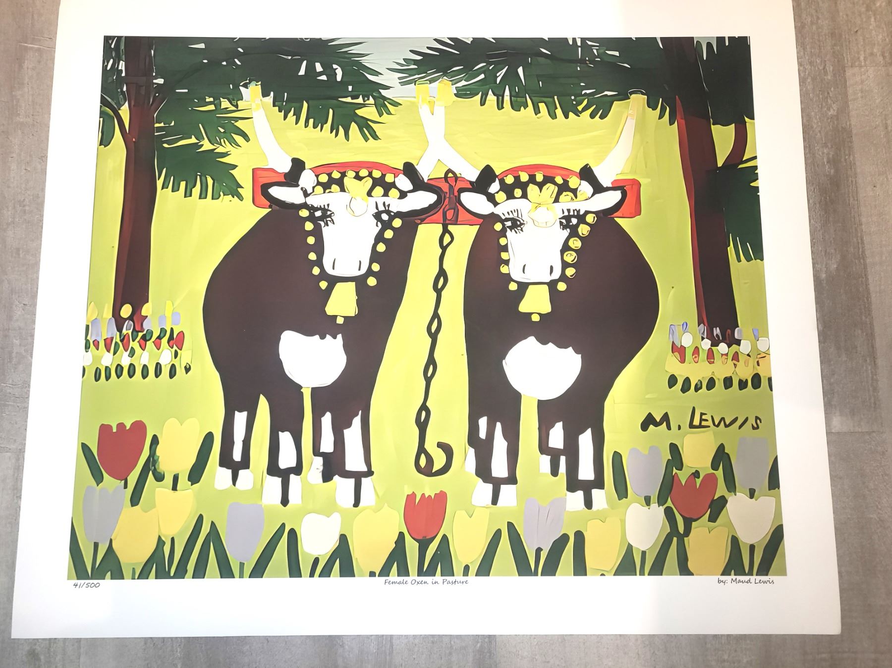 Nova Scotia Folk Artist Maud Lewis, Giclee Limited Edition Numbered , " Female Oxen in Pasture" 41/500. size 20x24. Pickup at 9 am