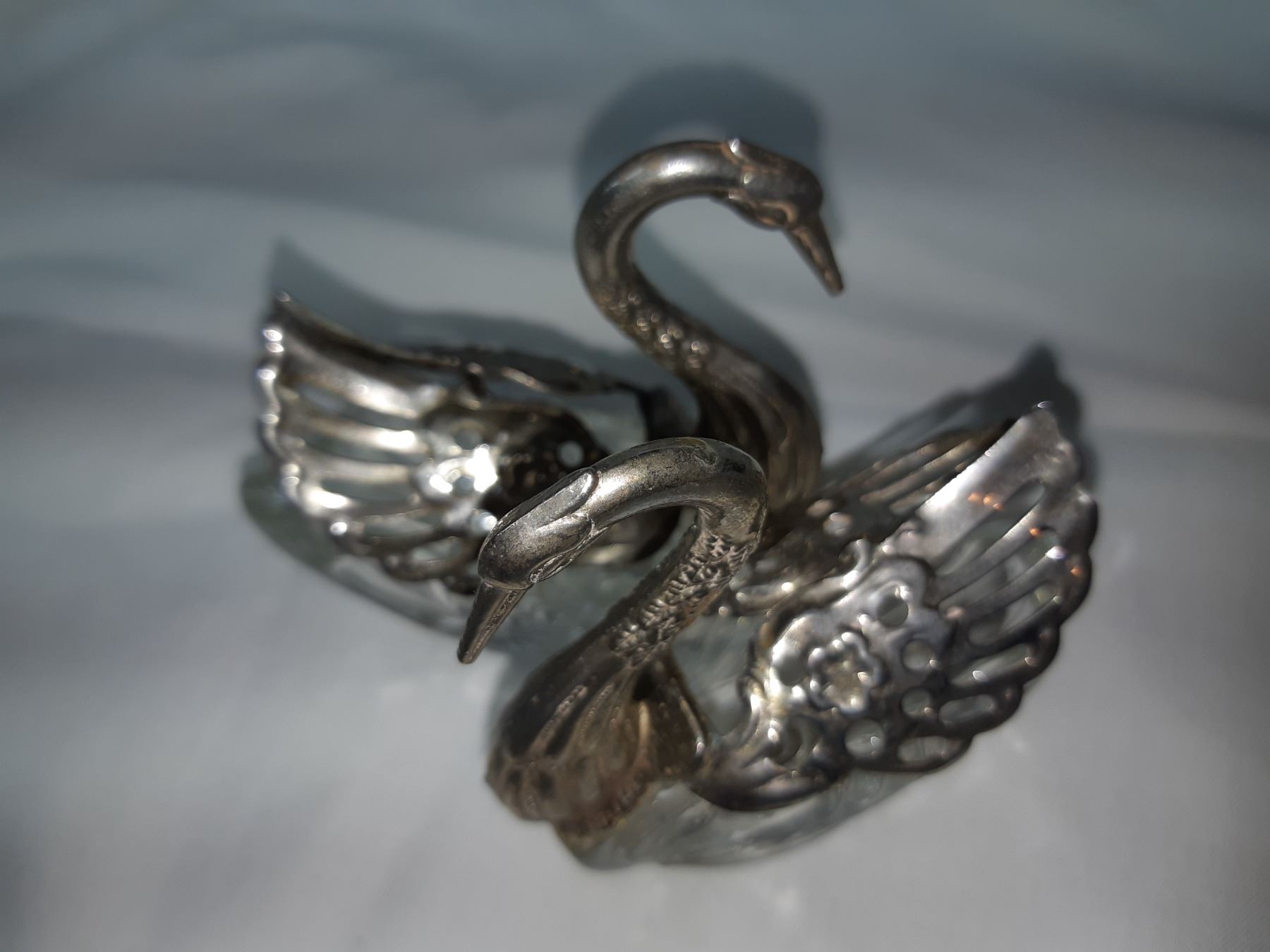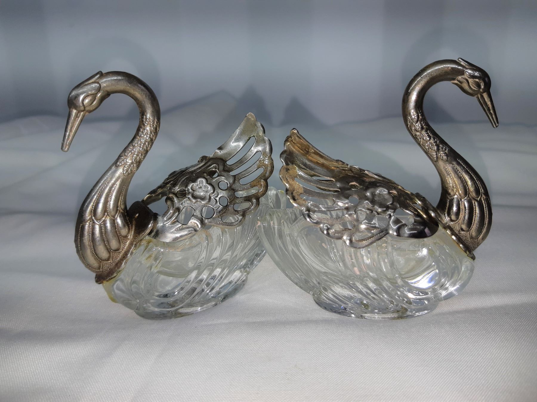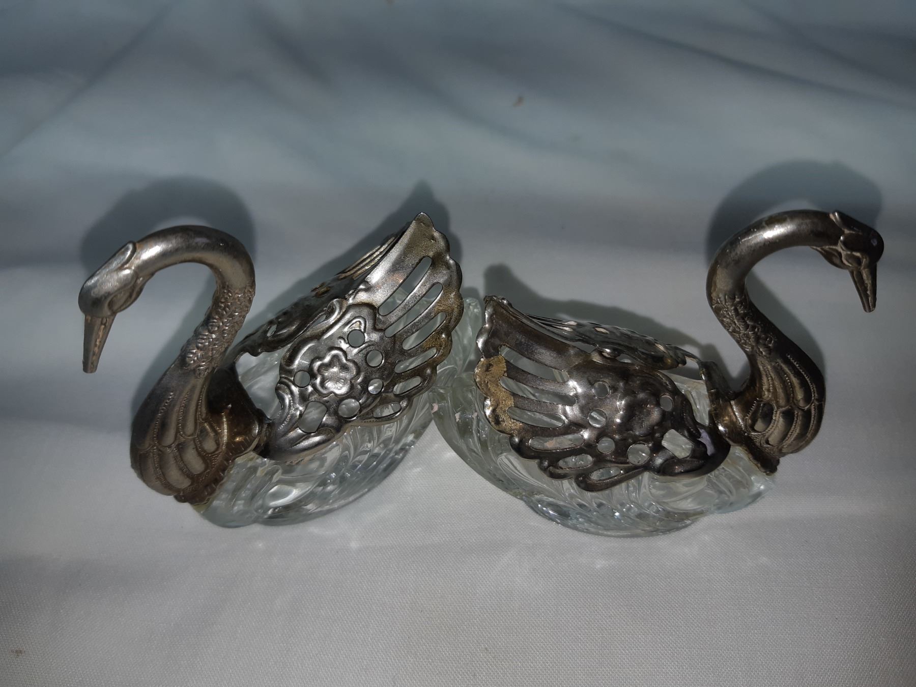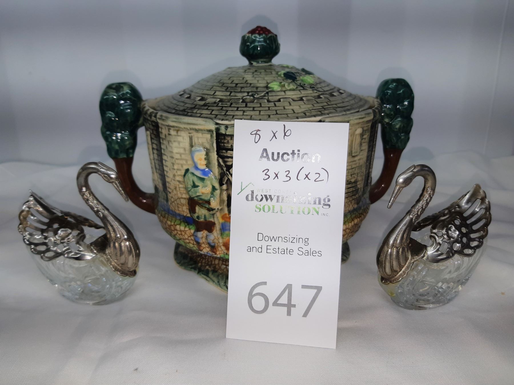 Japanese Handpainted circa 1900 doubled handled, lidded container see fissure cracks with age on bottom. 2 swans 3" cut glass with EP zink steel filigree swan tops Pickup at 9 am