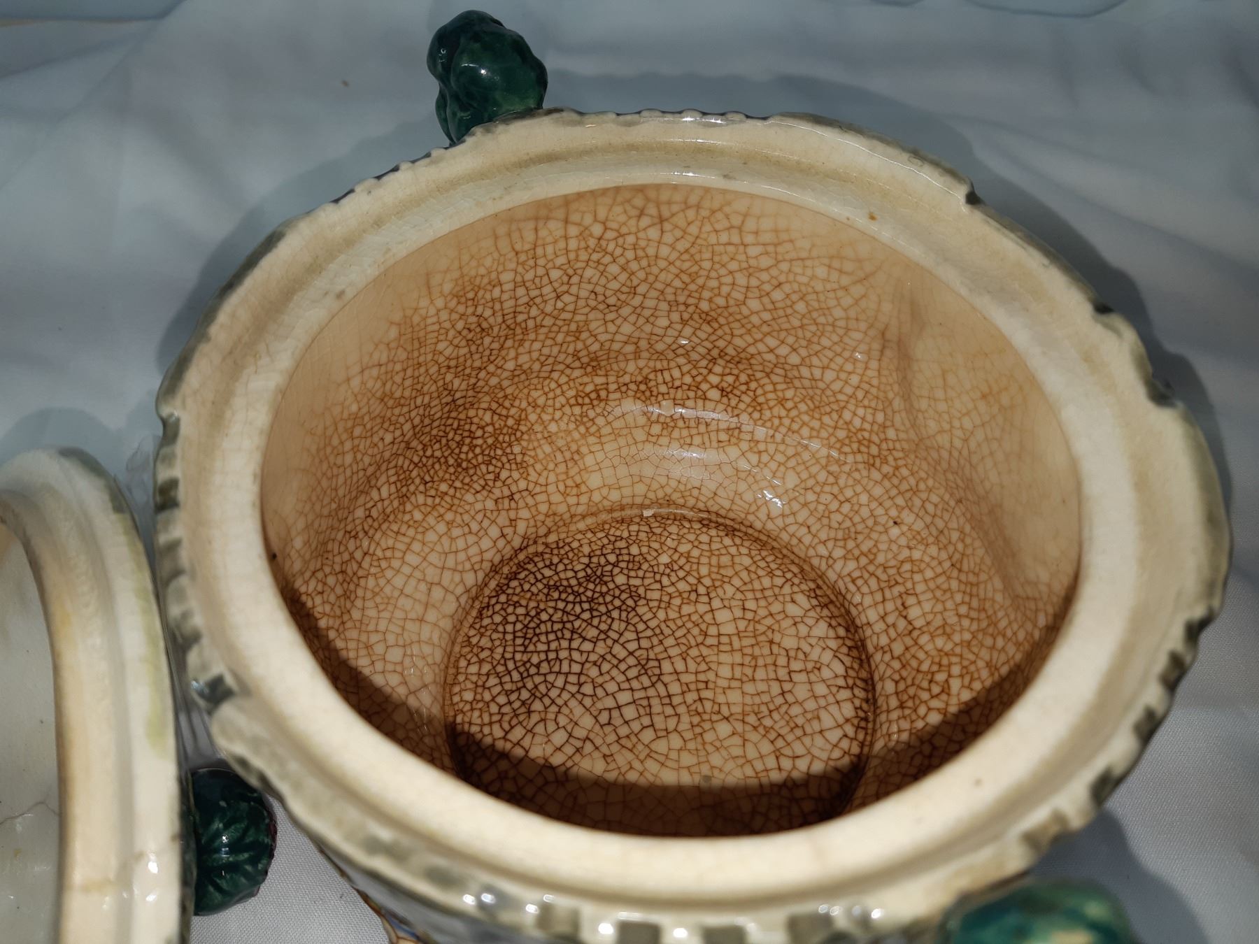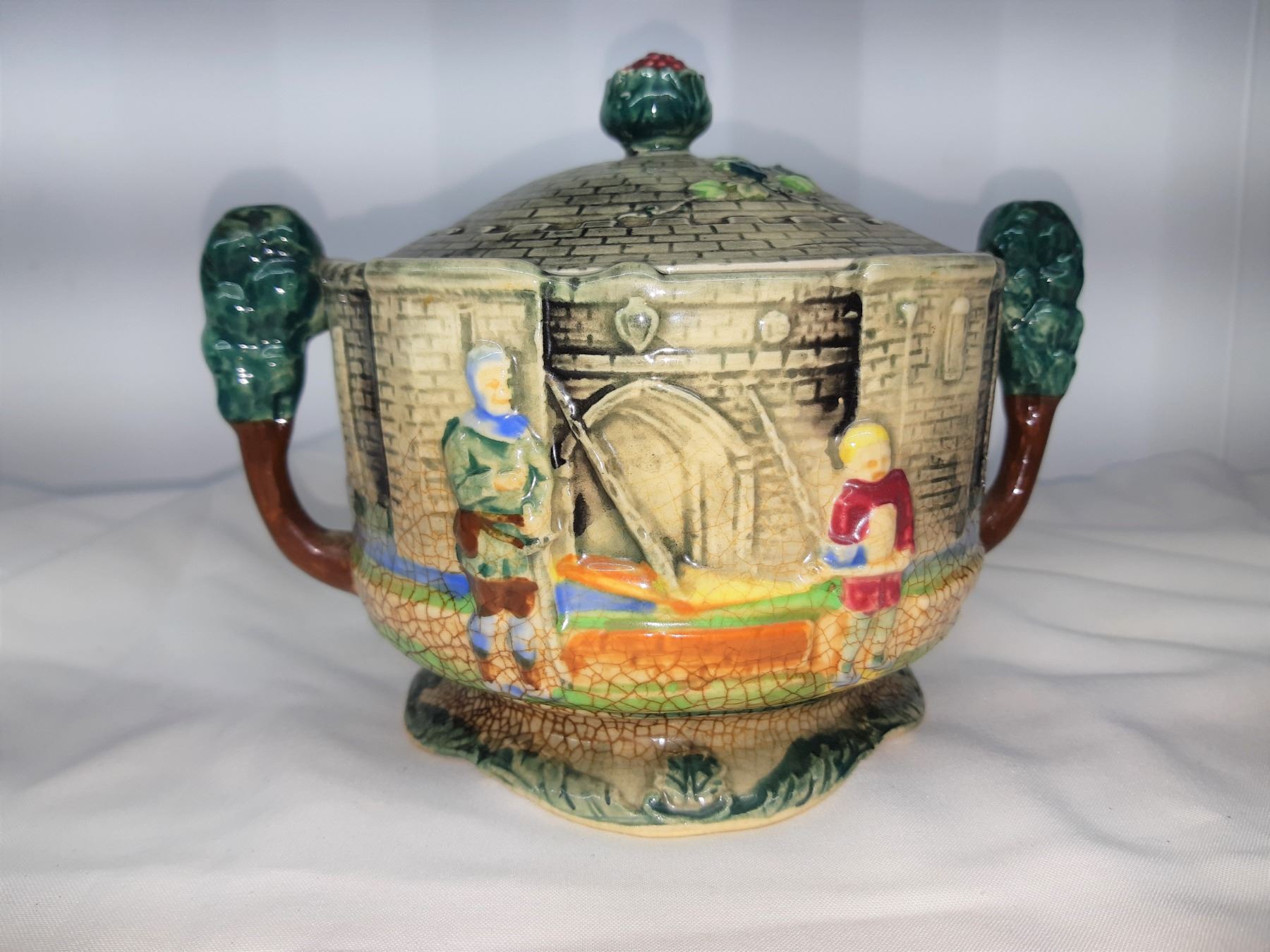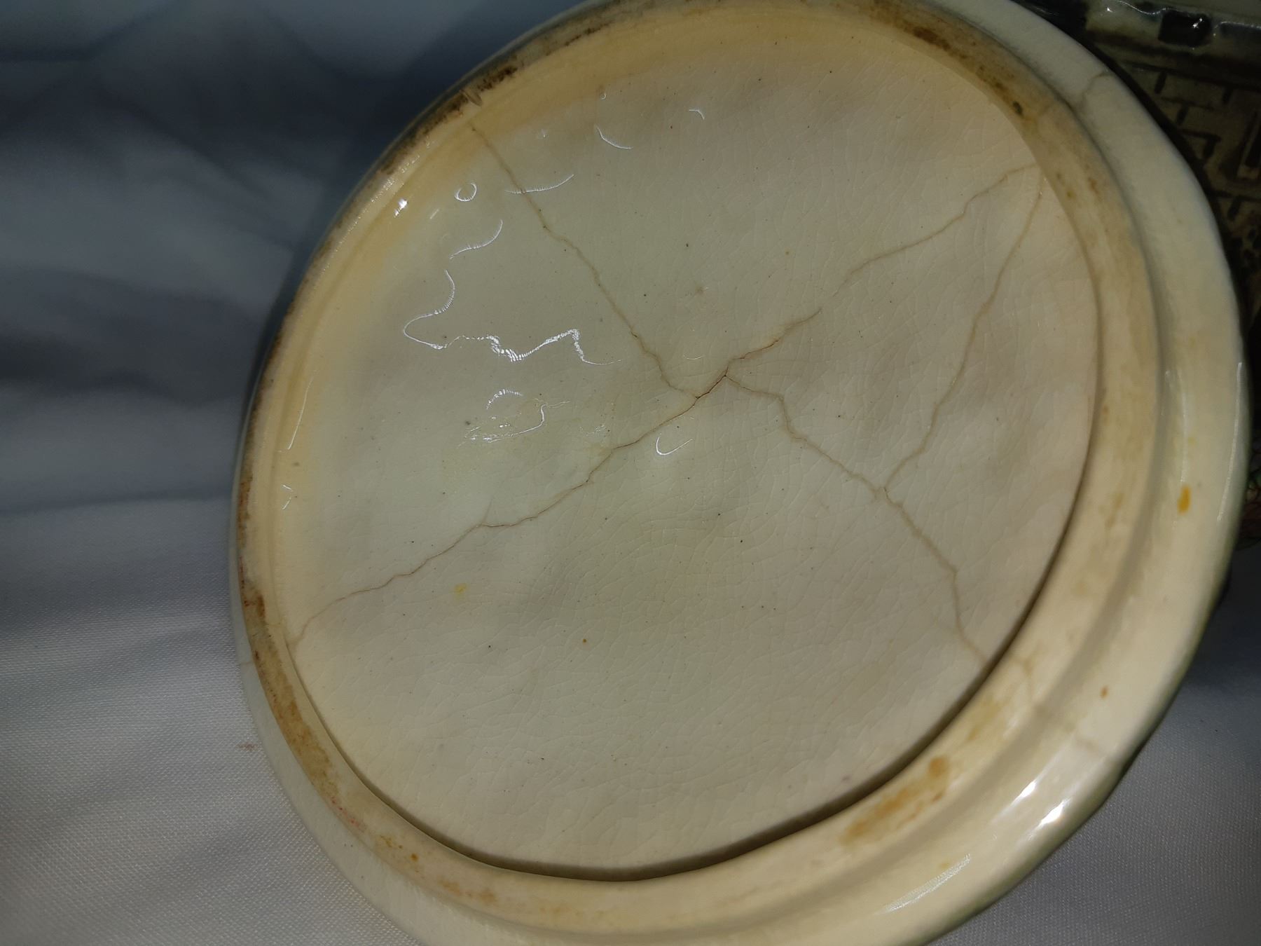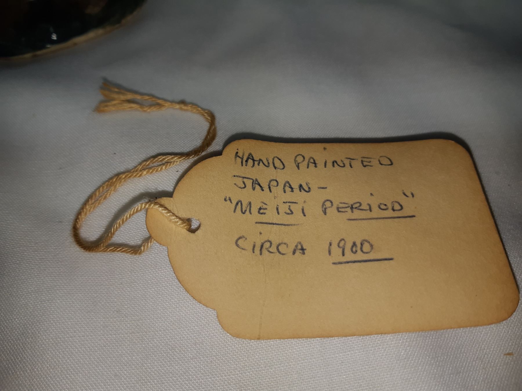 Japanese Handpainted circa 1900 doubled handled, lidded container see fissure cracks with age on bottom. 2 swans 3" cut glass with EP zink steel filigree swan tops Pickup at 9 am