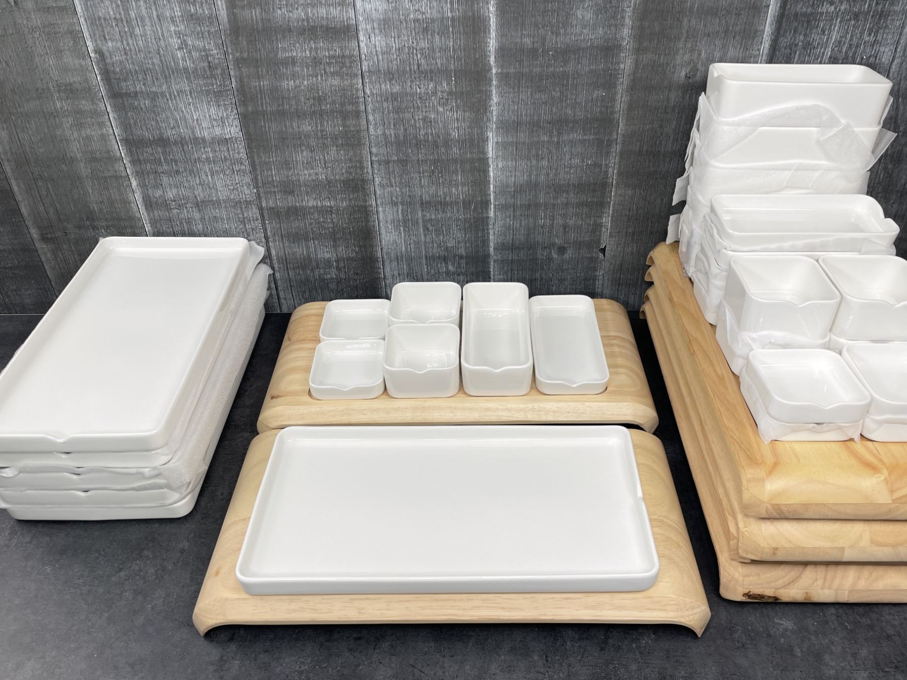 [New,] Square 1.5oz Bowls (Arcoroc L9548 x 6,) Square 4.25oz Bowls (Arcoroc L9556 x 6,) 12-3/8" x 6-1/4" Platters (Arcoroc L9558 x 6,) Rectangular 9oz Bowls (Arcoroc L9561 x 6,) 5-7/8" x 2-3/4" Rectangular 3oz Bowls (Arcoroc L9562 x 6,) 15-1/4" x 7-3/8" Wooden Serving Trays (Arcoroc L9585 x 6)