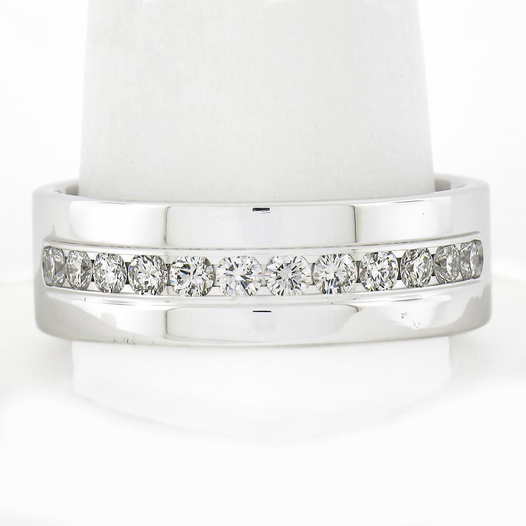 A solid 14k white gold band ring, with 12 round cut natural diamonds (F/G - VS1/VS2 ; 0.60ctw). The ring is size 12.5, weighs a total of 12.45 grams, and measures 7.9mm wide.