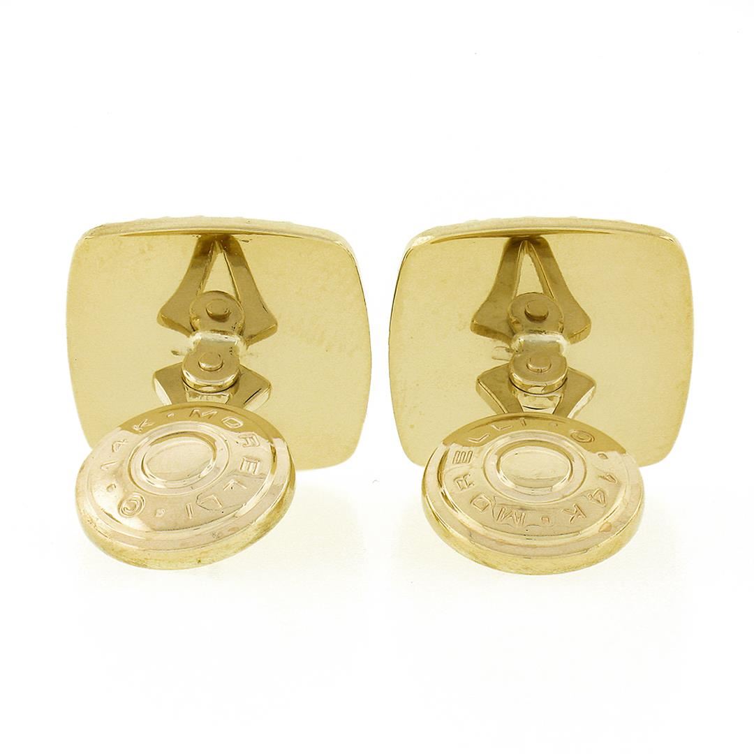 A solid 14k yellow gold cufflinks by Paul Morelli, with 2 cushion cabochon cut natural hematites (10.40x8.40mm). These cuff links have a swivel design with a clearance of 14.9mm, weigh a total of 10.14 grams, and the front panels measure 18.40x16.50mm.