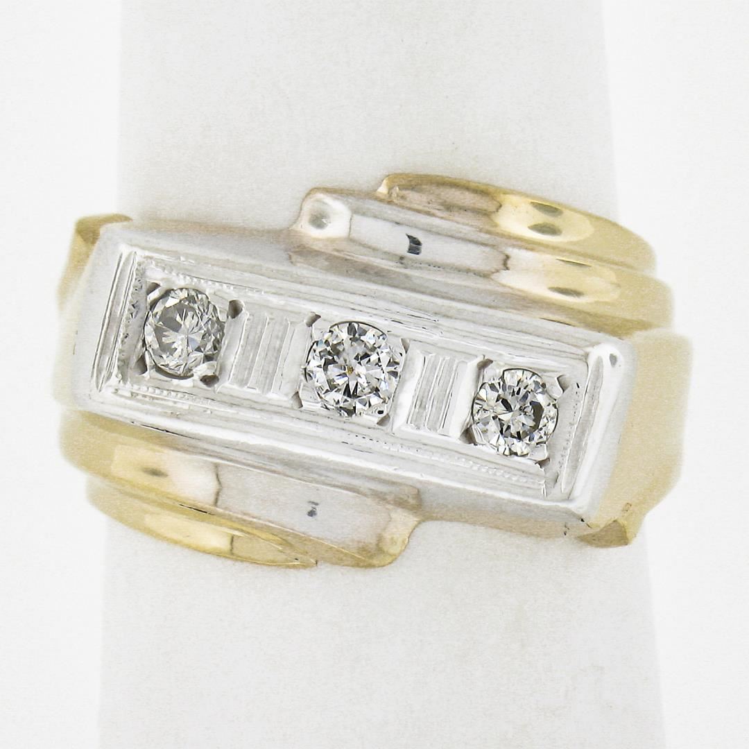A vintage solid 14k yellow & white gold men's bypass band ring, with 3 round & old transitional cut natural diamonds ( J-L - SI1-I1 ; 0.25ctw). The ring is size 7.0, weighs a total of 6.63 grams, and measures 12.9mm wide.