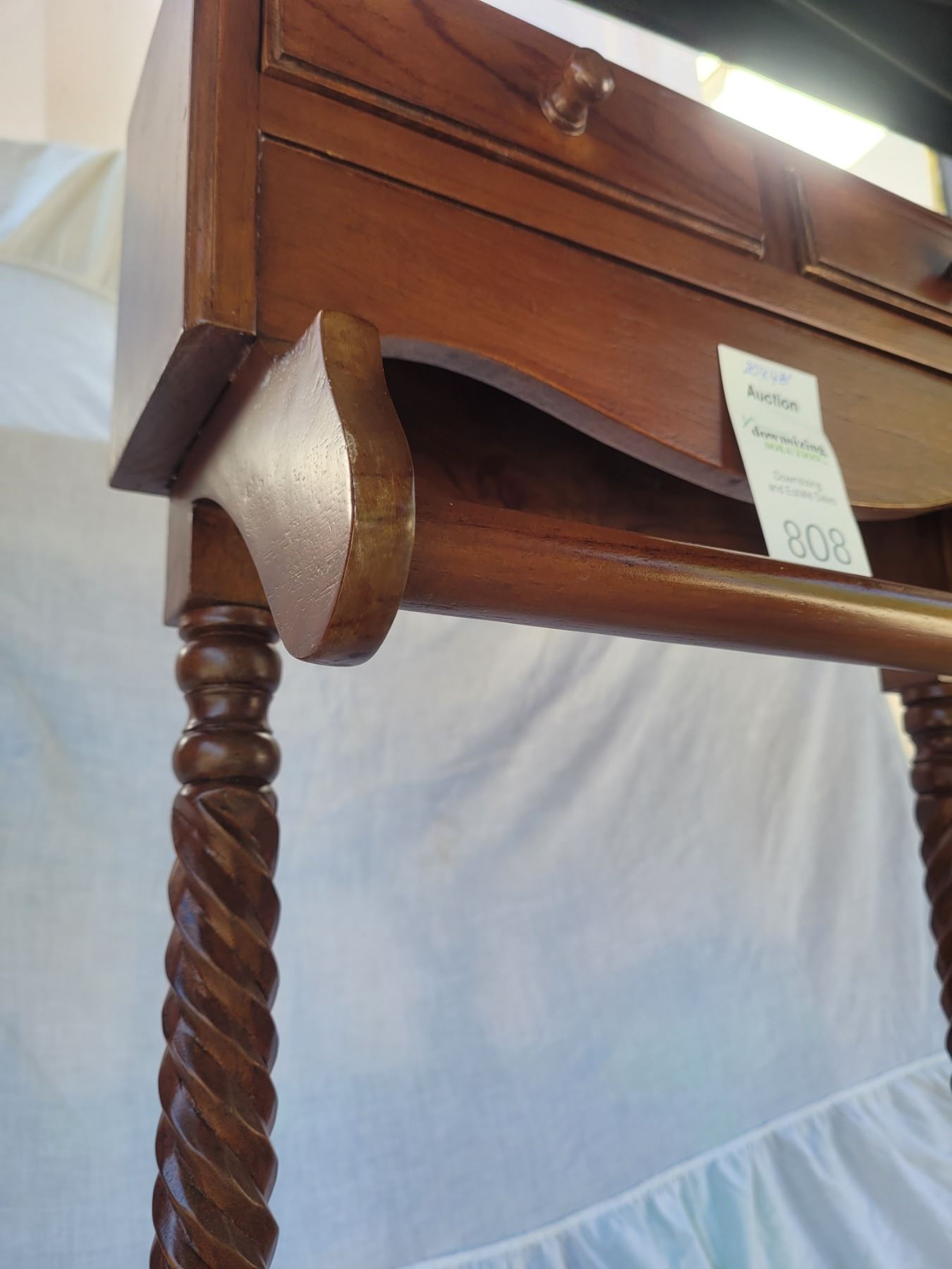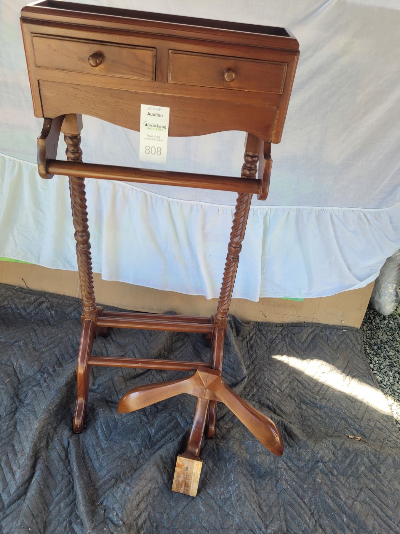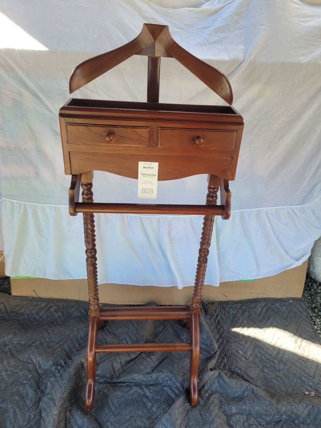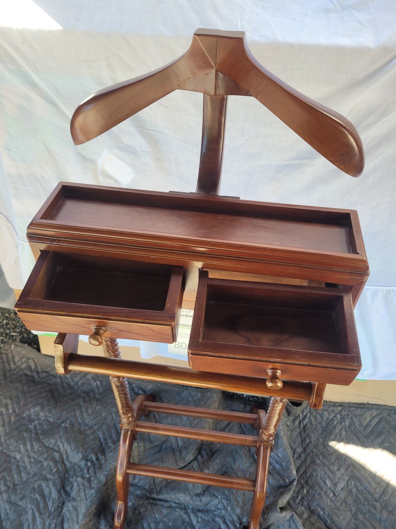 Gentleman's valet with top tray, 2 drawers. Coat hanger can be removed. Has barley twist legs. 20x48". Pickup at 10 am
