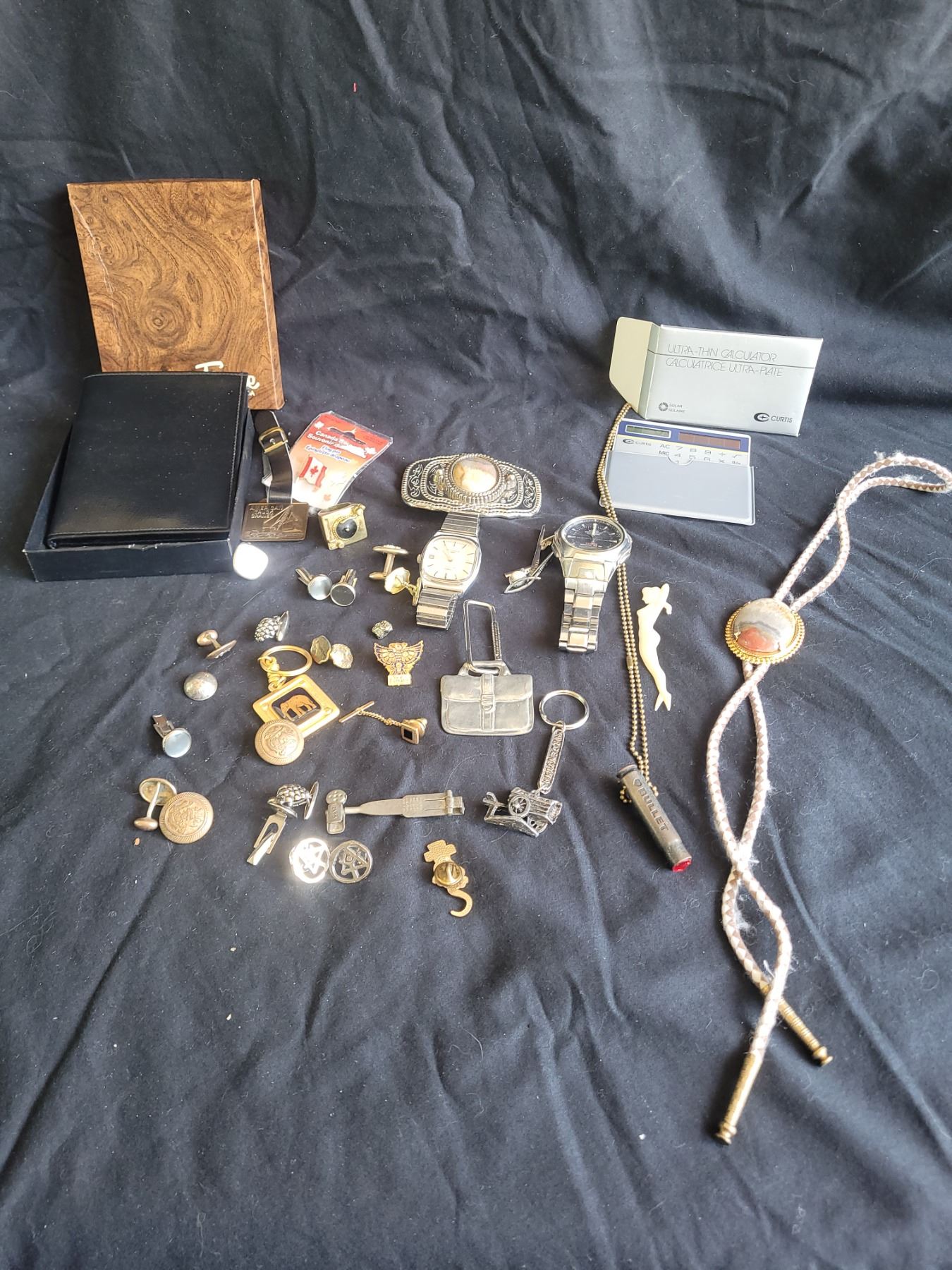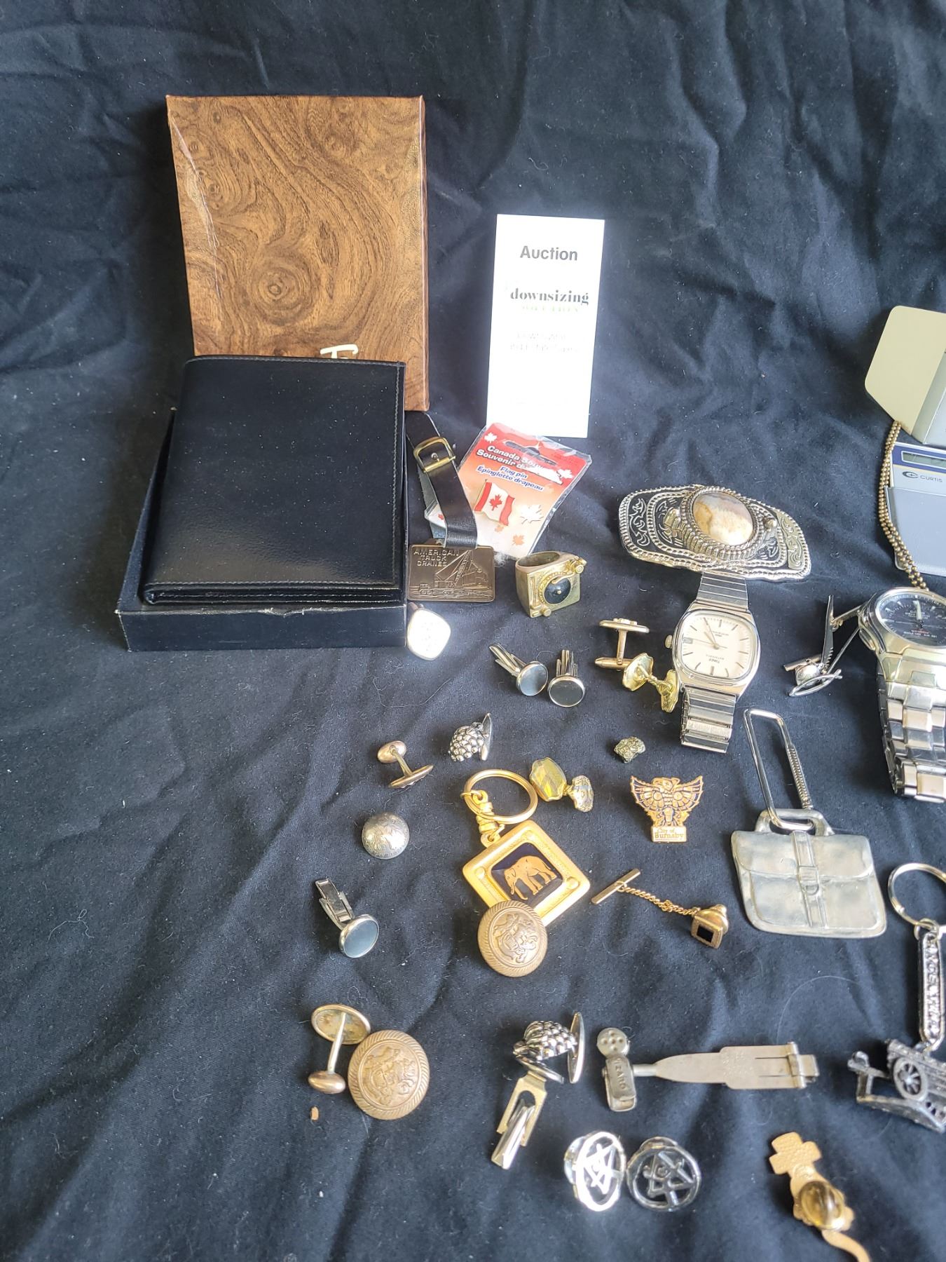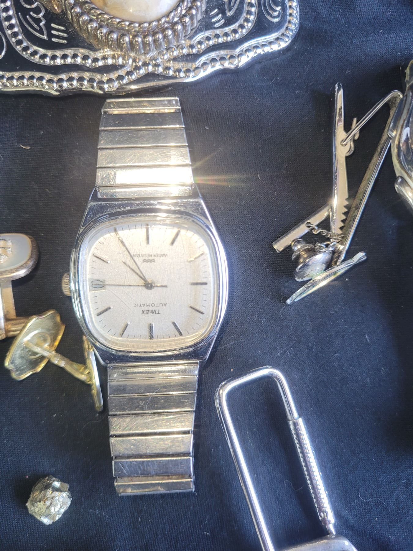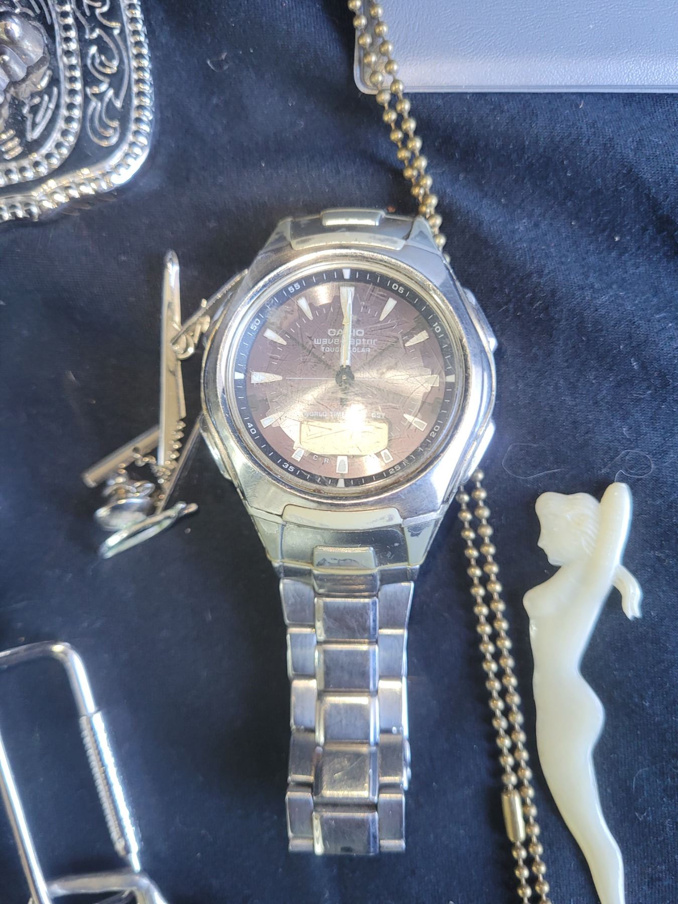 New leather Ferre wallet, Casio & Timex watches, BOLLO WITH JASPER STONE, BELT BUCKLE WITH JASPER STONE, cufflinks, and bling. Pickup at 9 am