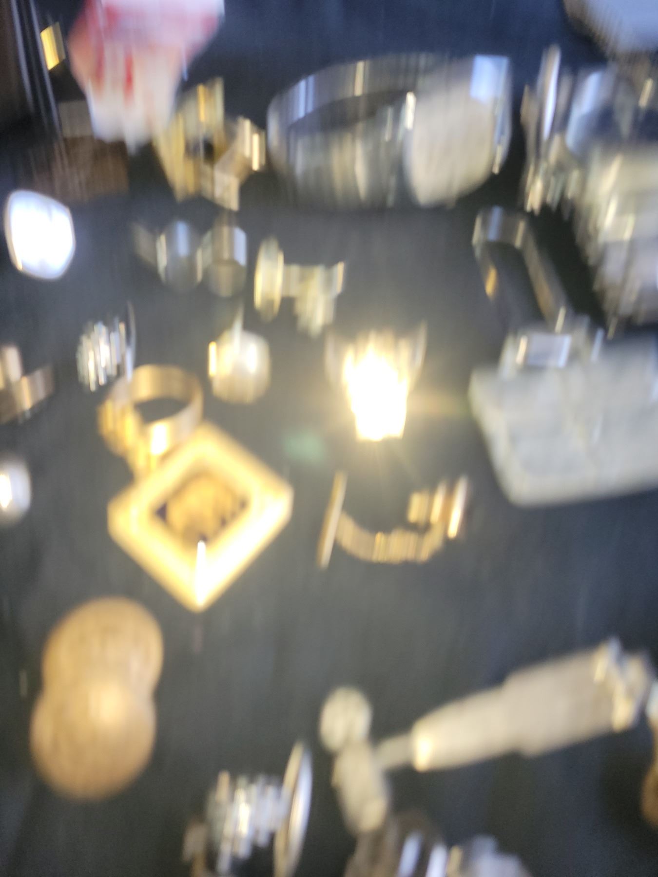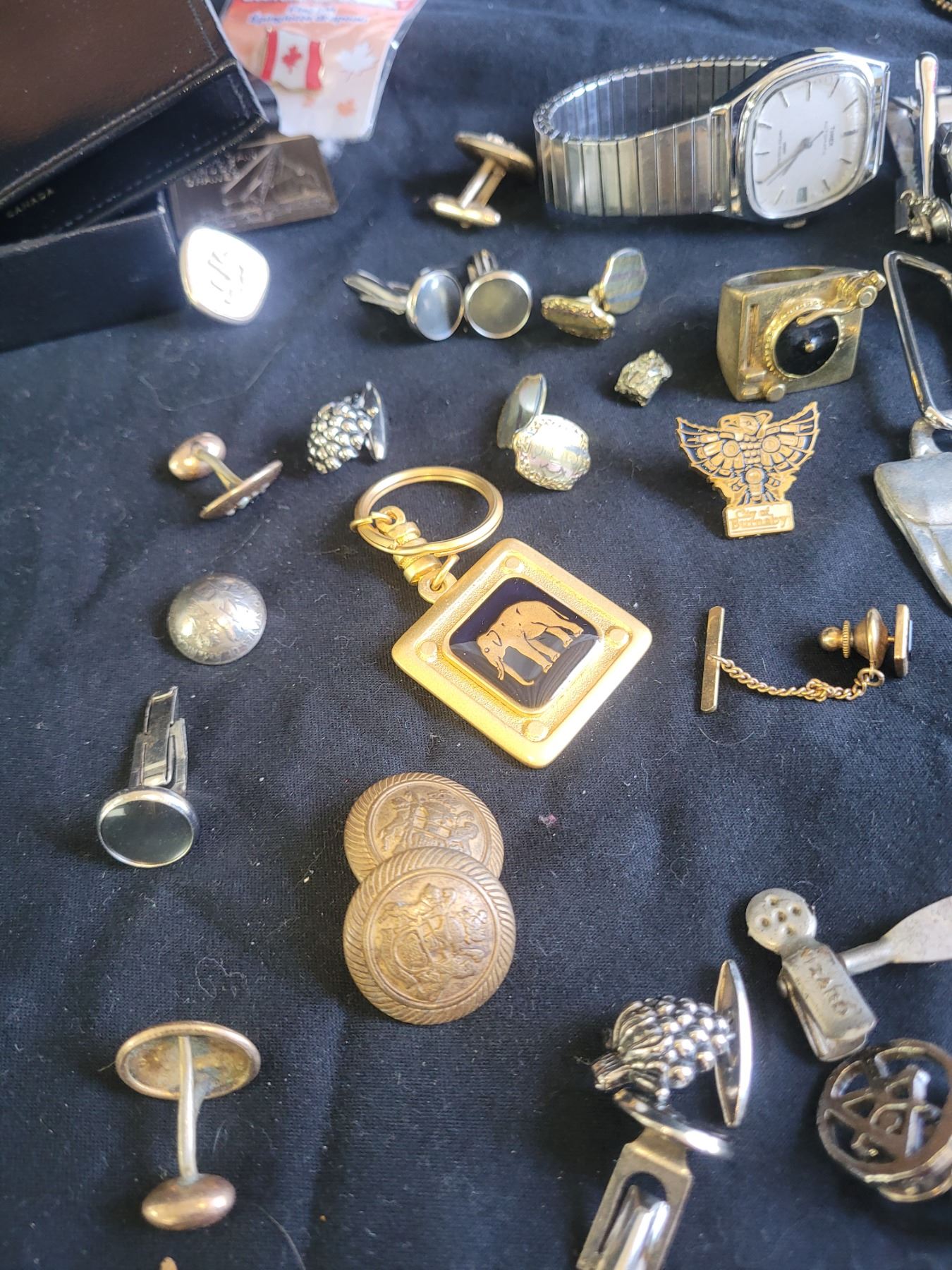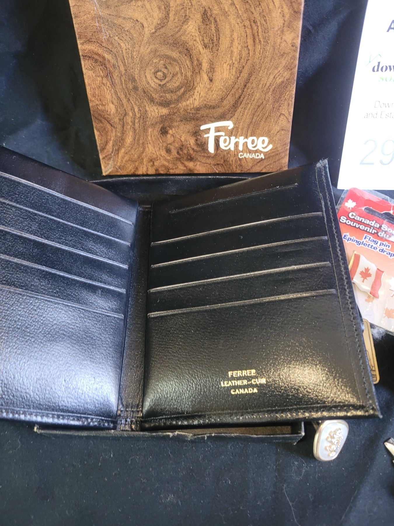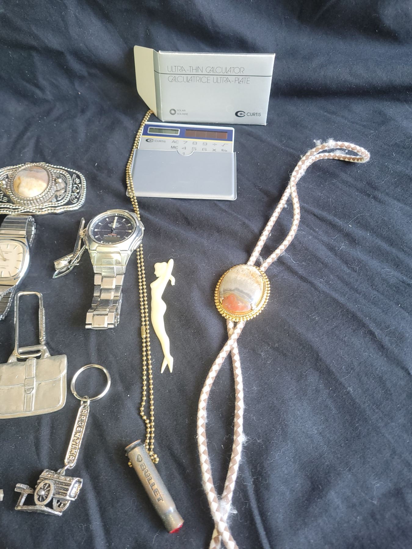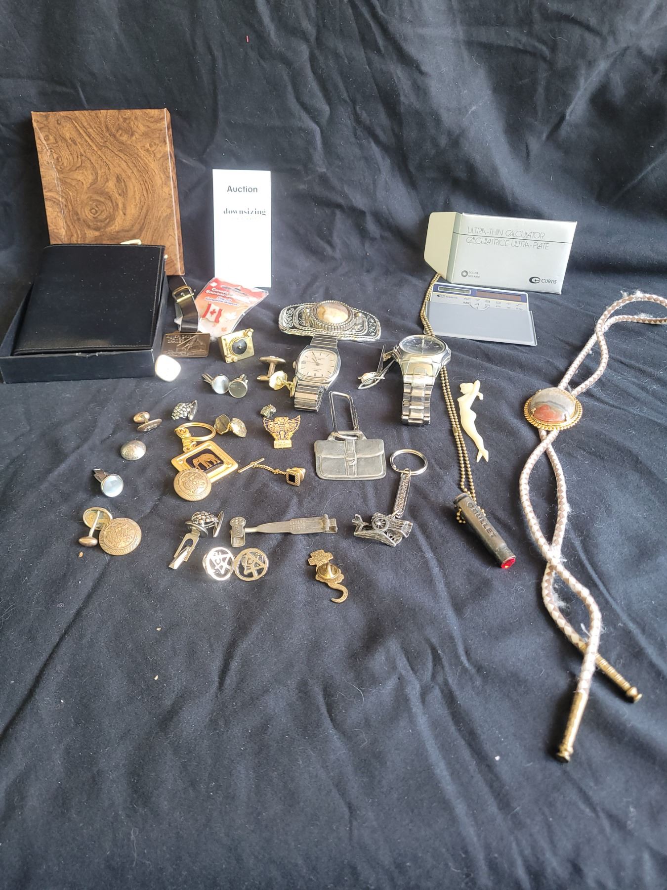 New leather Ferre wallet, Casio & Timex watches, BOLLO WITH JASPER STONE, BELT BUCKLE WITH JASPER STONE, cufflinks, and bling. Pickup at 9 am