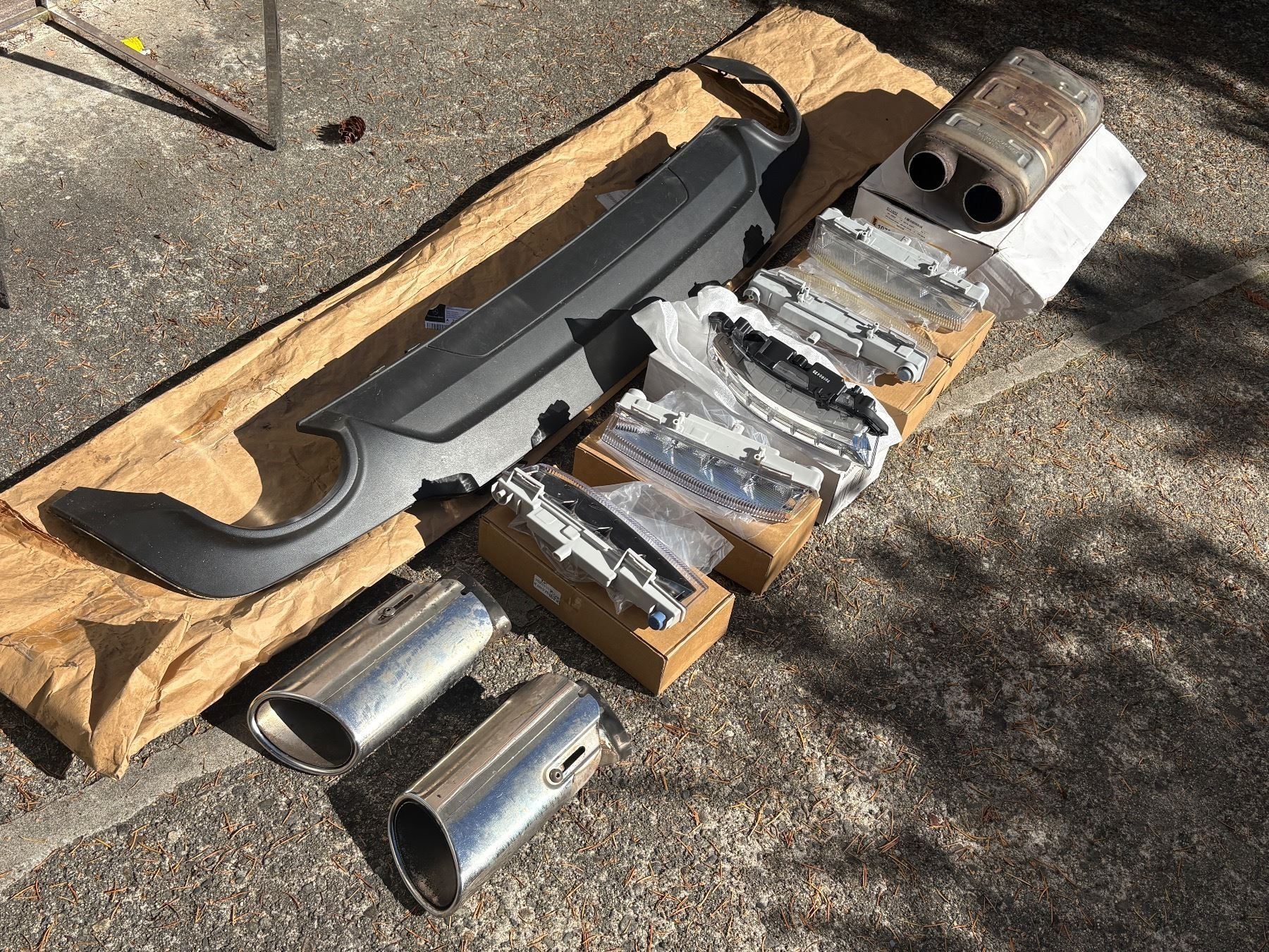 Mercedes C350 OEM Parts Bundle - Rear diffuser, pair of chrome exhaust tips, resonator (mid-muffler section)