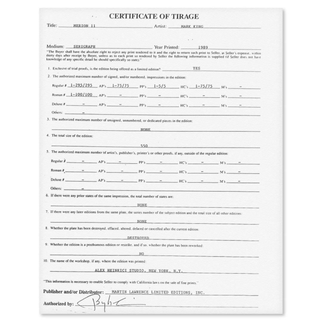 "Merion #11" is a limited edition serigraph on paper by Mark King (1931-2014). Hand signed and numbered, this piece comes with a letter of authenticity and measures approximately 23" x 30" (image).
