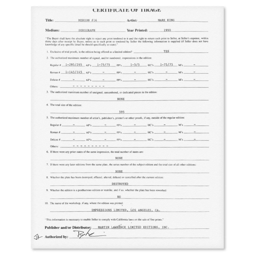 "Merion #16" is a limited edition serigraph on paper by Mark King (1931-2014). Hand signed and numbered, this piece comes with a letter of authenticity and measures approximately 27" x 36" (image).