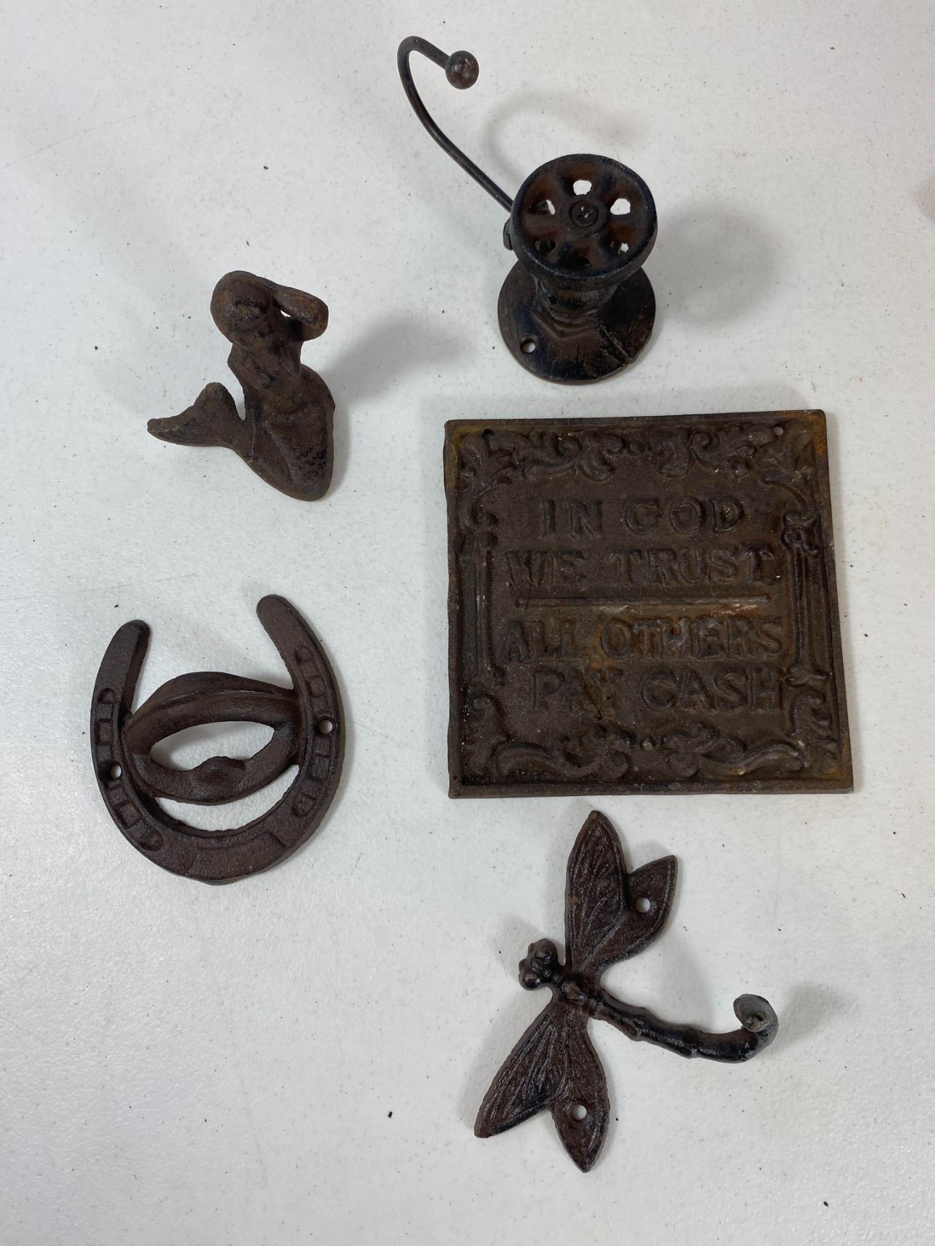 Assortment includes mermaid figure, pulley hook, dragonfly hook, horseshoe hook and 'In God We Trust All Others Pay Cash' plaque. Items show surface wear and rust. All are modern reproductions offered as decorative collectibles.