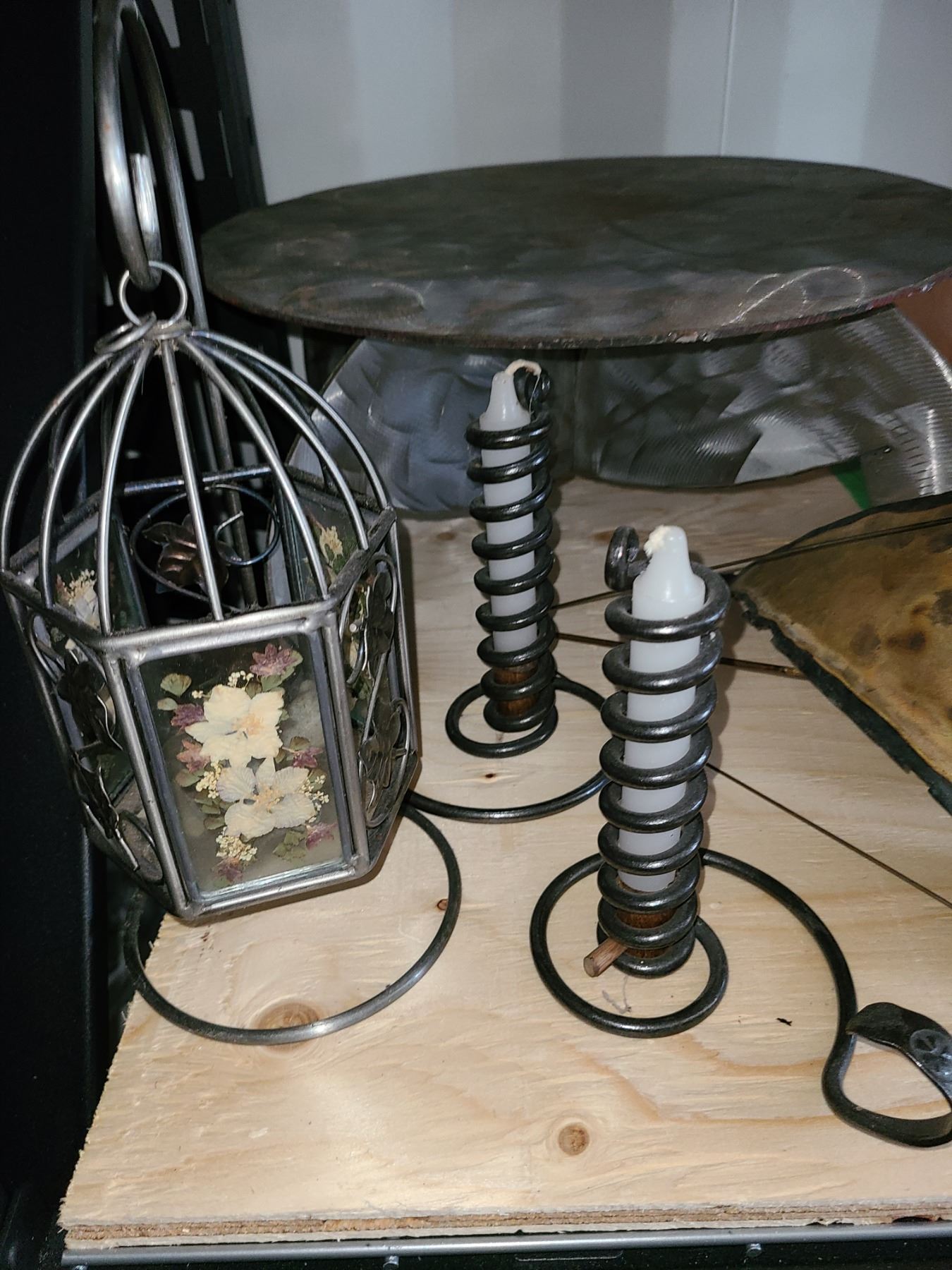 Aluminum art work, metal candle holders, lantern, and sailboat in lot. Bring packing material. Pickup 9 am.