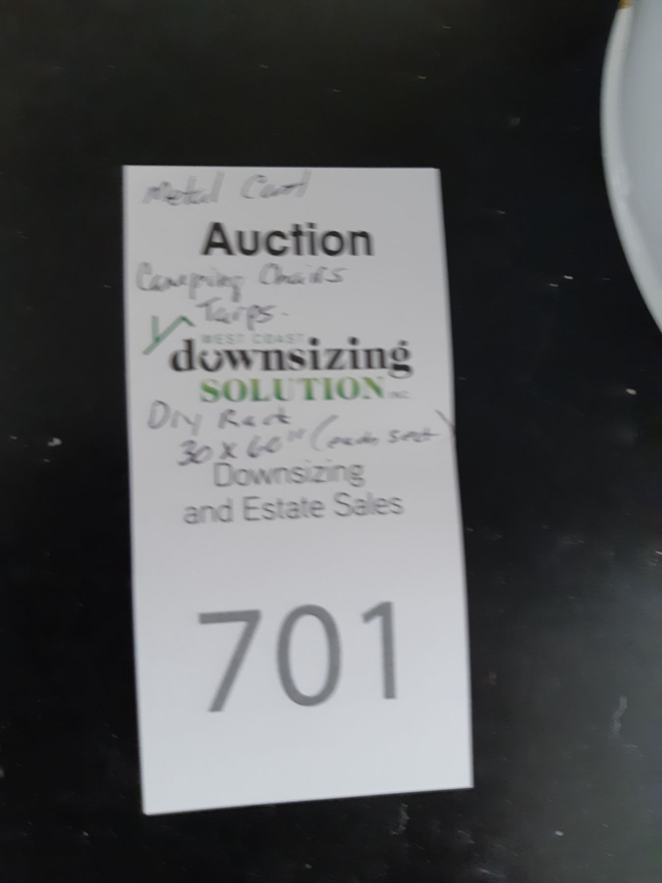 Metal cart, 3 section closes dryer, tarps, camping chairs and more. Pickup at 9 am