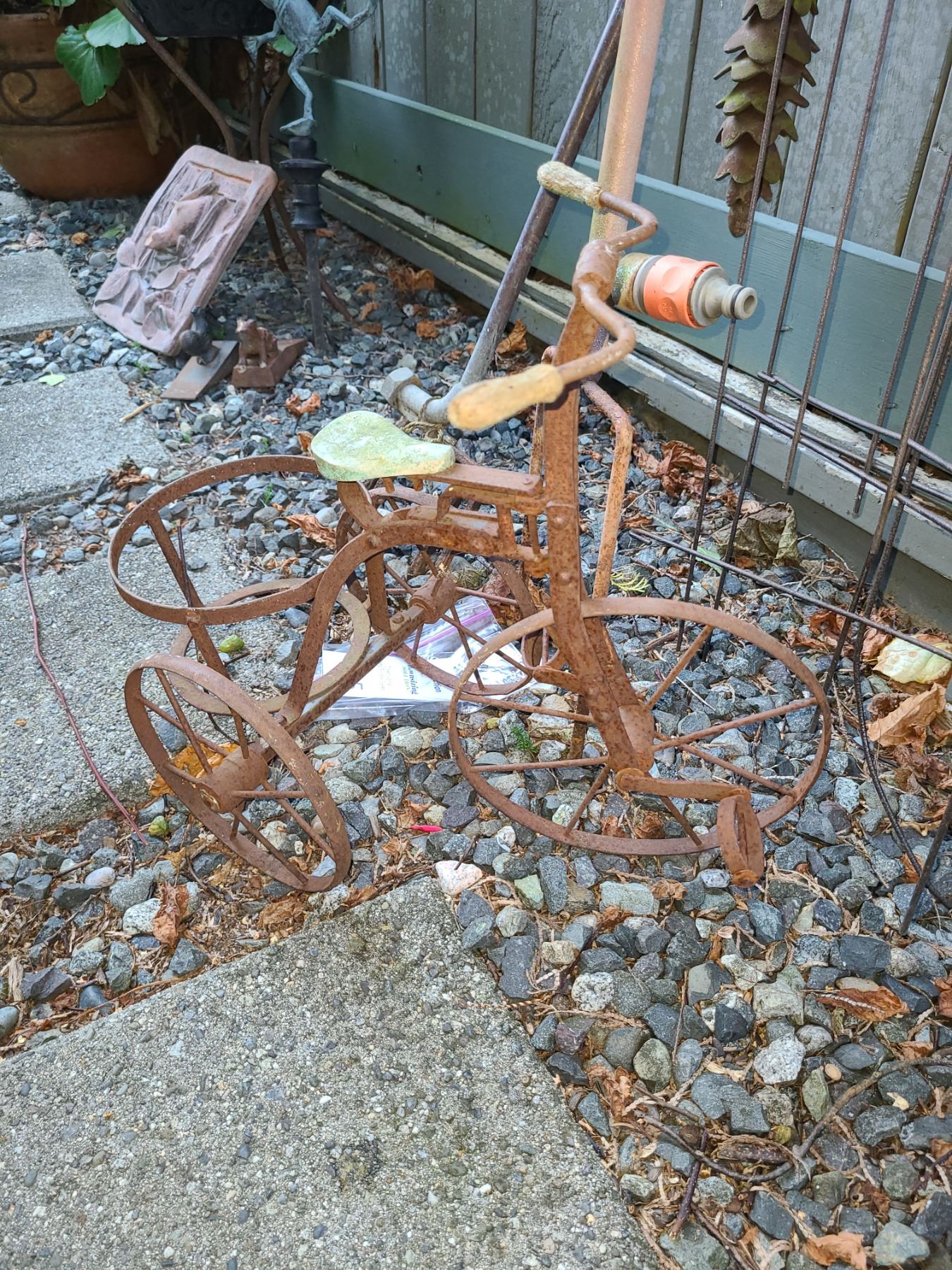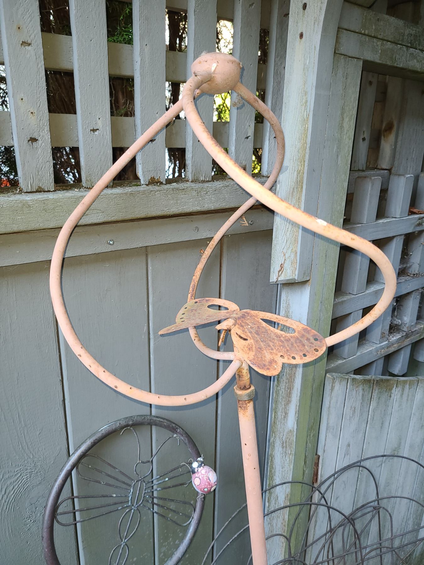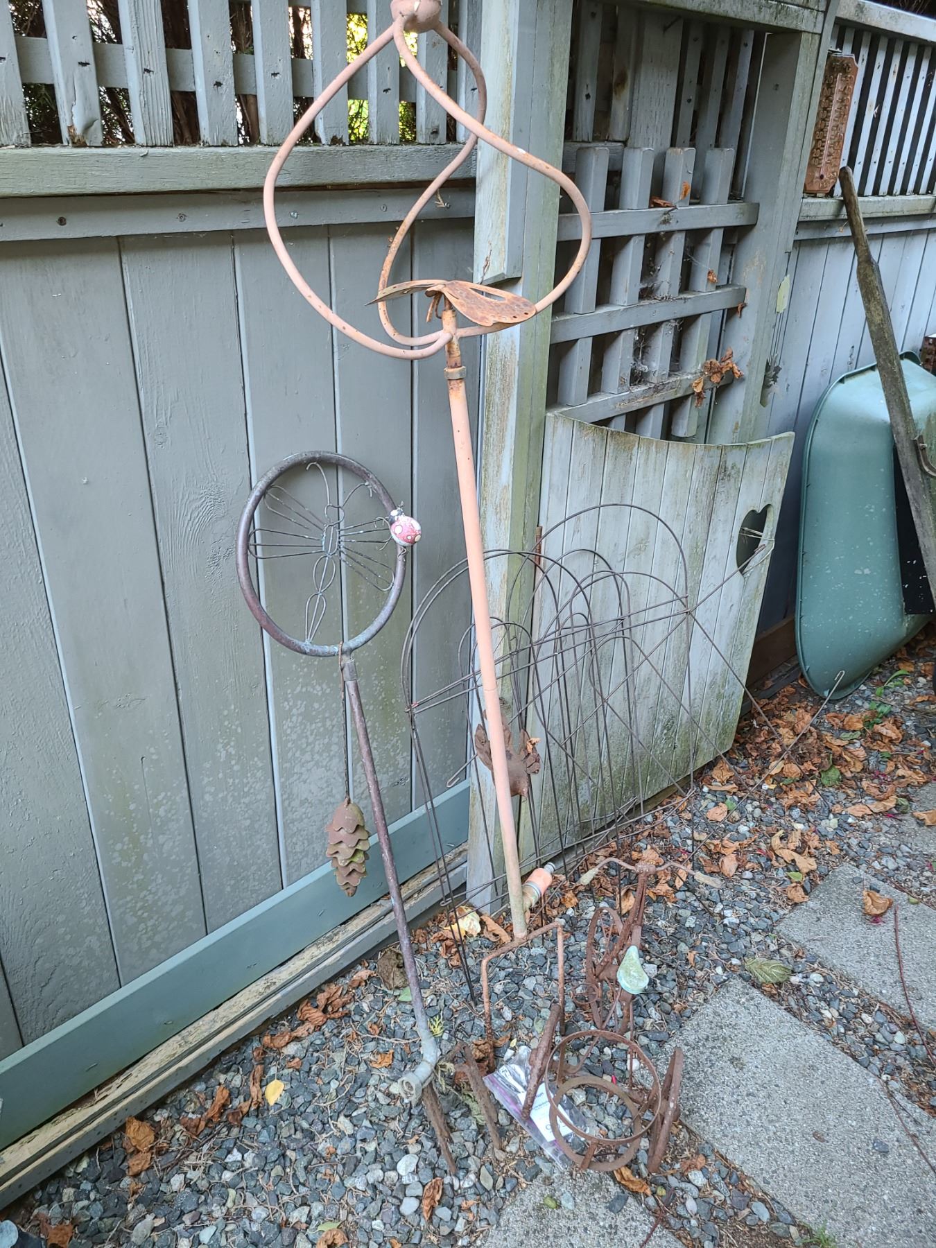 Metal fence, 2 butterfly pieces, and bike in lot. Pickup 9 am.