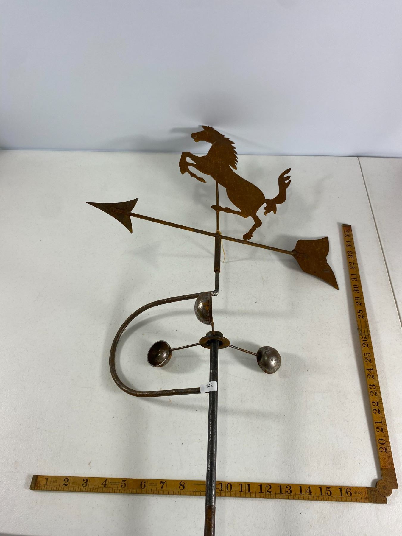 Metal weather vane featuring a prancing horse with arrow and rotating cups. Approx. 5" tall overall; weathered finish and age wear.