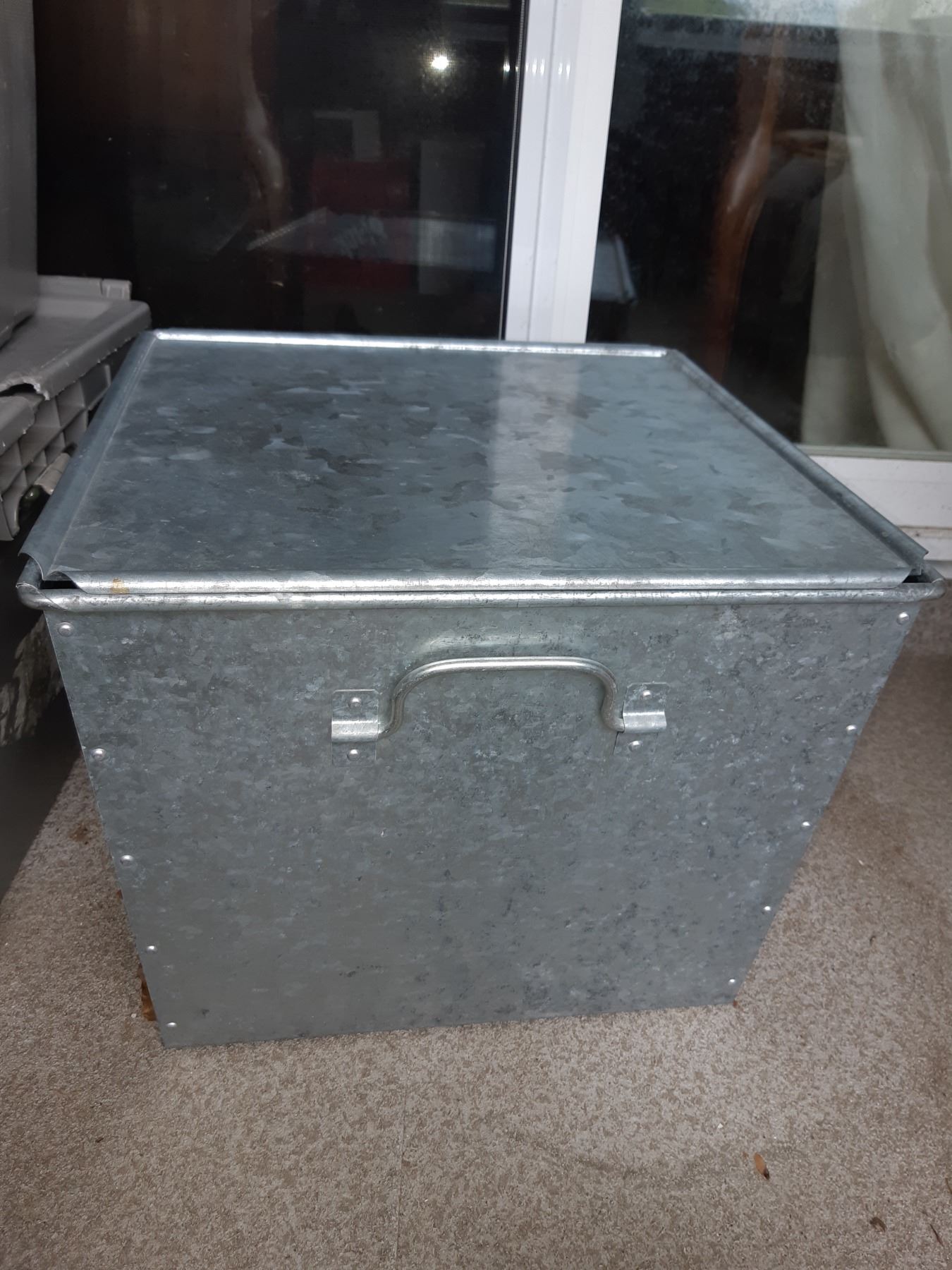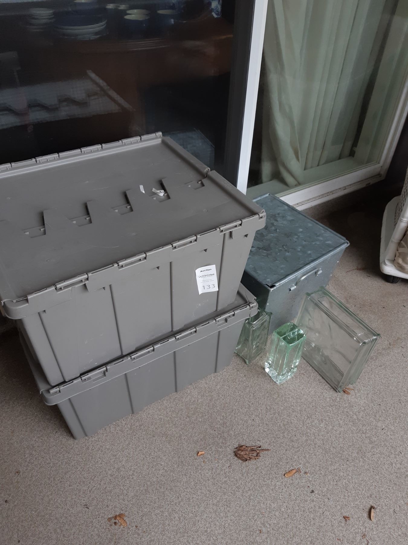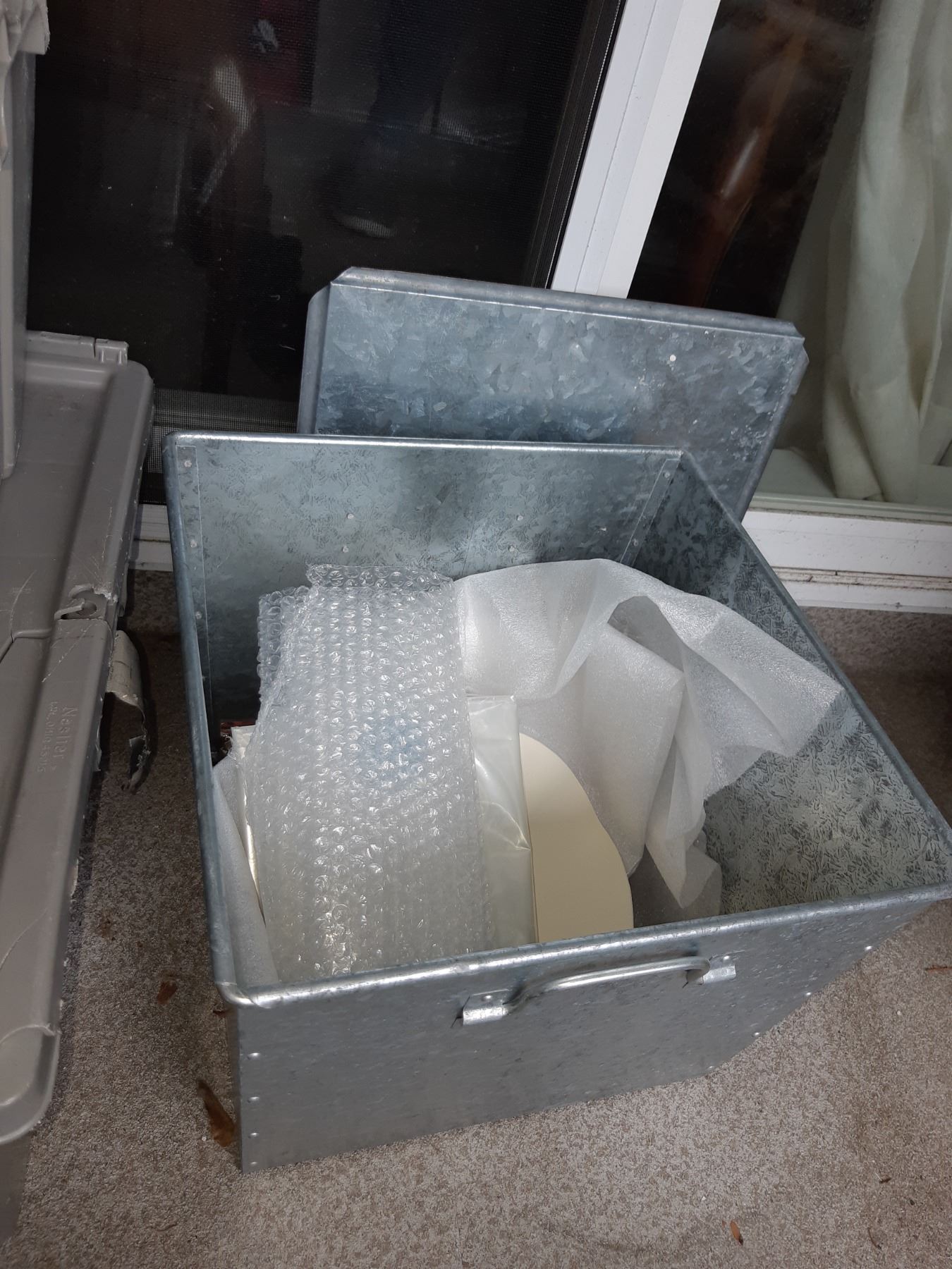 Metal storage container with lid 20x20x15 and 2 plastic storage containers, glass blocks pickup at 11 am