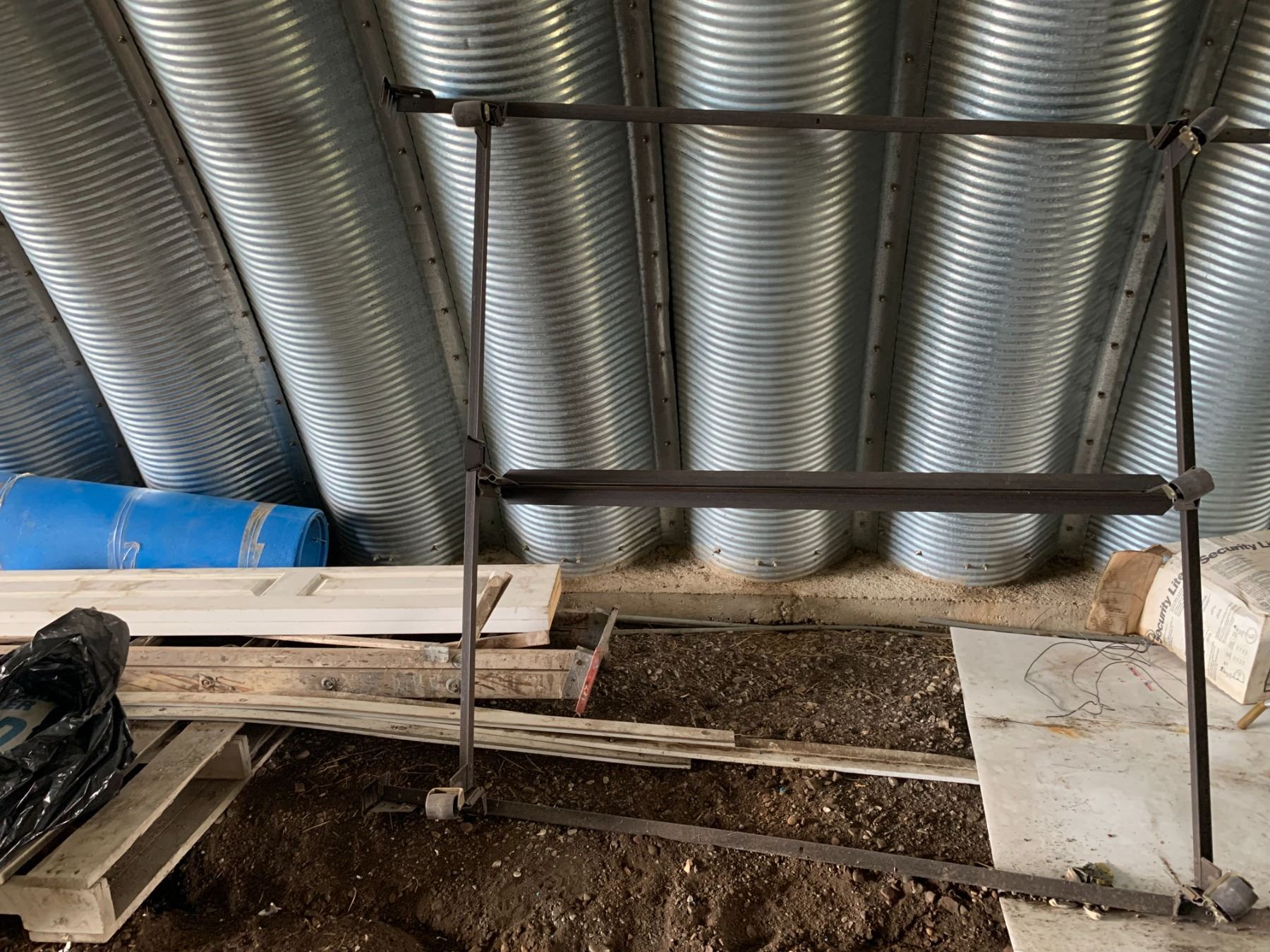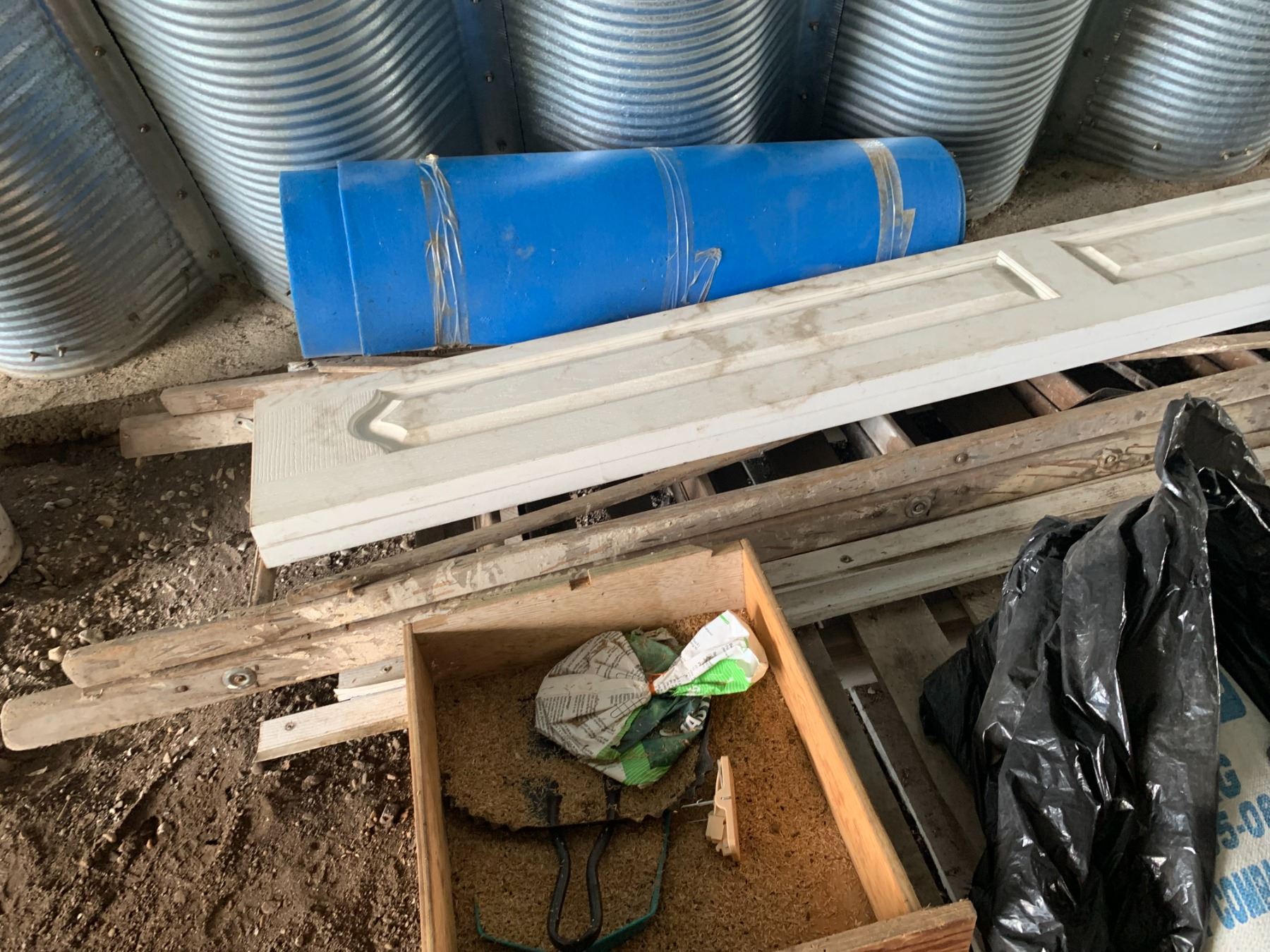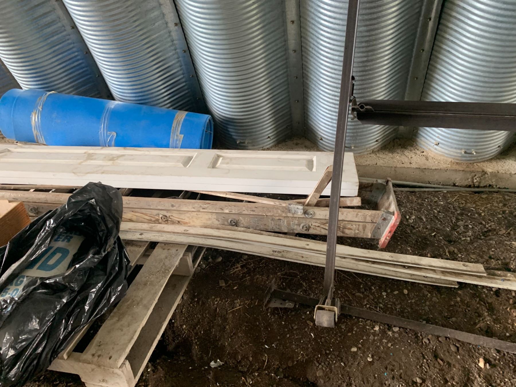 Metal bed frame, old wooden step ladder & misc. wood, etc.