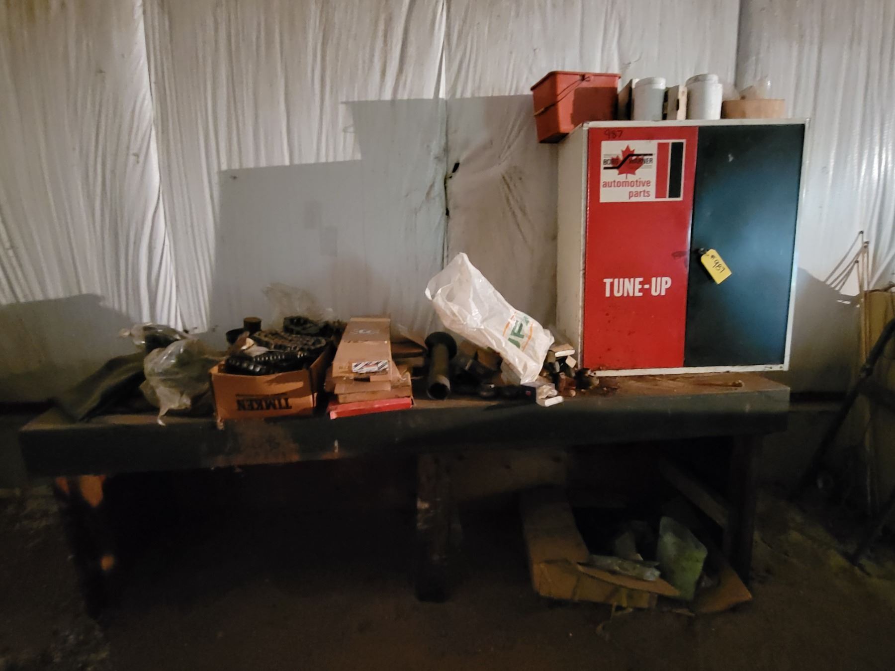 Metal table , parts cabinet, bearings, roller chains, tire tubes and misc.