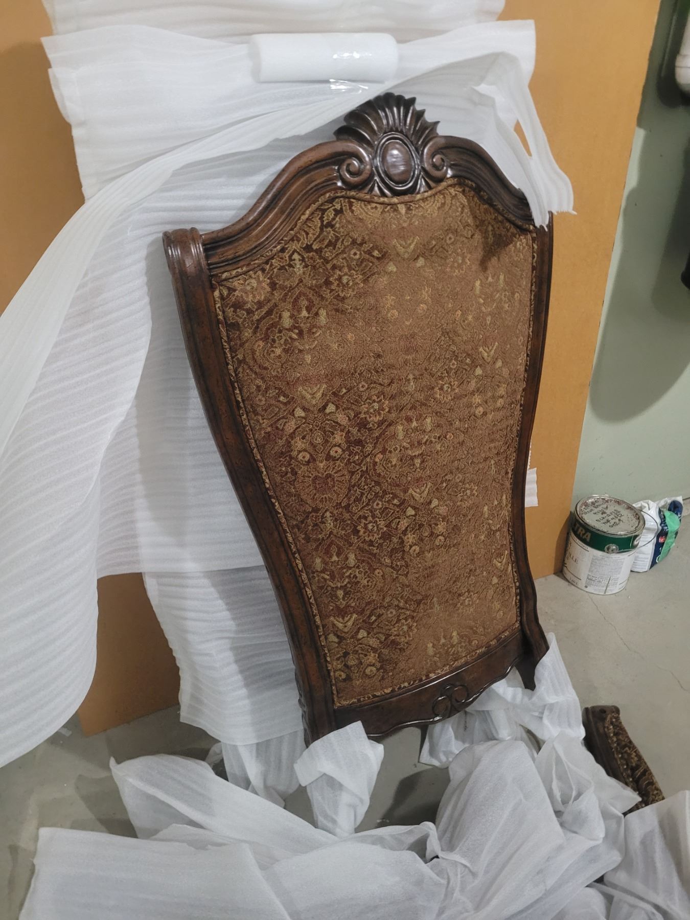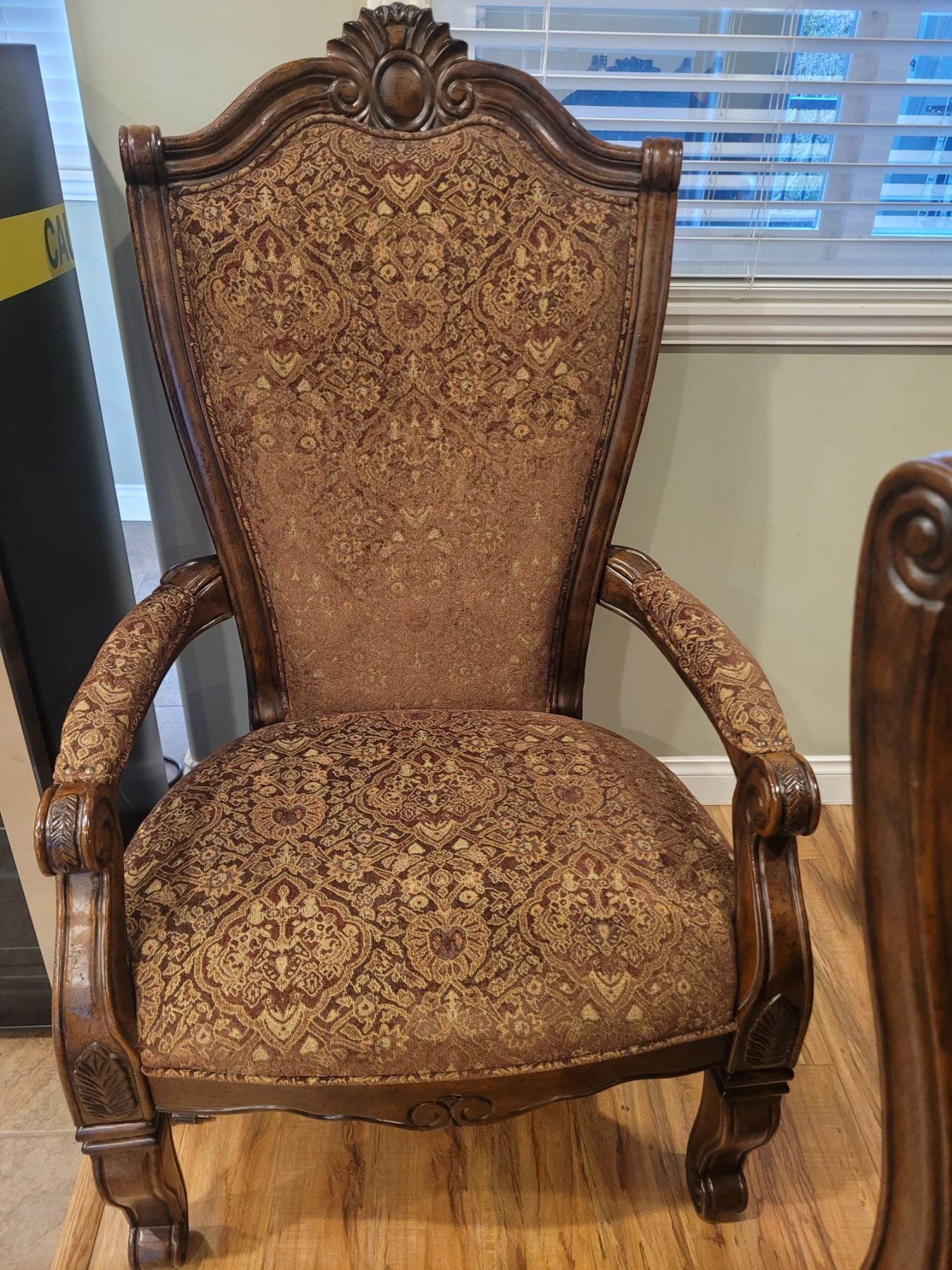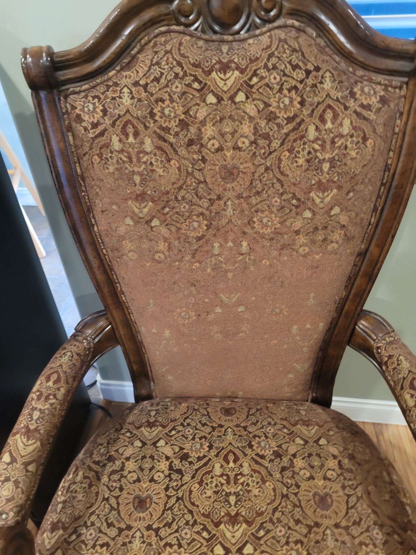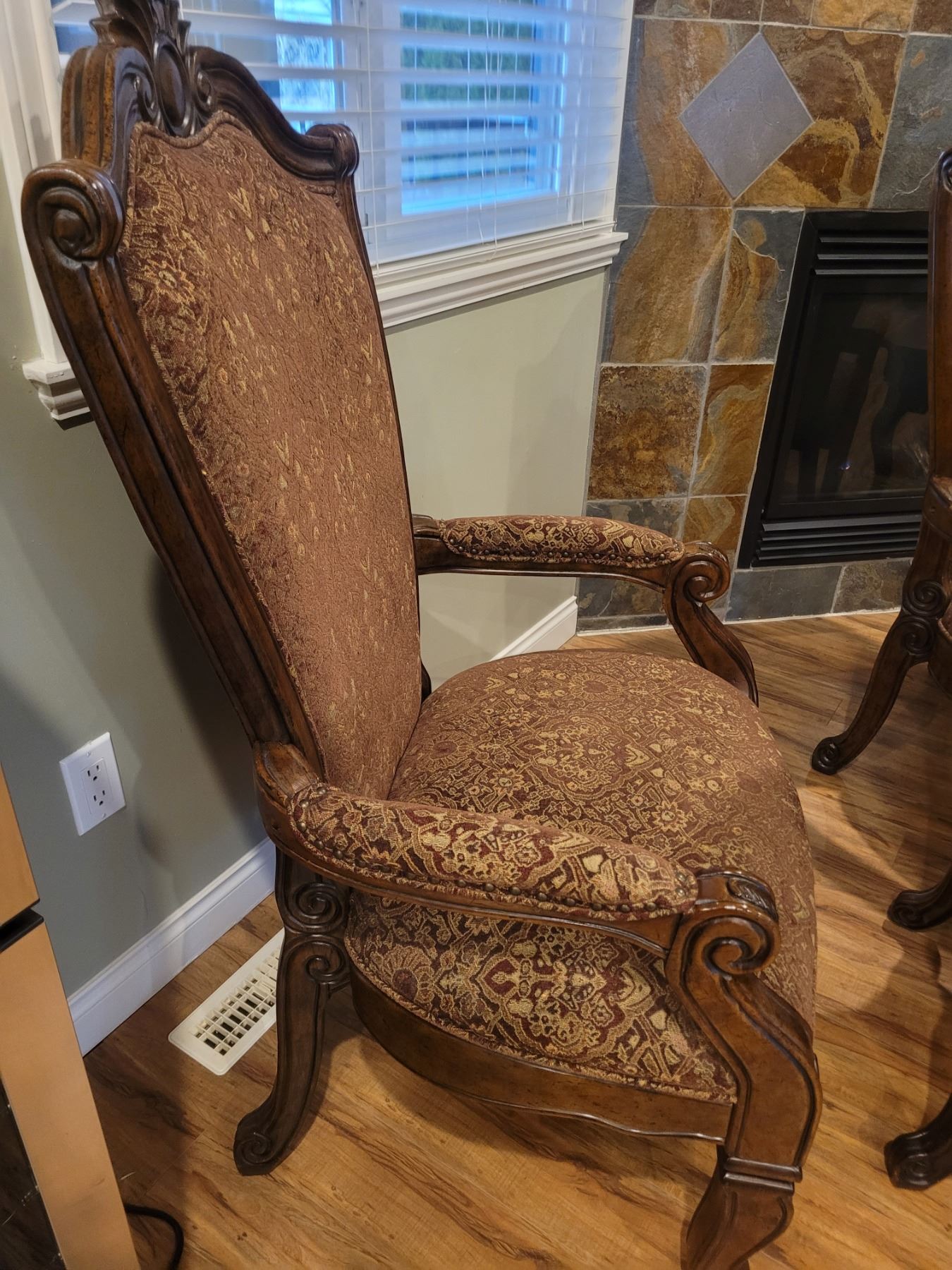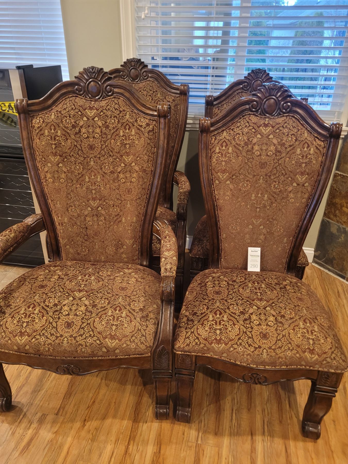 Four Michael Amini 'Windsor Court' upholstered dining chairs with carved wood detail, 23x33x46. 3 extra replacement upholstered backs with 3 arms Pick up 9-10