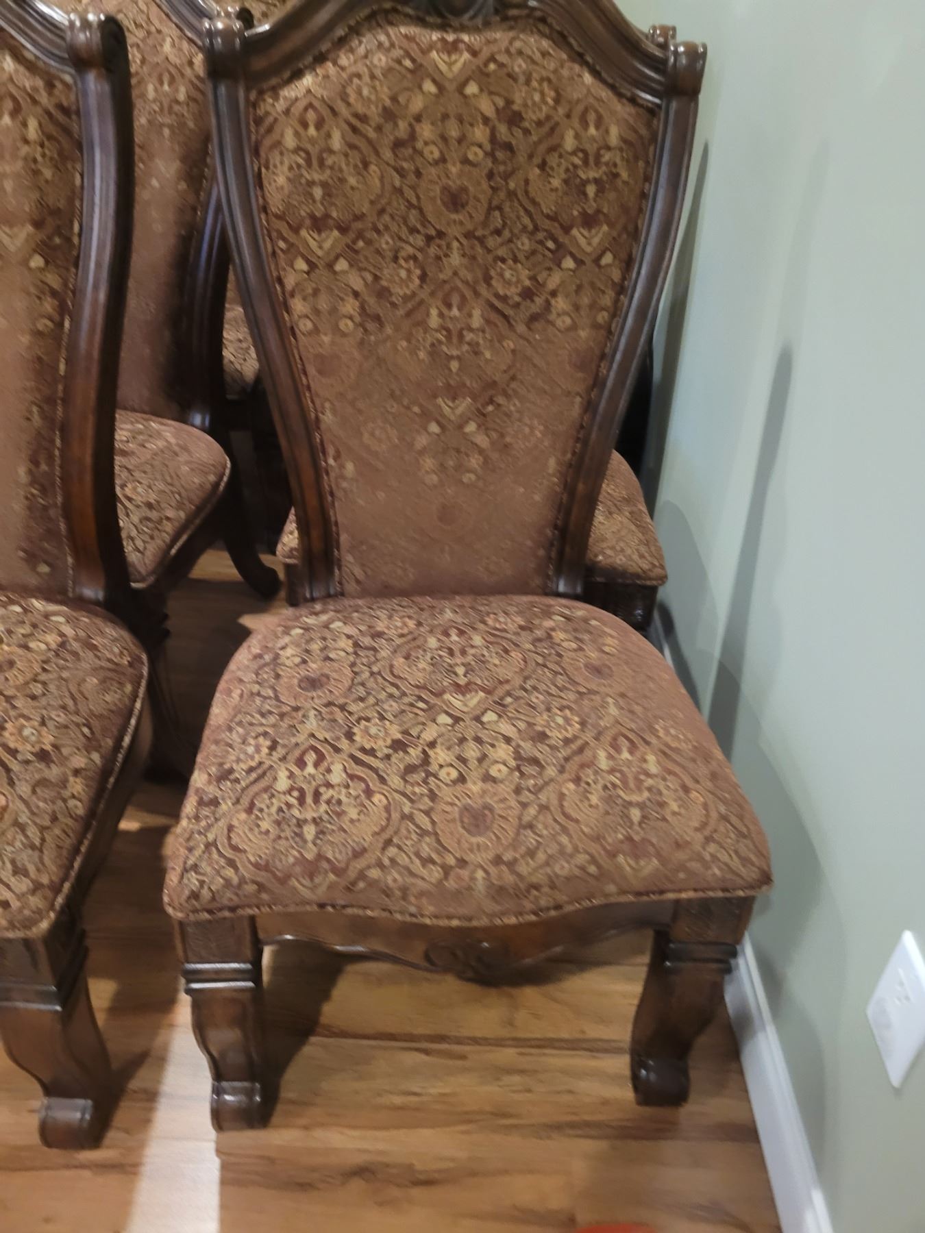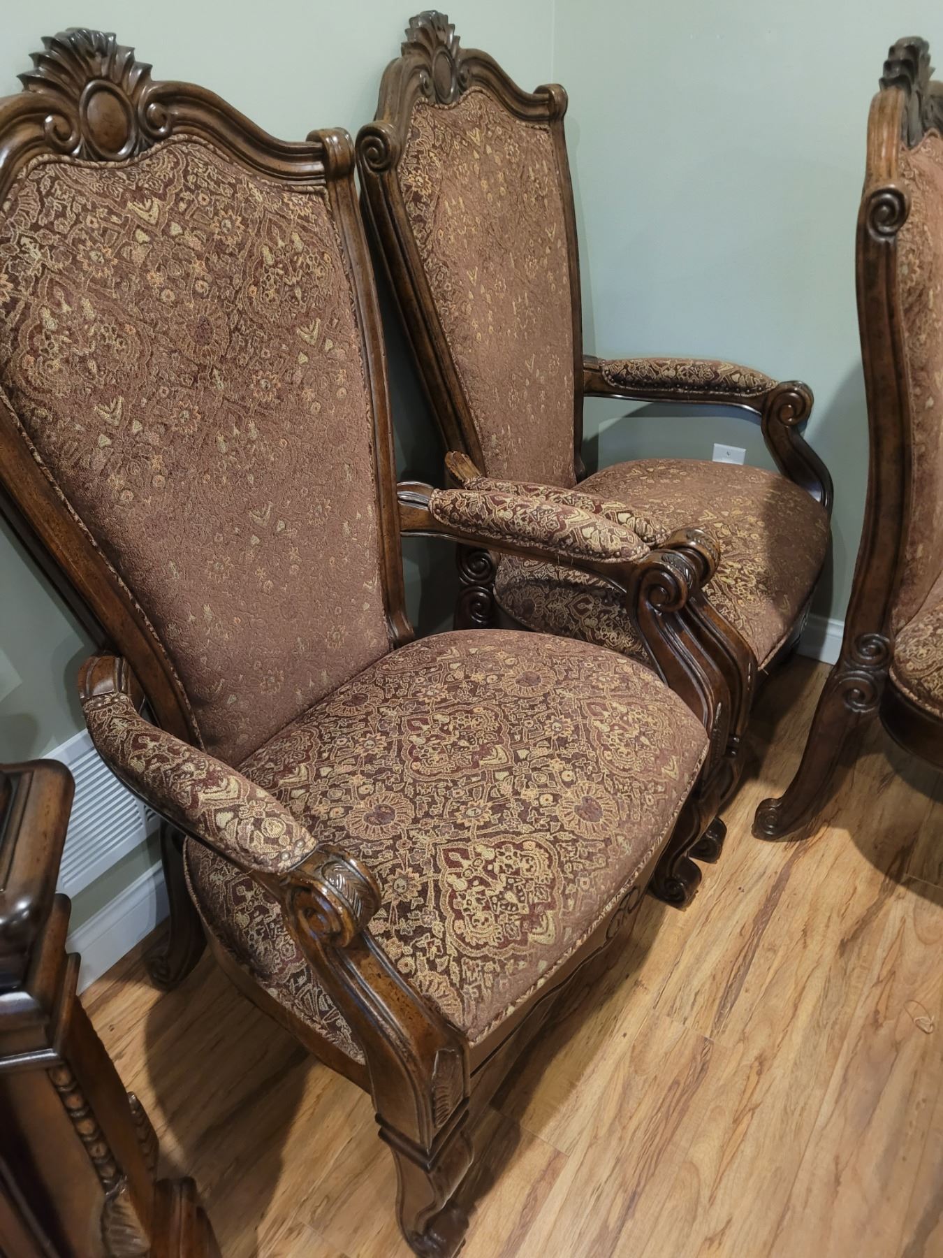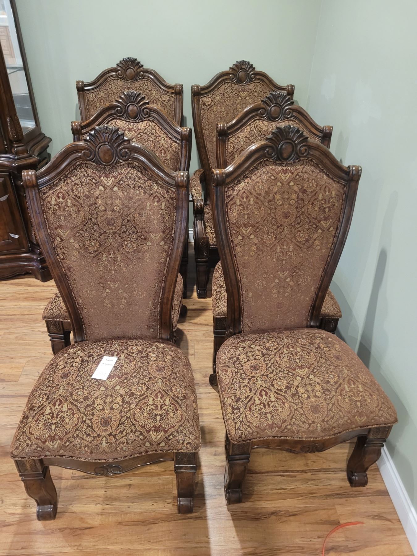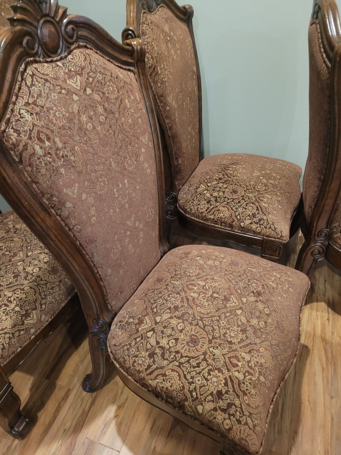 Six 'Windsor Court' by Michael Anini upholstered dining chairs with carved wood detail, 23x33x46. Pick up 9-10
