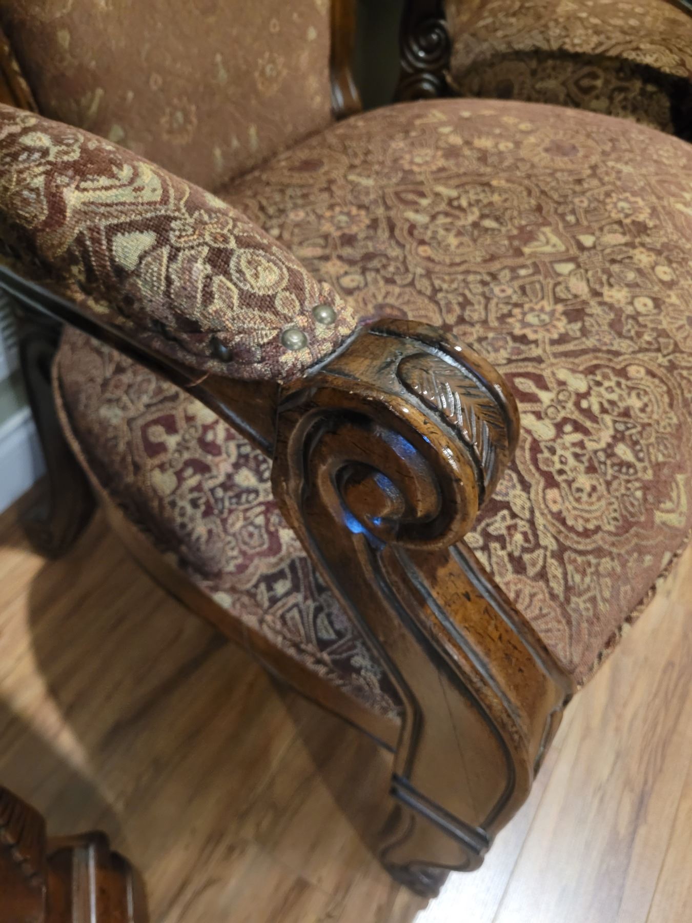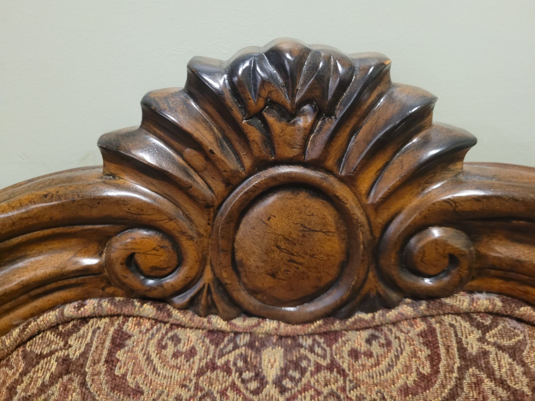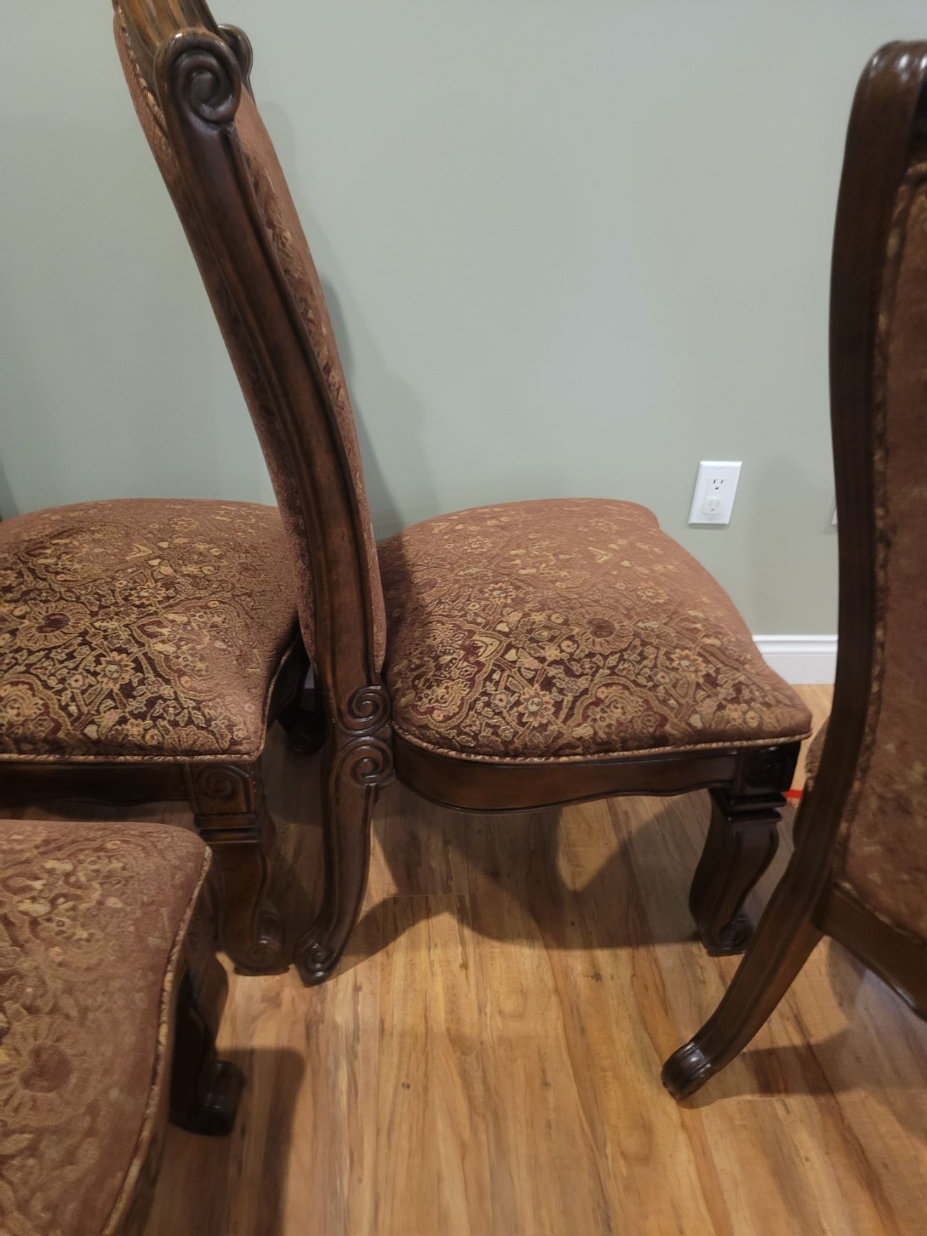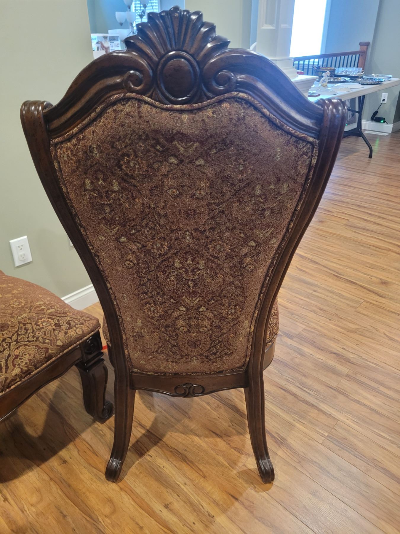 Six 'Windsor Court' by Michael Anini upholstered dining chairs with carved wood detail, 23x33x46. Pick up 9-10