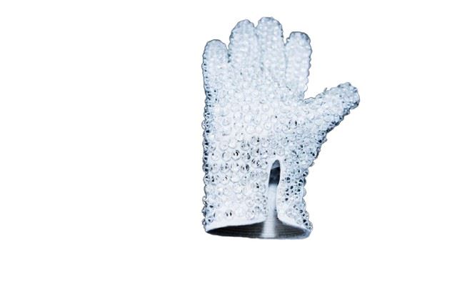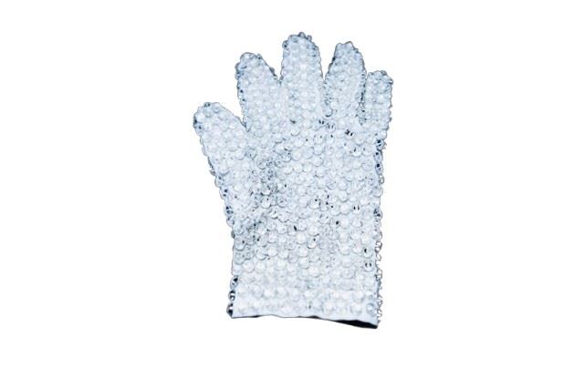 The crowning iconic of all iconic collectables, the actual stage worn glove worn by Michael Jackson from the Victory Tour. It is a white large "tux style" glove completely covered, (front and back of palm and all fingers) in crystals. The glove was found among Michael's belongings that were in a wardrobe truck in a storage facility that was leased to his brother Tito Jackson in Oxnard, California. The glove shows signs of production use, with some loose threading and some dirt smudges along the fingertips, as well as some light sweat marks inside the glove itself! Accompanied with a Letter of Provenance from Henry Vaccaro, who owned the largest collection of Jackson family memorabilia. A true treasure for any Michael Jackson collector. (Glove measured approx. 8"X6").
