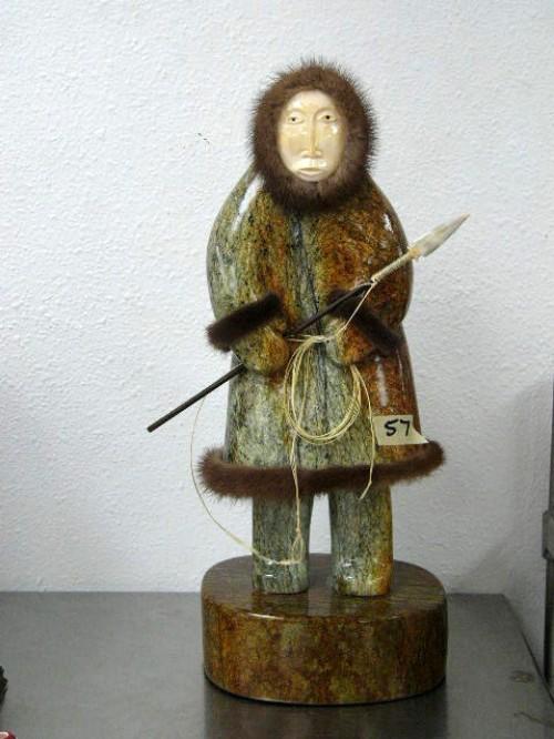 Michael Scott Soapstone Man w/ Fossil Ivory Face20" tall trimmed in Mink, sinew and wooden spear w/ wooden tip (2)