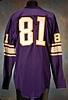 In 1964, Carl Eller, a consensus All-America with the University of Minnesota, was a first-round draft pick of both the National Football League's Minnesota Vikings and the Buffalo Bills of the then-rival American Football League. A 6-6, 247-pound defensive stalwart, Eller opted to stay in a familiar environment and signed with the Vikings. For the next 15 years through 1978, he was a fixture in one of pro footballs most effective defensive alignments. He finished his career with one final season with the Seattle Seahawks in 1979, having played in 225 regular season games. During Eller's Hall of Fame career, the Vikings enjoyed great success on the field. Starting in 1968, Eller's fifth campaign, Minnesota won 10 NFL/NFC Central Division titles in the next 11 seasons. The Vikings won the 1969 NFL championship and NFC crowns in 1973, 1974, and 1976 and played in four Super Bowls. The tagging on this jersey has been removed due to the addition of a crotch piece by the team. On the front, back, and both sleeves is the player number "81" in white on yellow tackle twill. The jersey shows tremendous game-use with many team repairs and besides the addition of the crotch piece has no alterations of any kind. Accompanied by a Mears LOA Graded A8.