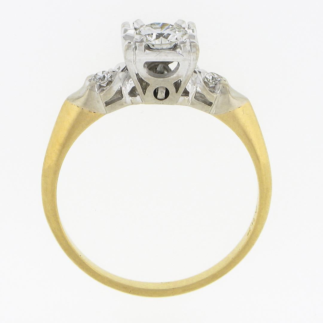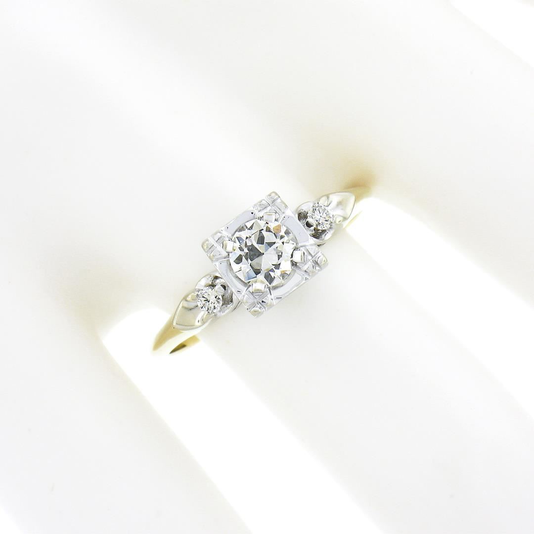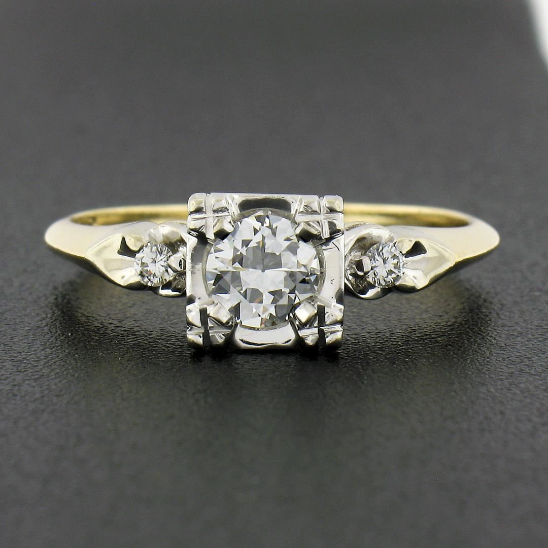 A vintage solid 14k yellow & white gold engagement ring, with 1 old european cut & 2 round cut natural diamond (G/H - VS1/VS2 ; 0.52ctw). The ring is size 8.5, weighs a total of 2.82 grams, and measures 6.8mm wide.