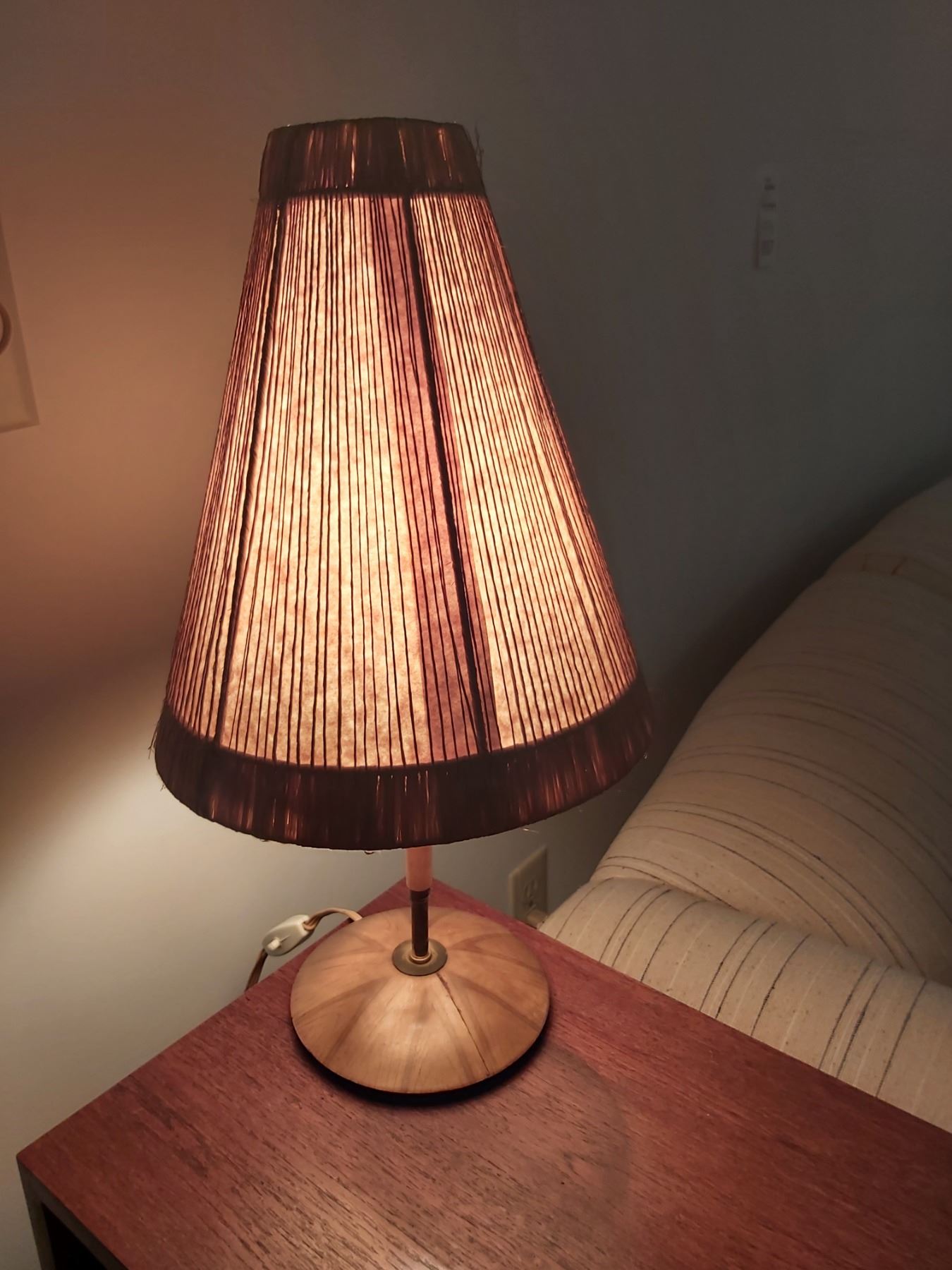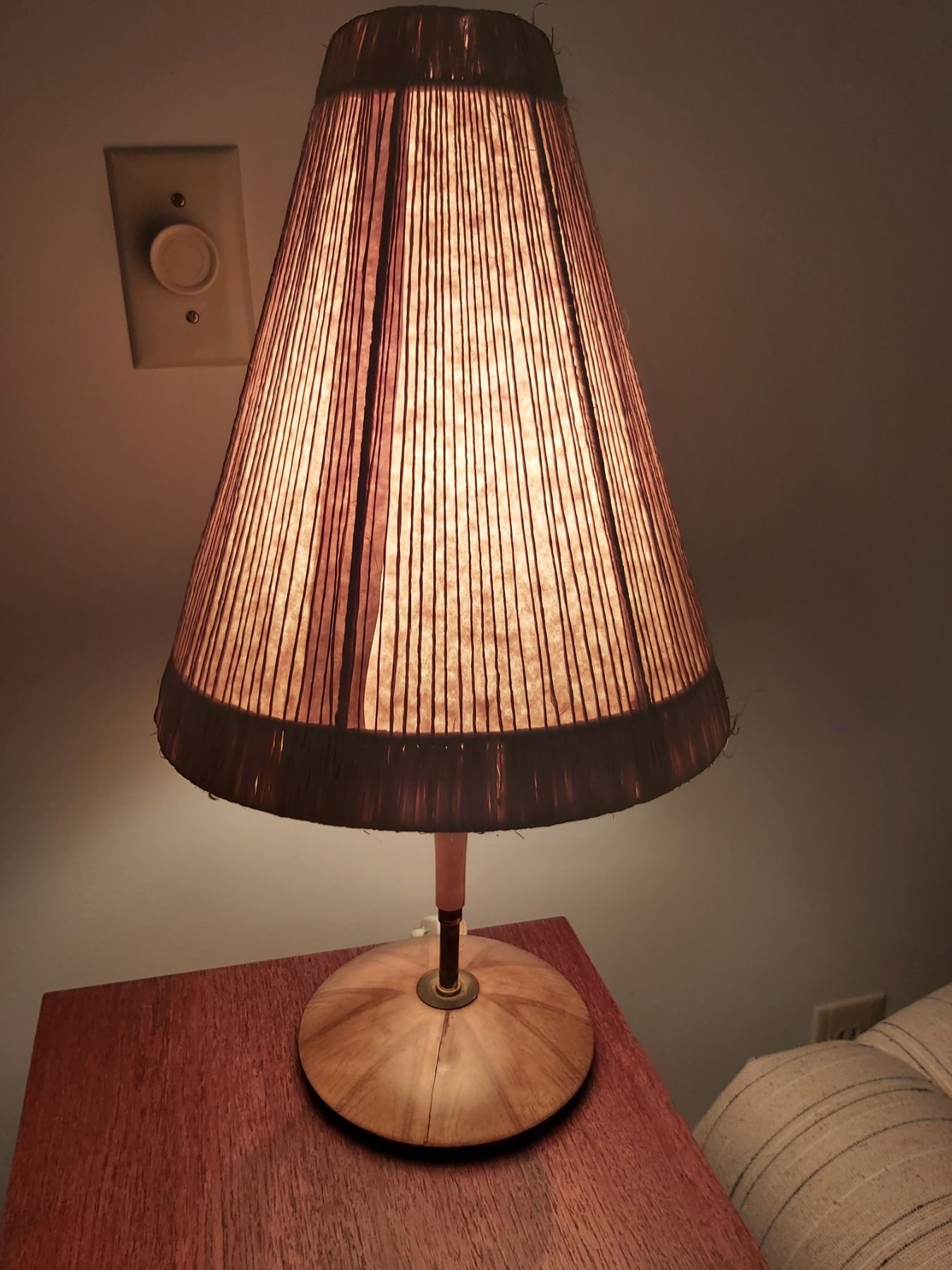 Teak and fibre shade mid century lamp, 21” tall. Untested. Pickup 9am