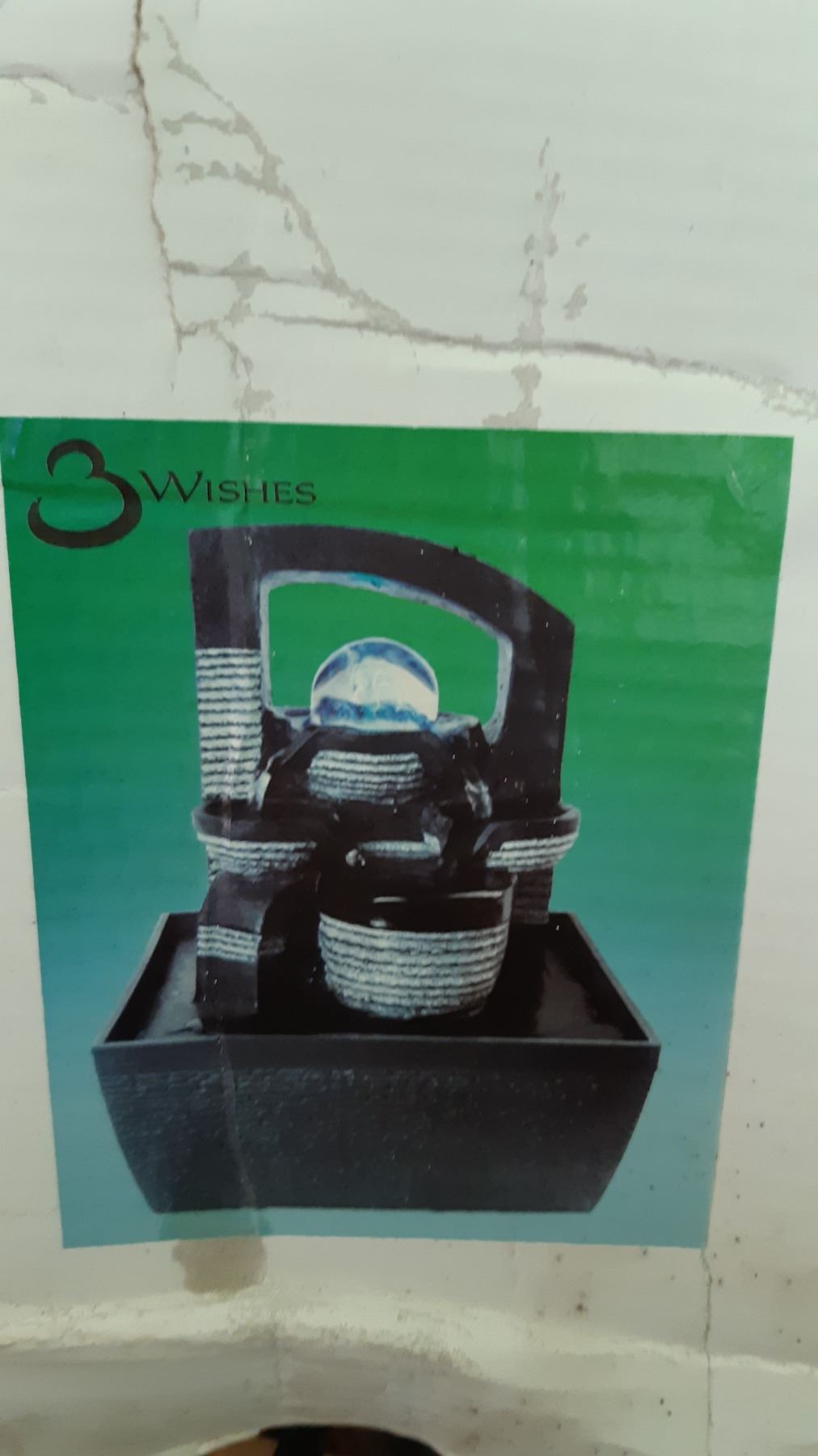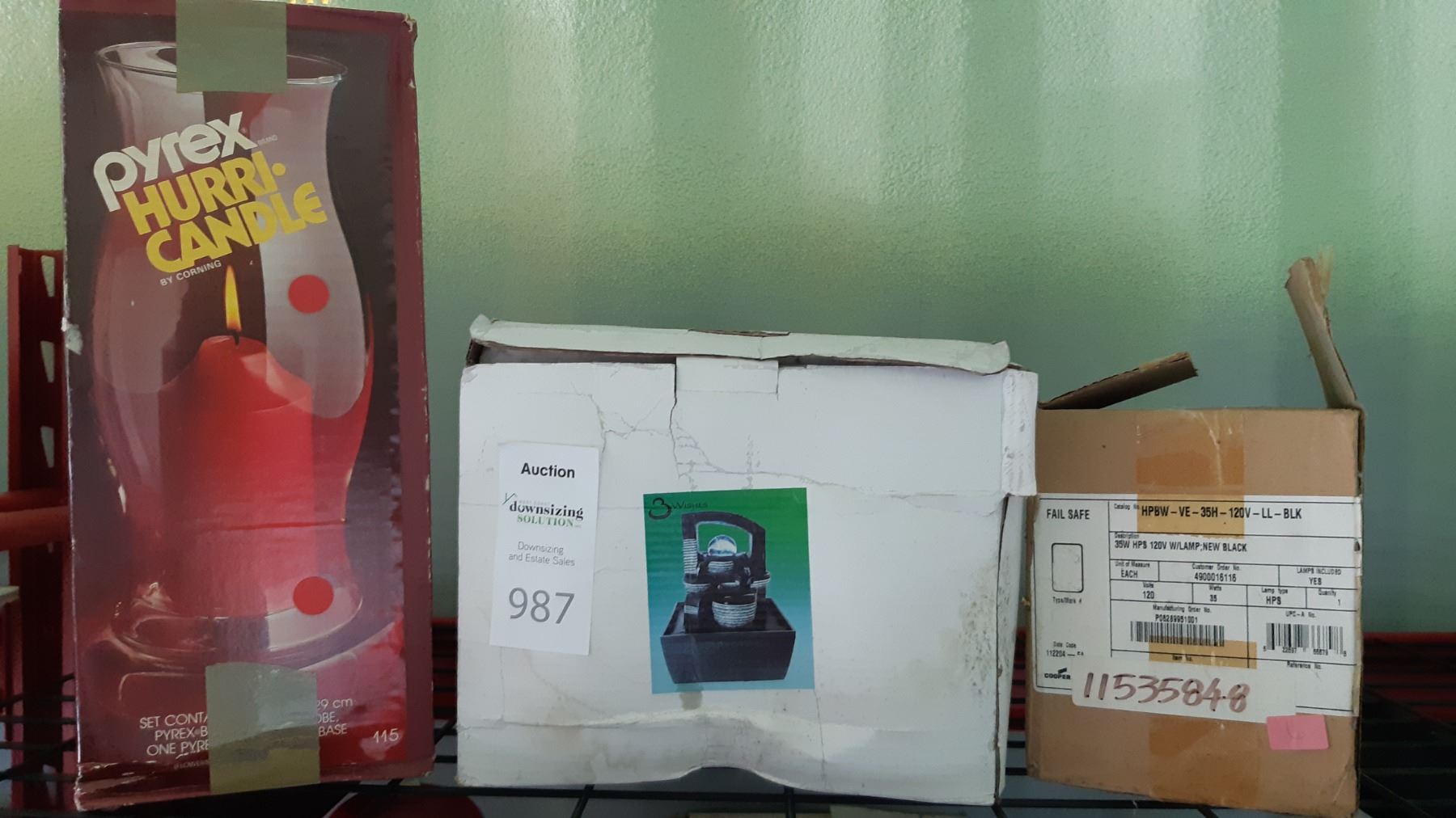 3 Wishes Mini fountain,Cooper outdoor light & large Pyrex HurriCandle Pickup at 9 am