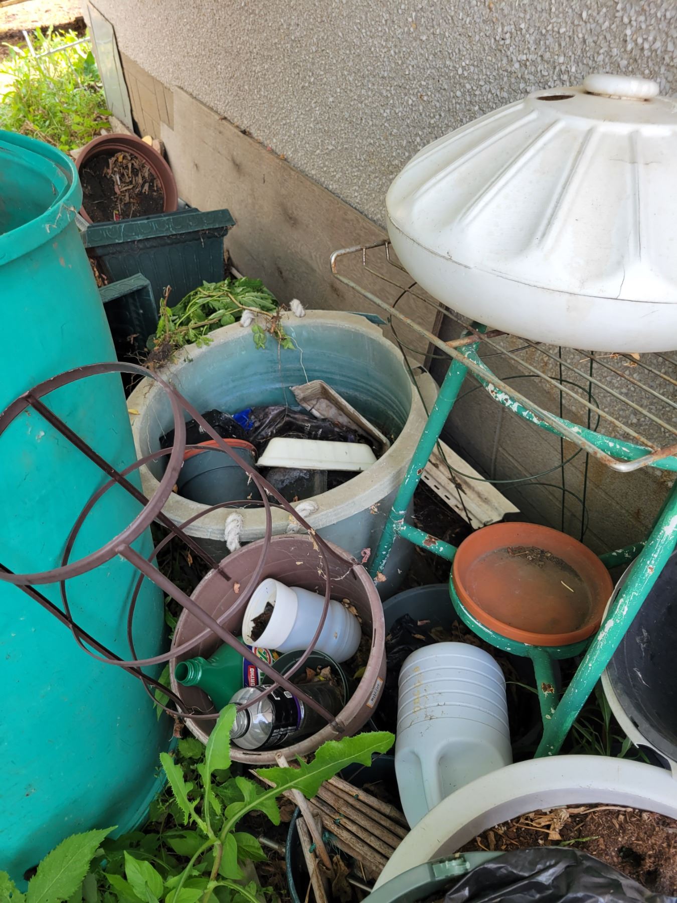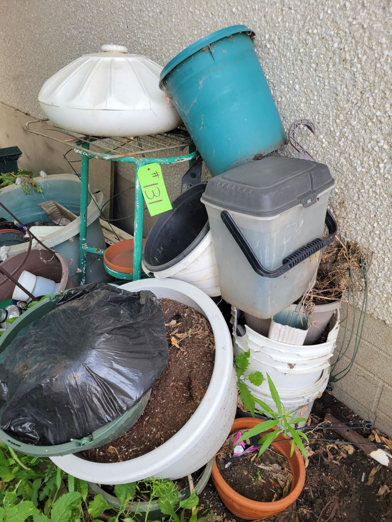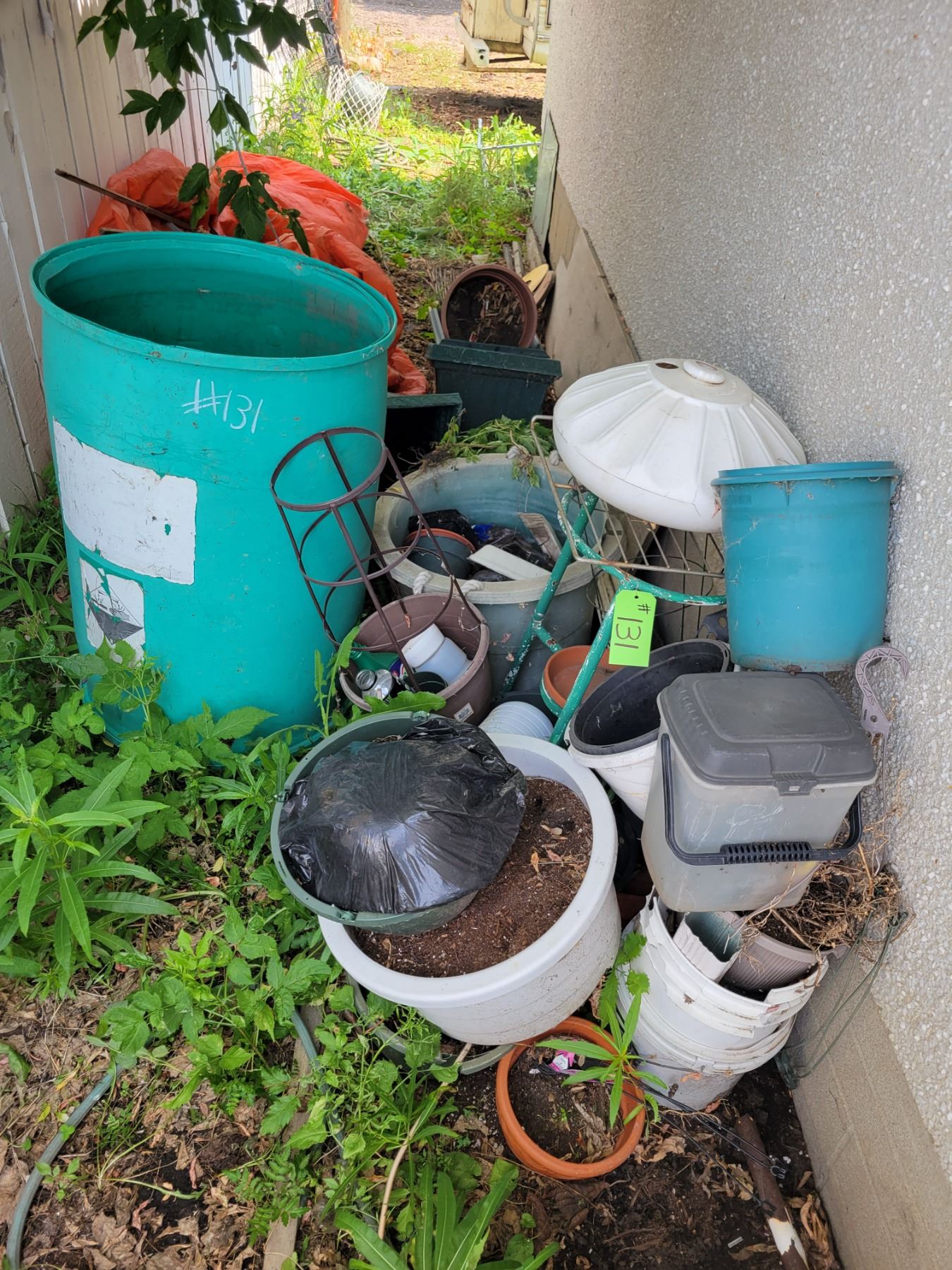 Misc. garden and yard supplies: rain barrel, pots etc.