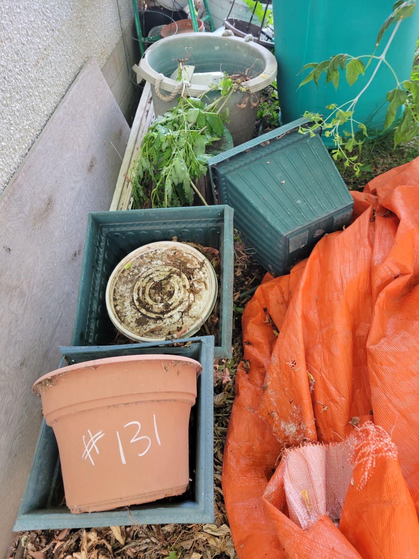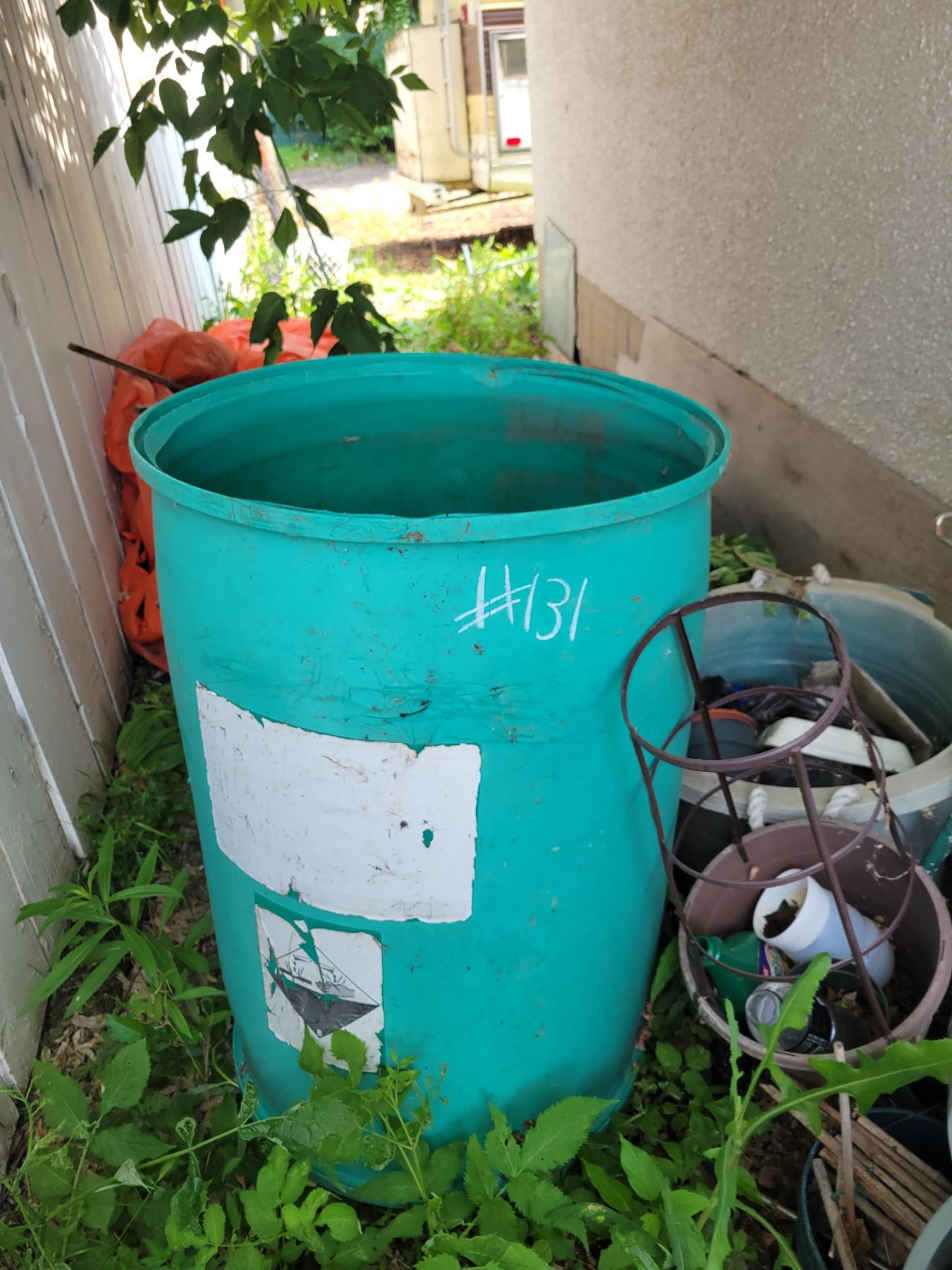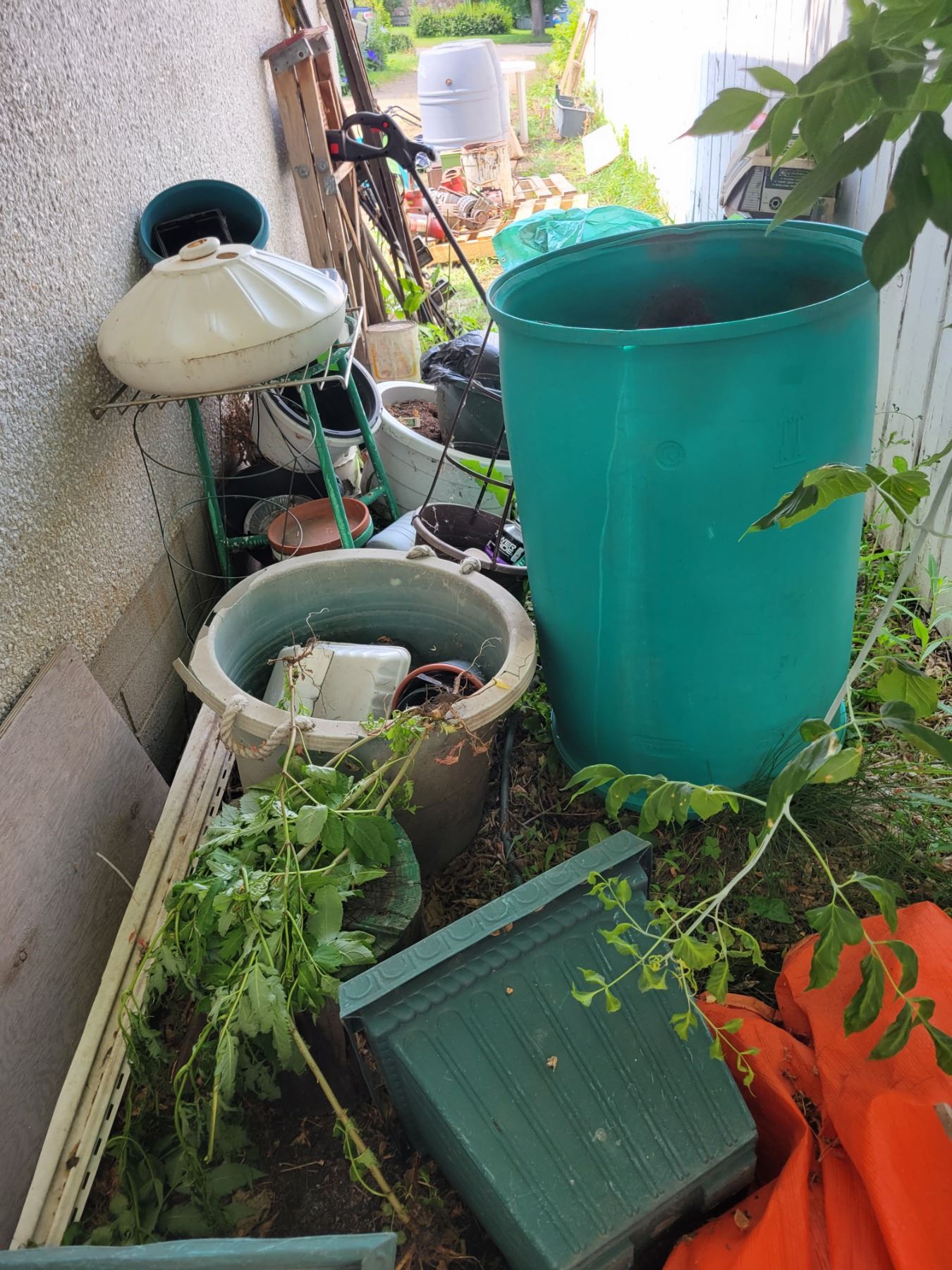 Misc. garden and yard supplies: rain barrel, pots etc.