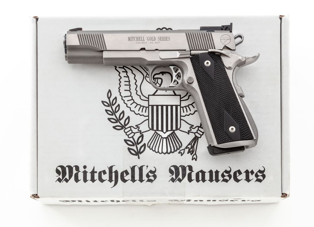 Mitchell's Mausers Gold Series 1911 Semi-Automatic Pistol, #MMC5077, .45 ACP cal., 5'' barrel, stainless steel, slide with front and rear slide serrations, checkered double diamond dark wood grips, red dot front sight, fully adjustable Champion rear sight, ambidextrous thumb safety, lightweight hammer and trigger, with one Wilson Combat magazine. In original box with matching end label and owner's manual. Mfg'd by Dan Wesson. Both sides of the slide behind the rear serrations and top of barrel at the chamber with the Dan Wesson logo. Pistol rates as excellent overall. Metal shows a few minor light scratches and handling marks. Grips appear as new. Action and bright shiny bore are both excellent. Est.: $750-$1,000. (Modern/PPT)