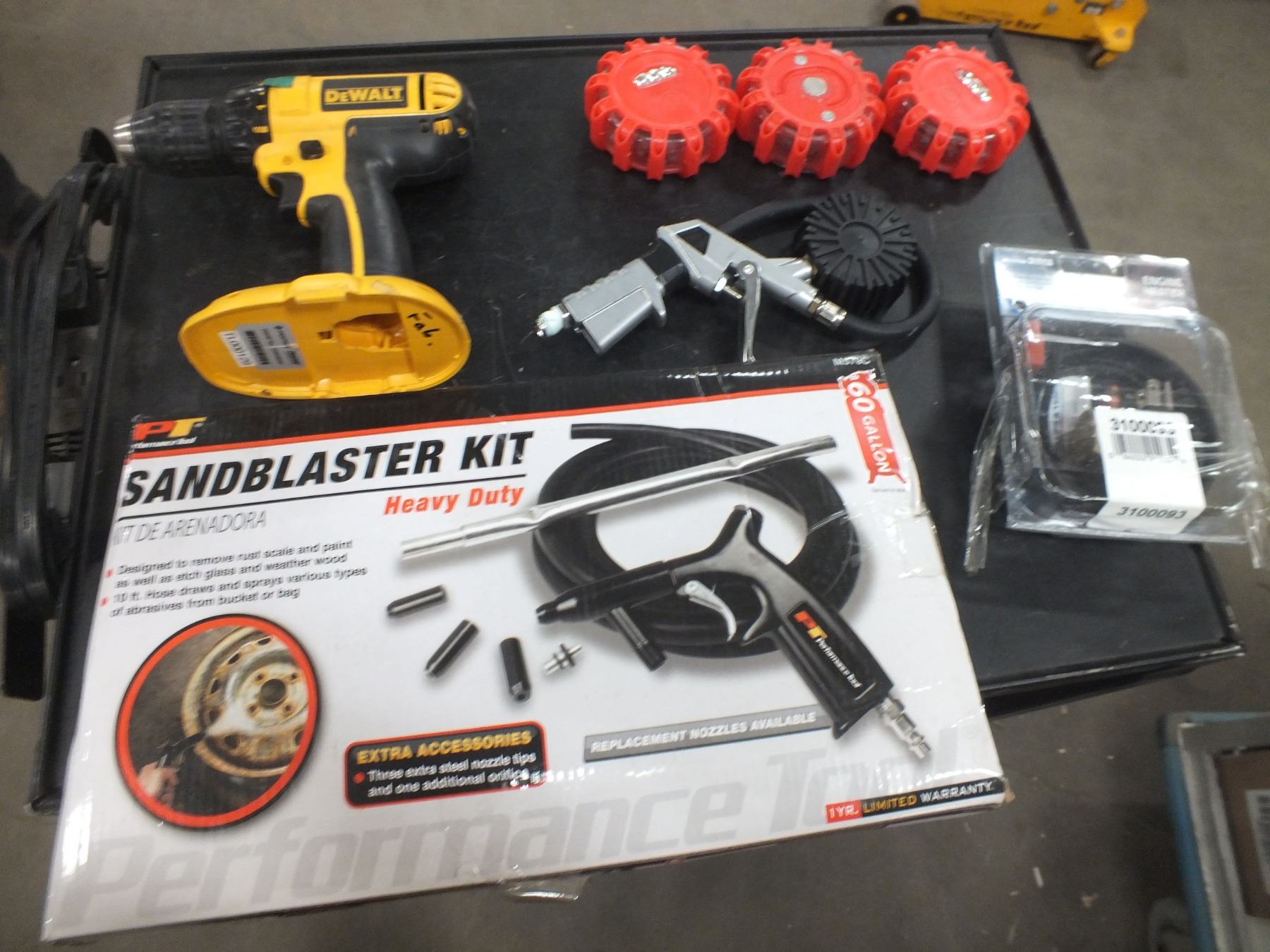 you get it all for one money, Sand Blaster Kit, Dewalt 18 volt drill no battery or charger, Air Chuck, Engine Heater, and 3 small led lights, all items are store returns, all un tested...
