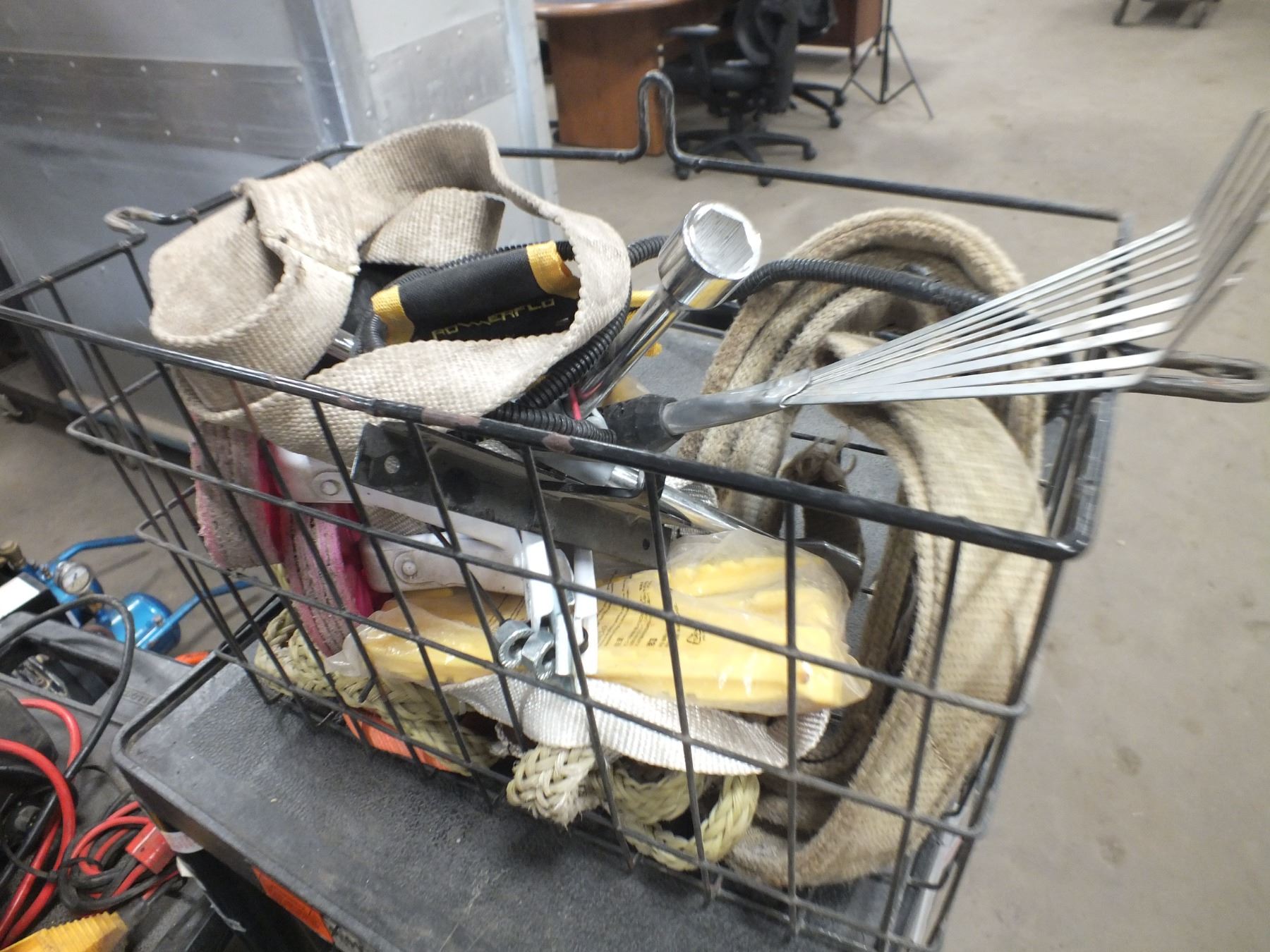 you get a sling, wheel wrench, garden tools, rope, camping pegs and some misc...used