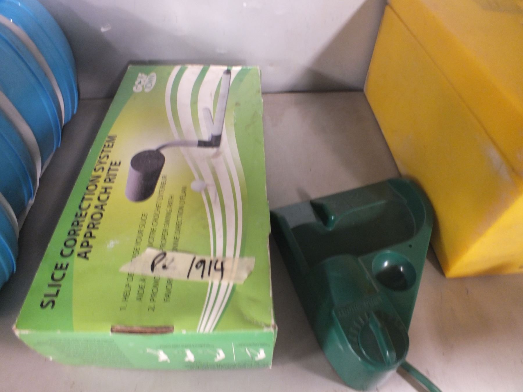 you get putting machine, slice correcting machine, laptop bags, box of misc and a storage box...used