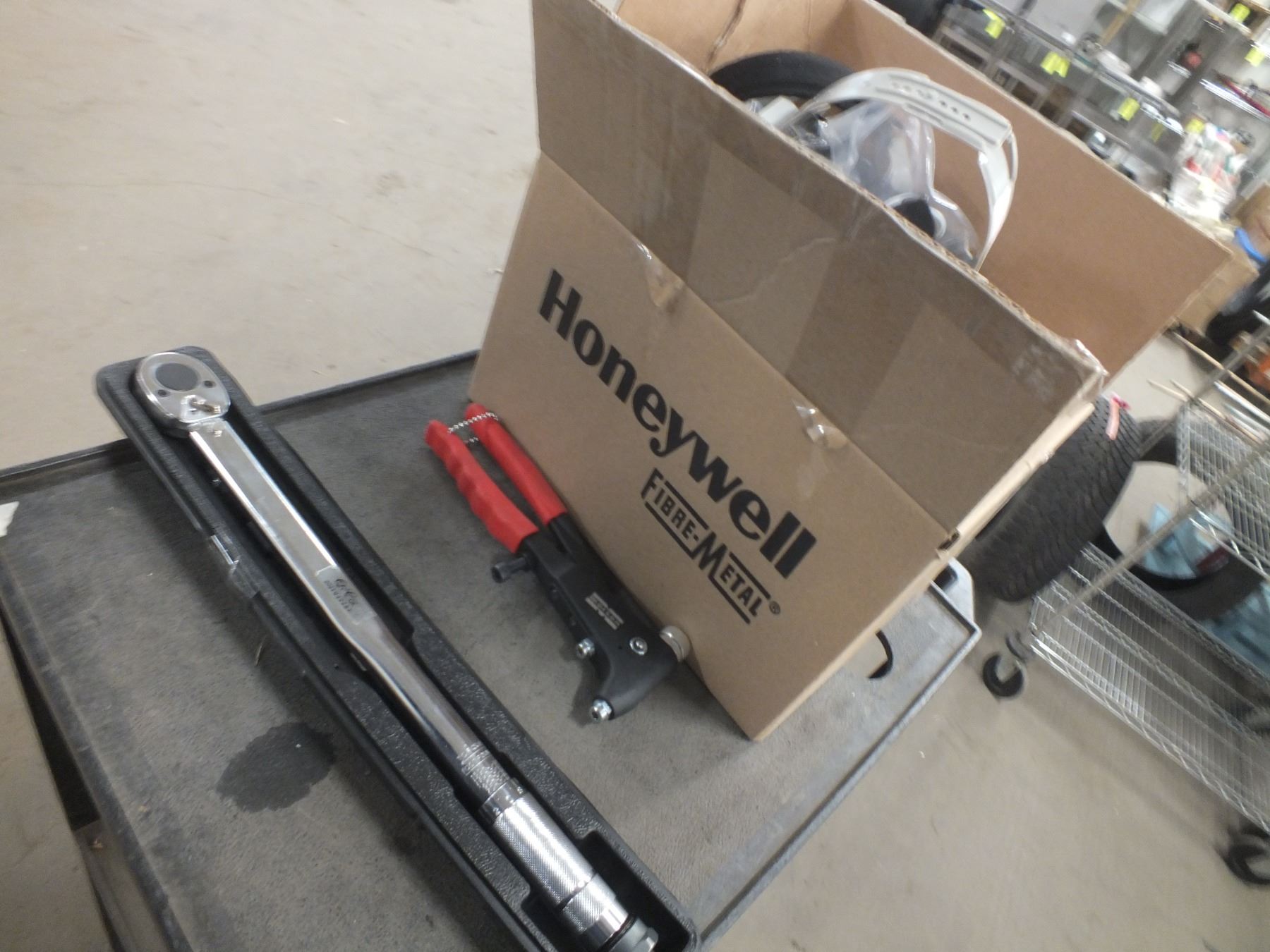 you get riveter, torque wrench, and face shield head gear...store returns...used