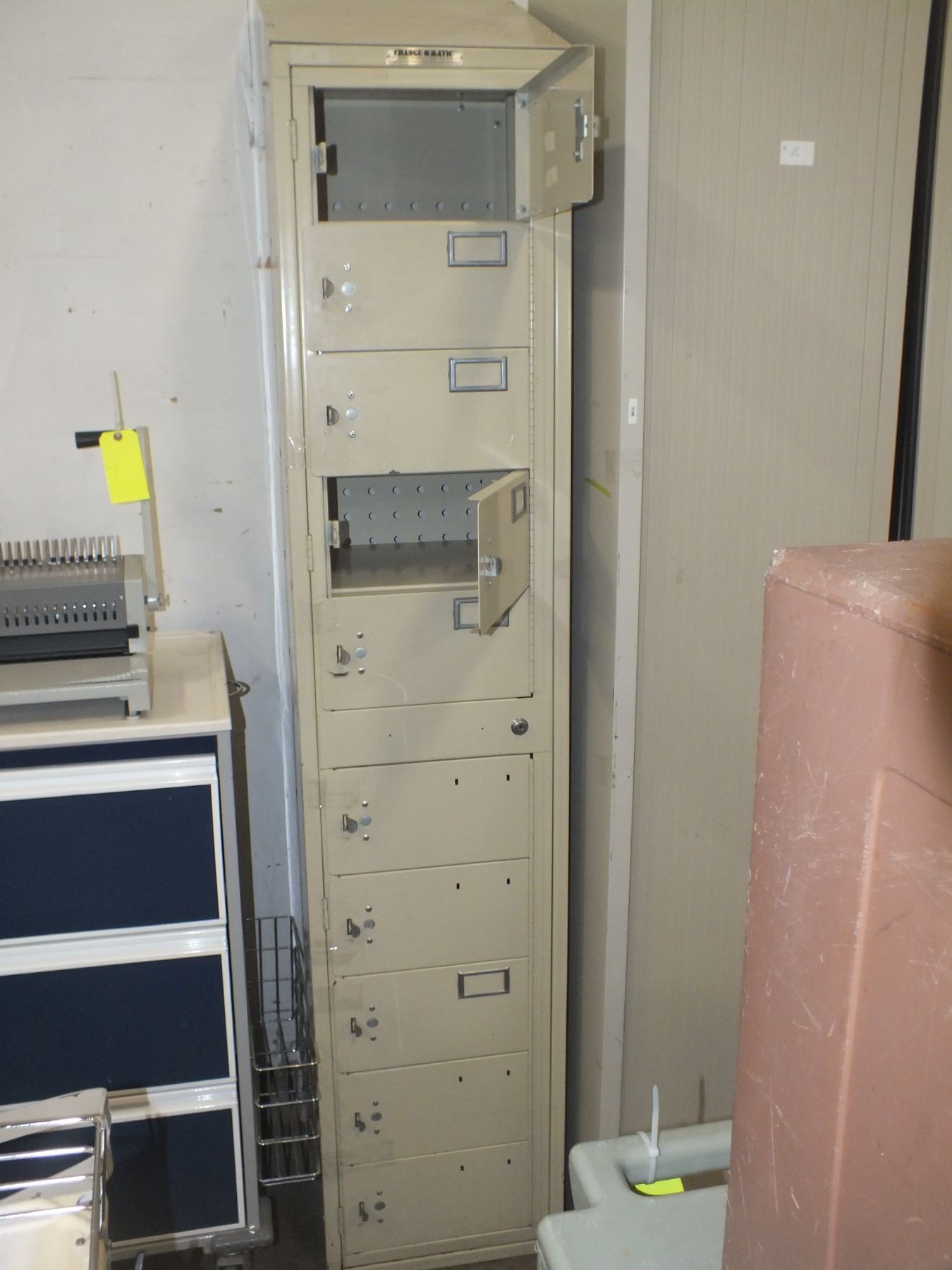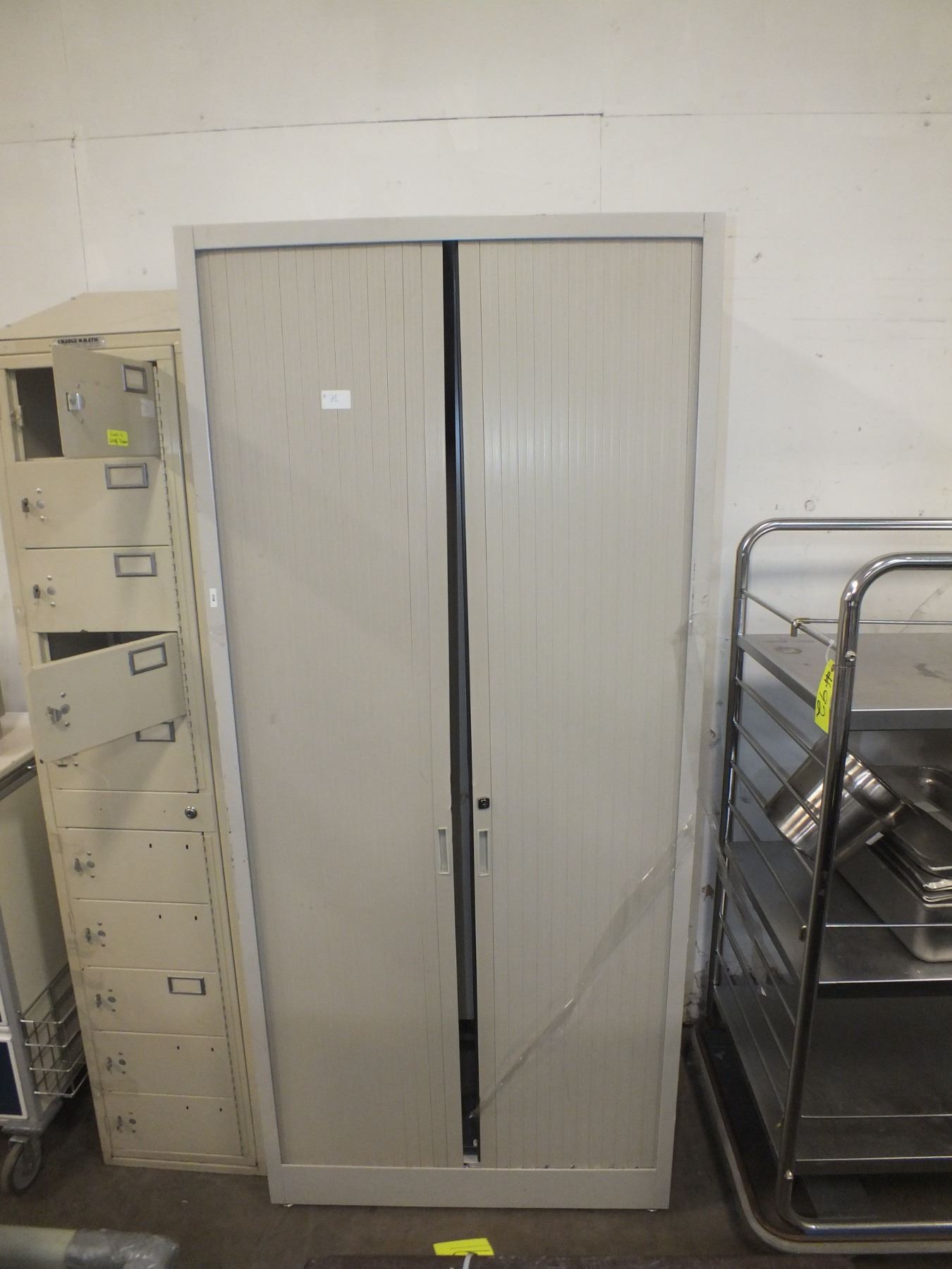 you get 1 bank of lockers, 10 small doors 17"l 16"w 84"h, and 1 roll door storage cabinet...used