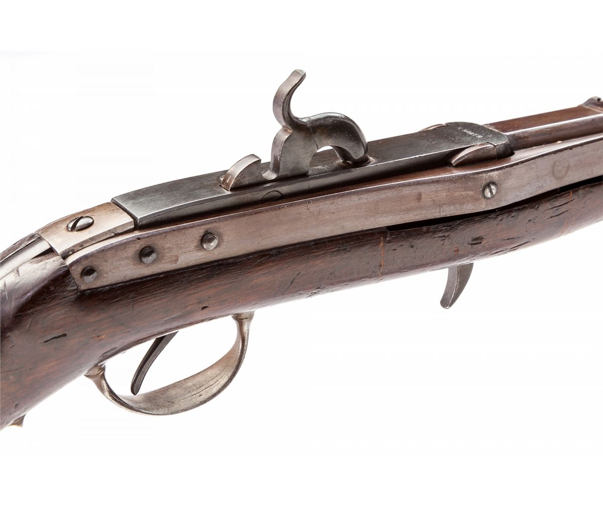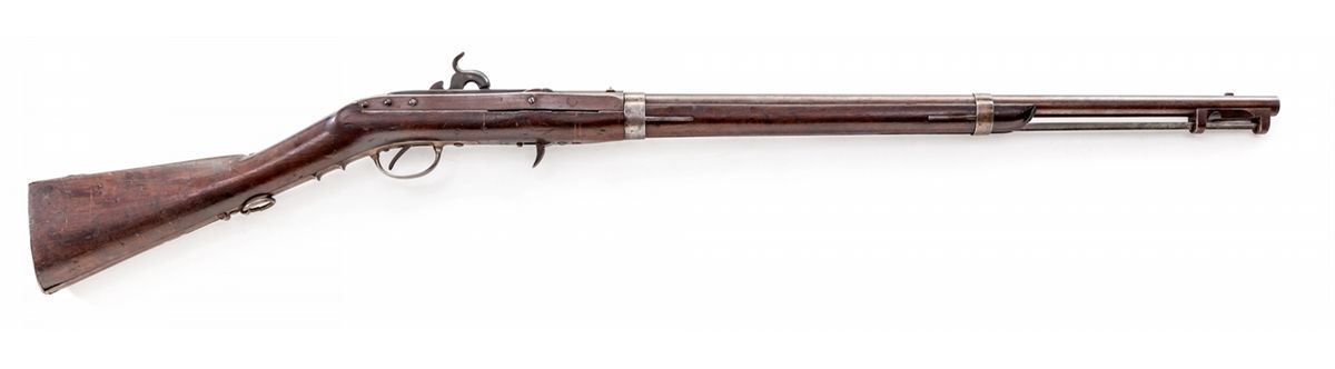 Model 1833 Hall-North U.S. Rifled Breechloading Percussion Carbine, .58 cal., 26-3/16'' barrel, brown lacquer finish, case hardened breech and hammer, walnut stock with accessory compartment on bottom of butt. A scarce variant as breechblock is only marked ''S. North'', with ''NWP'' inspector marks to left side behind rear sight. This exact variant was used by the 2nd U.S. Dragoons during their service in Florida and by the state of Alabama for their city of Mobile's militia unit. Condition is very good. Brown lacquered parts retain approx. 90% lightly thinning finish. Hammer retains 97% vivid case colors; breechblock appears blue. Stock with moderate scuffs, pressure dings, and oil darkening. Action is good, bore is very good. Est.: $3,500-$5,000. (Antique)